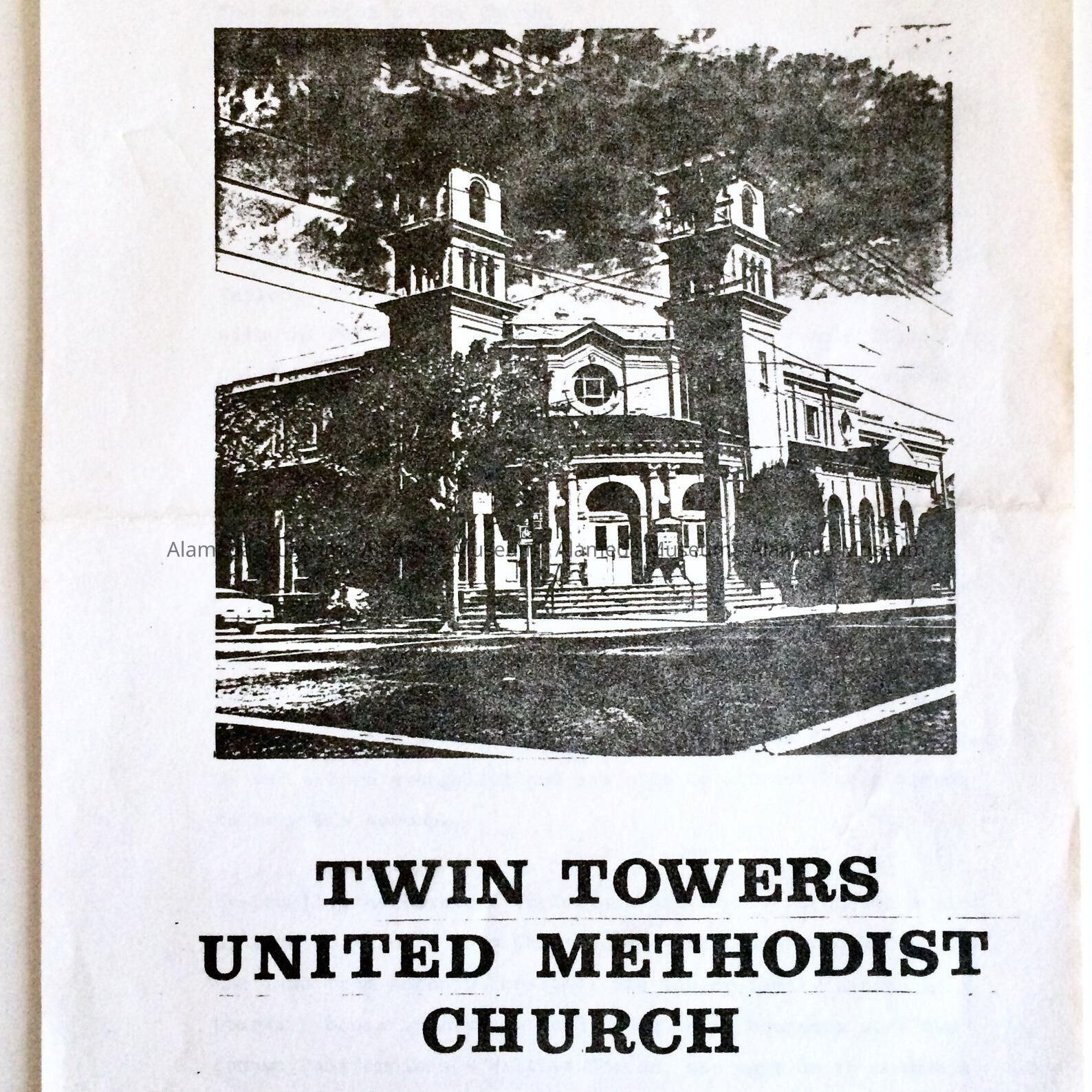 Three (3) page photocopy with illustrated cover page. Cover has reproduced photograph of the church edifice and bold printed caption "Twin Towers United Methodist Church".