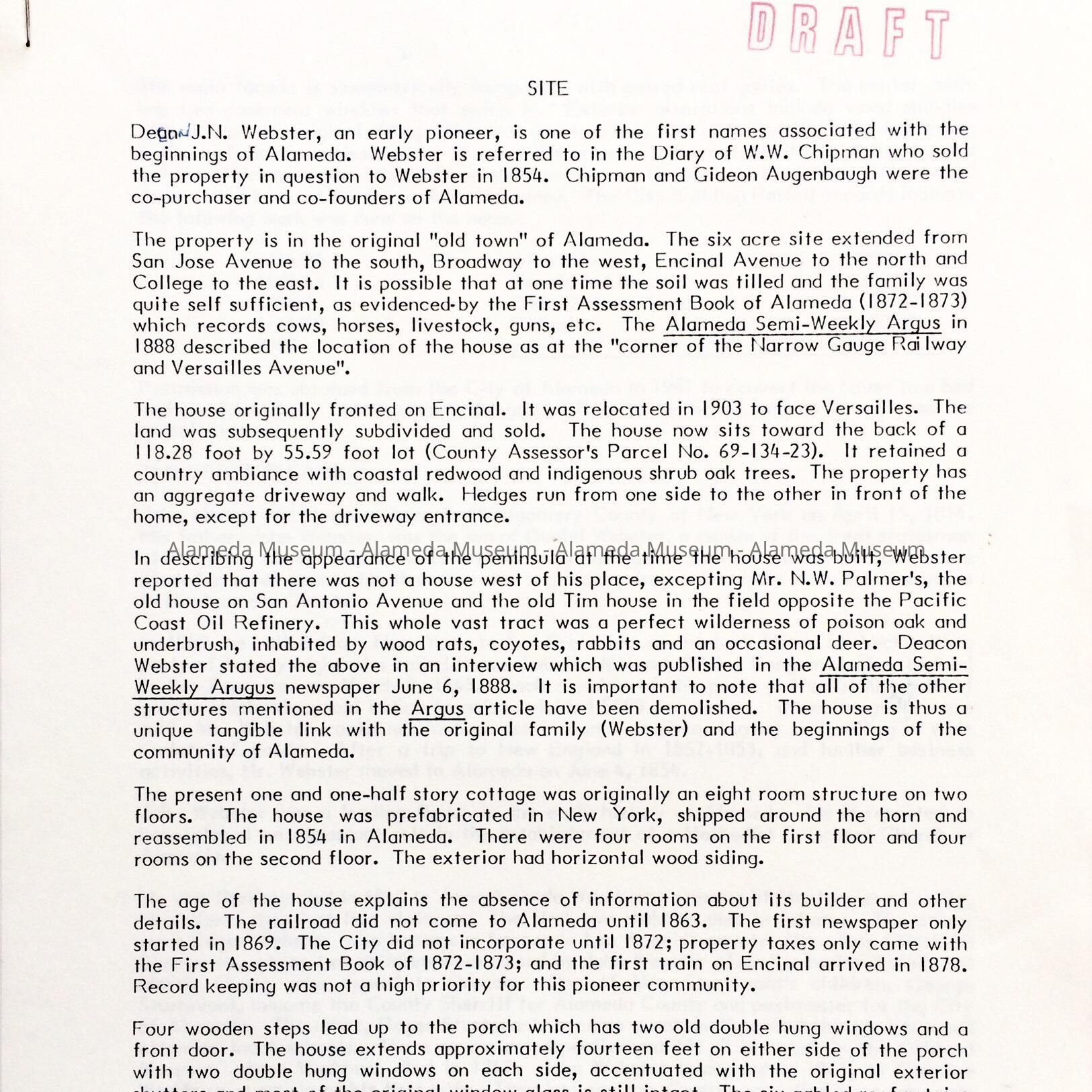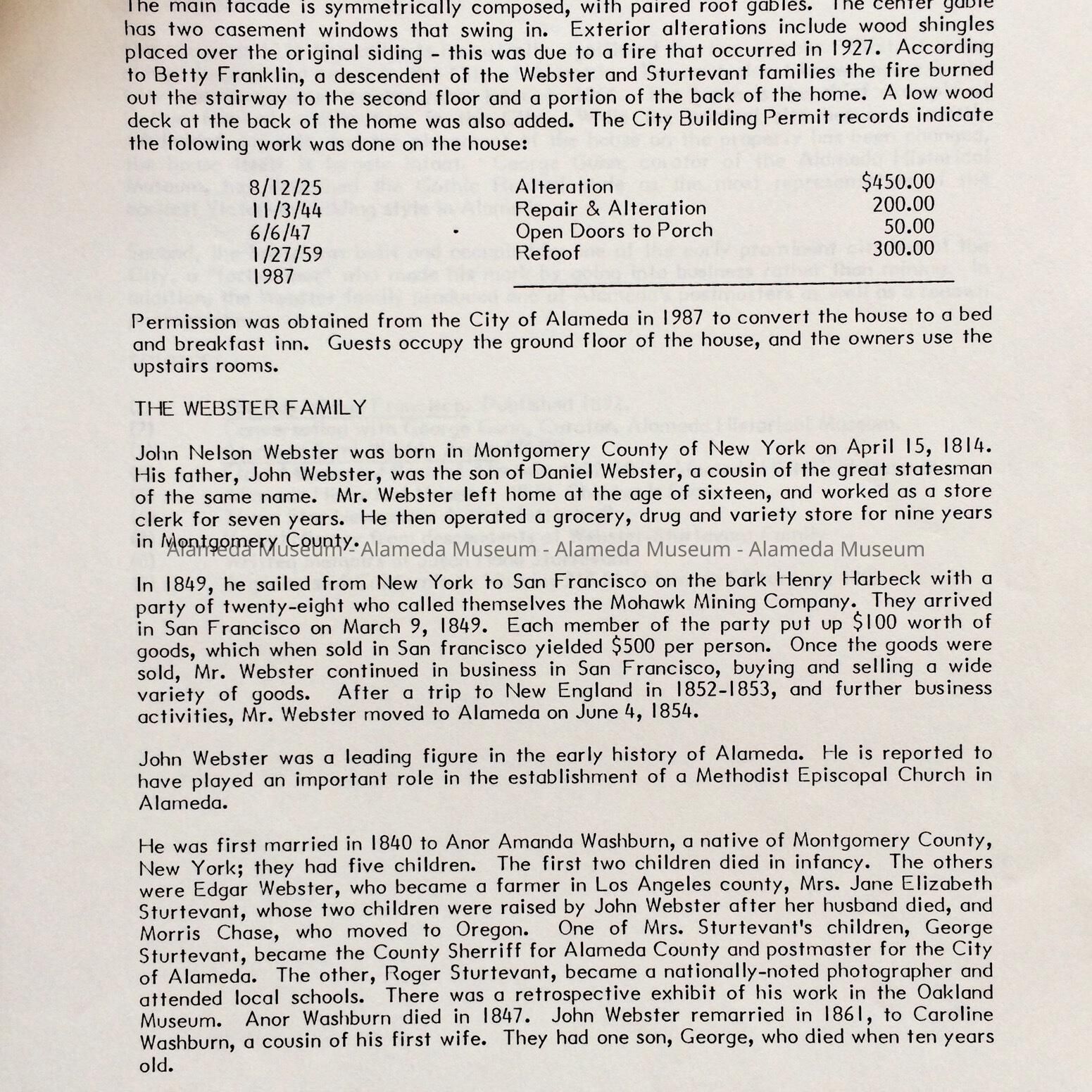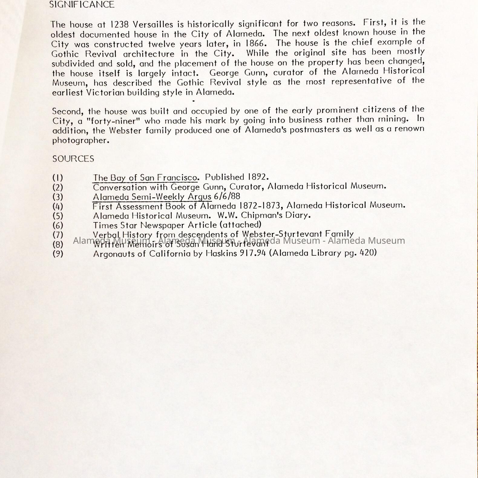 HISTORY OF OBJECT: A REPORT PRESENTING THE HISTORICAL INFORMATION CONCERNING THE WEBSTER HOUSE AT 1238 VERSAILLES AVENUE, ALAMEDA, PURSUANT TO BEING DESIGNATED AS A HISTORICAL MONUMENT.