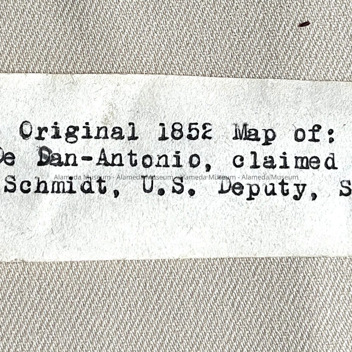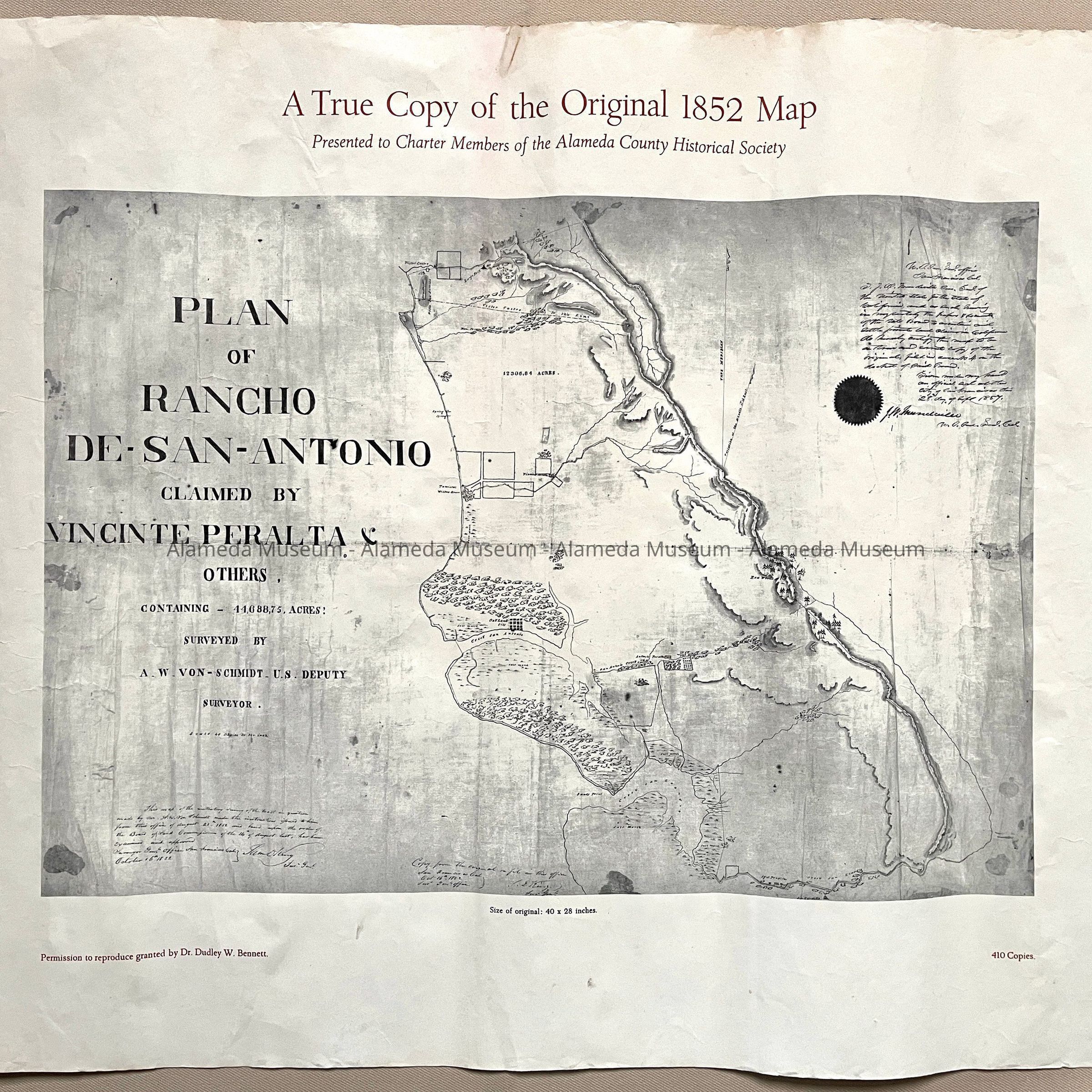 Description: photocopies on off-white paper of a map, titled in red type 'A true Copy of the Original 1852 Map'. The map itself was titled 'Plan of Rancho de San Antonio claimed by Vincinte Peralta & others, Surveyed by A.W. Von Schmidt - U.S. Deputy Surveyor.' Underneath is printed, also in red, for A: 'permission to reproduce granted by Dr. Dudley W. Bennett' and '410 Copies'. B. Is a copy of the same map, but has additional text in red on the left bottom; ‘Presented by the Alameda County Historical Society’ and at right bottom: ‘500 copies 1993’.