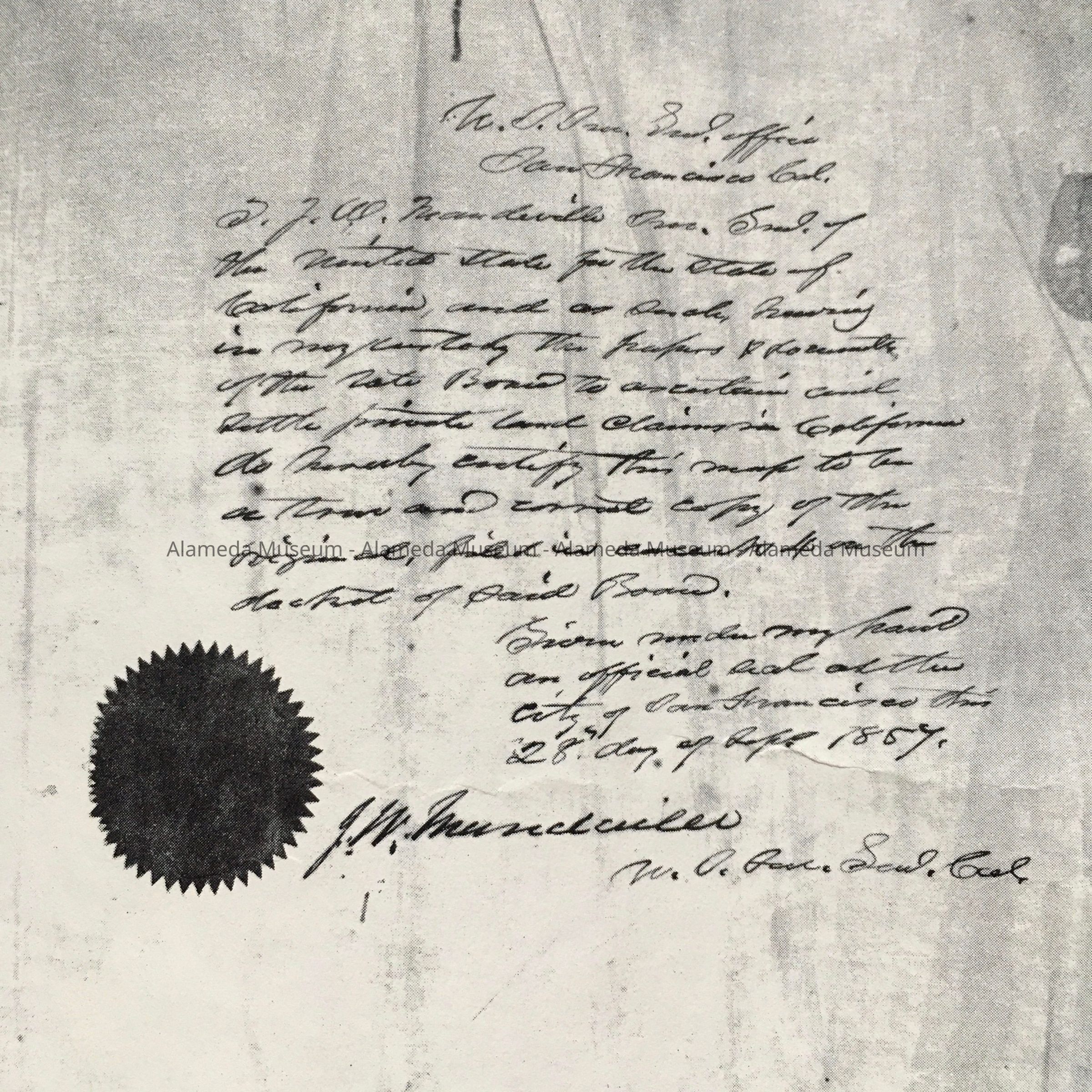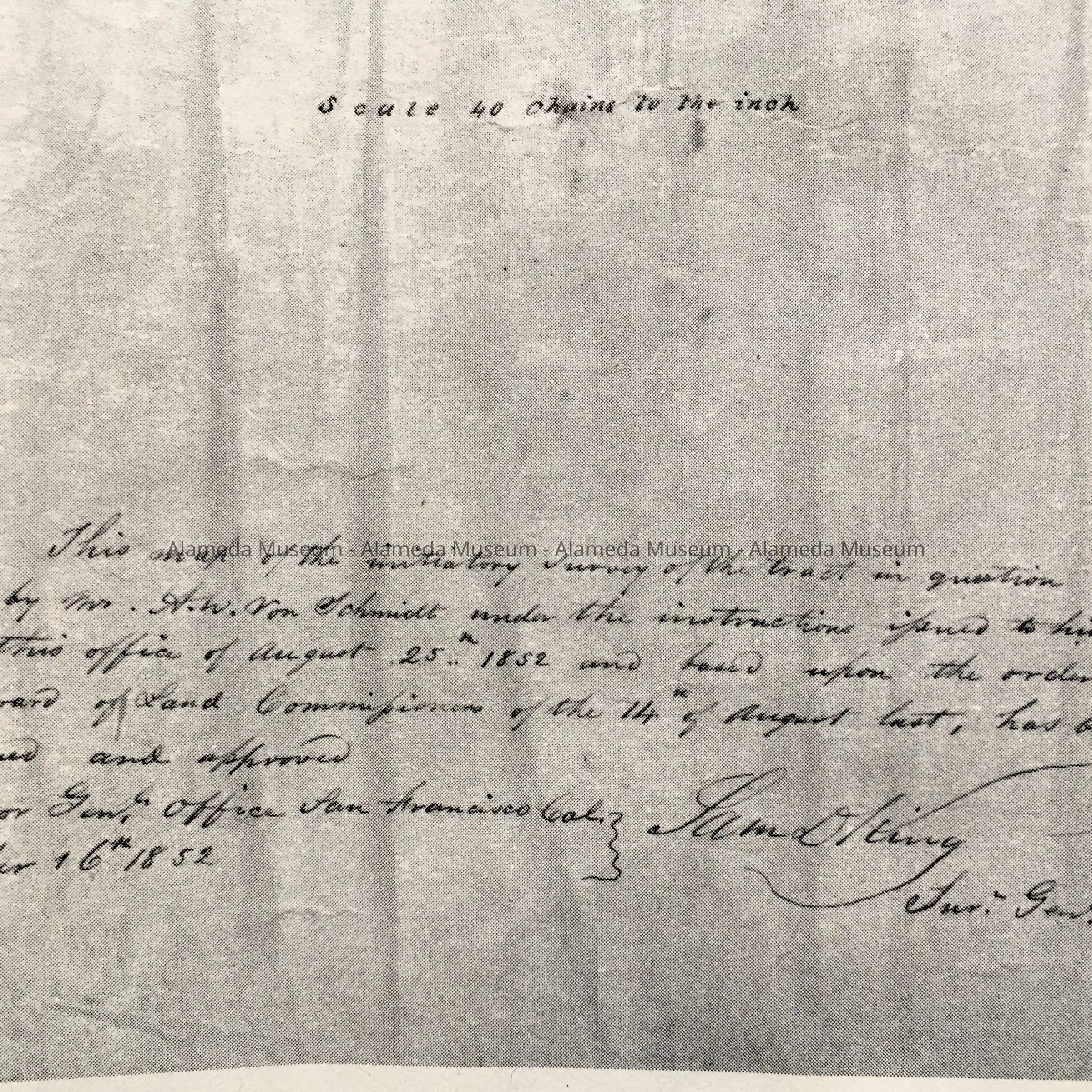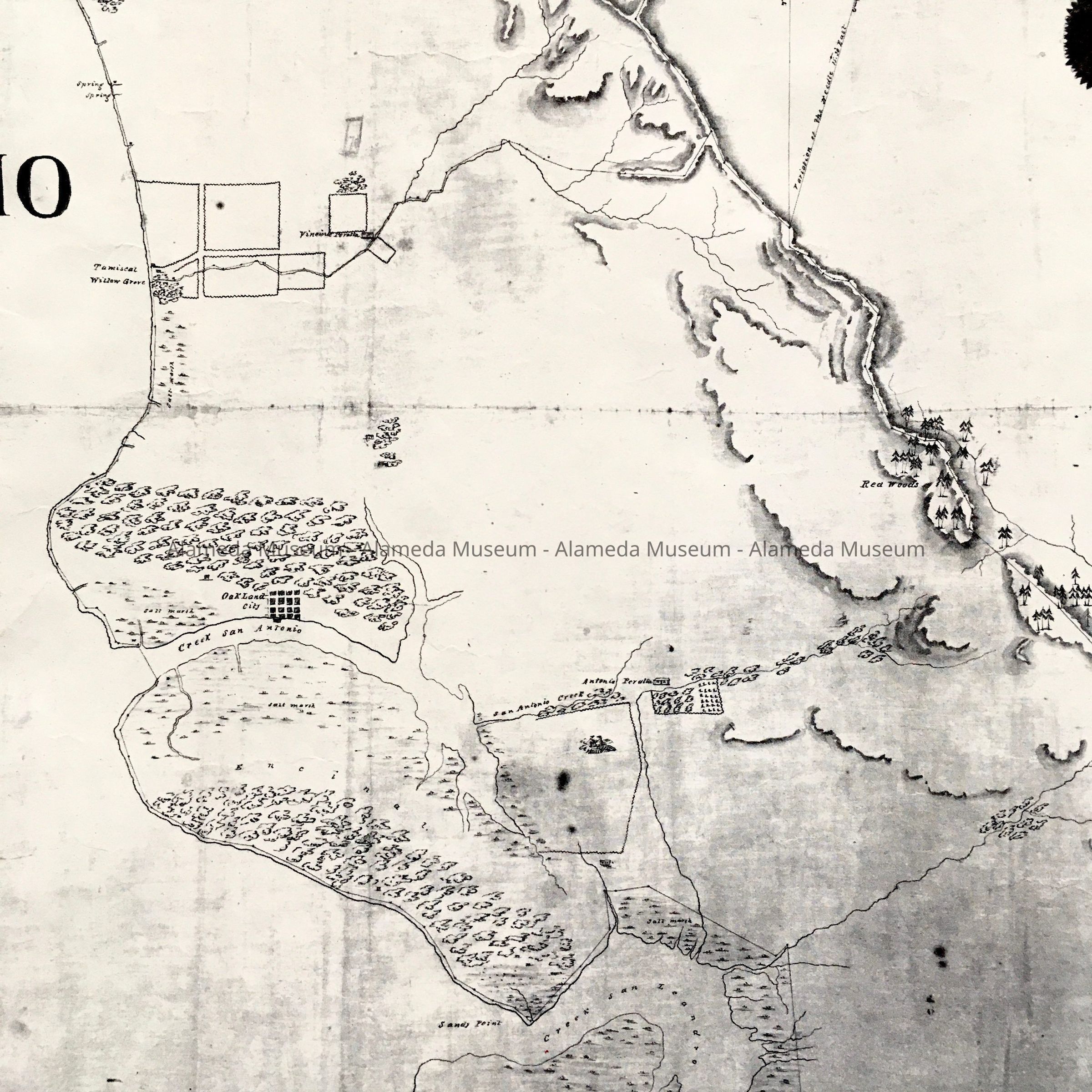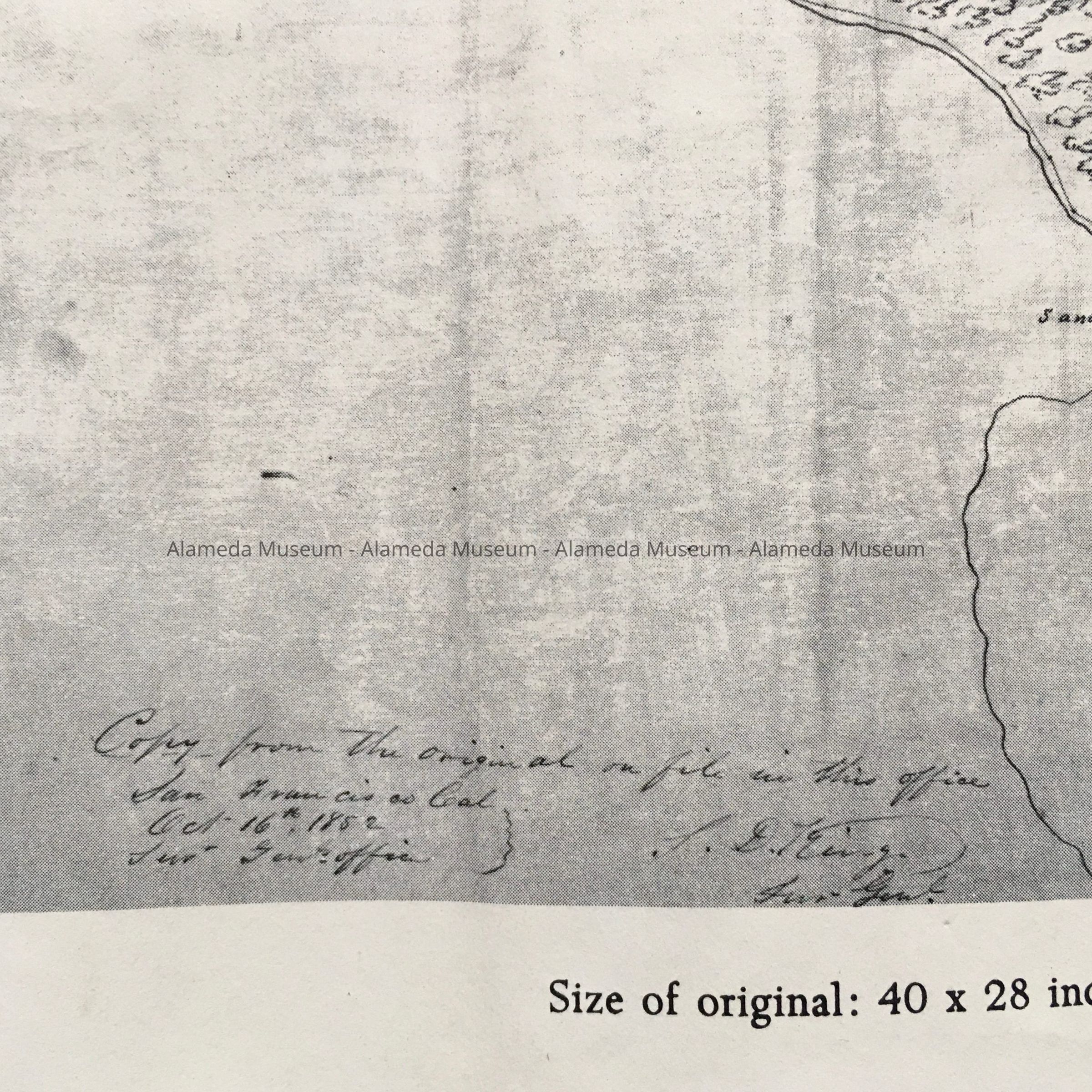 History of object: photocopies found among uncataloged maps. The original photocopy was presented to Charter Members of the Alameda County Historical Society. This society was founded in 1966, the copy may date from that time. B. Is from another reprint from 1993. The early map of the Rancho San Antonio shows a grid for Oakland City, Alameda as mostly marshland with a sandy ridge of oaks, and location of Antonio Peralta's ranch.