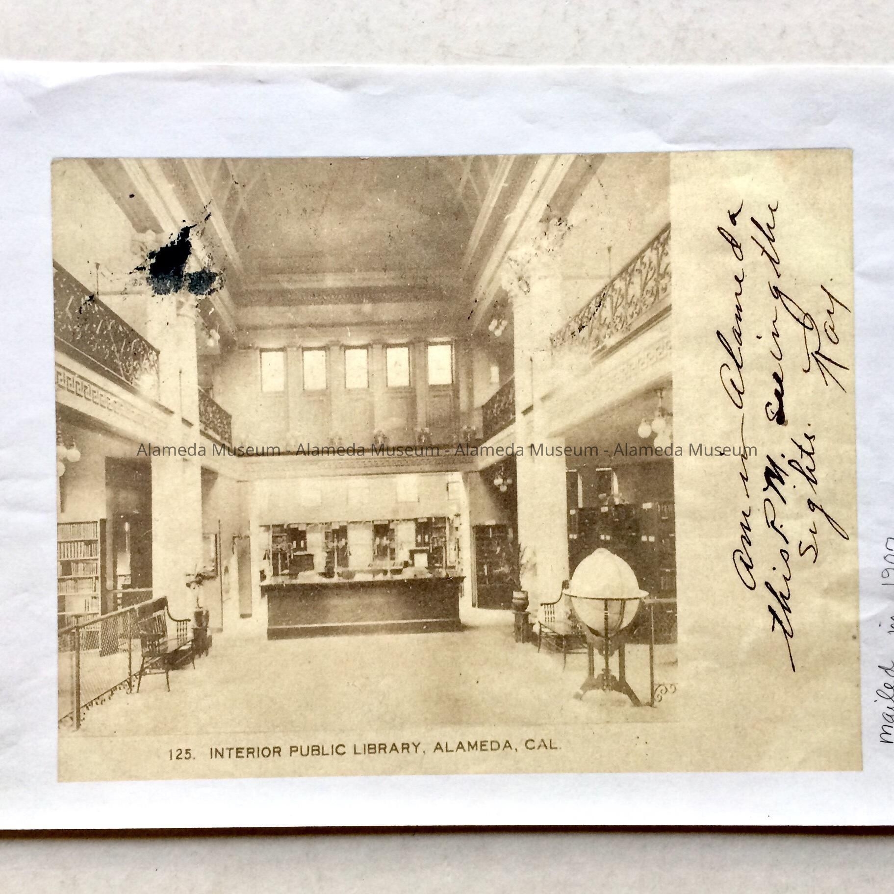HISTORY OF OBJECT: A PHOTOCOPY OF A 1907 POSTCARD DEPICTING THE INTERIOR OF THE ALAMEDA FREE LIBRARY. THE MOST IMPORTANT ASPECT OF THE IMAGE IS THE WORLD GLOBE AND BASE, BOTH OF WHICH ARE PRESENTLY IN THE COLLECTION OF THE ALAMEDA HISTORICAL MUSEUM.