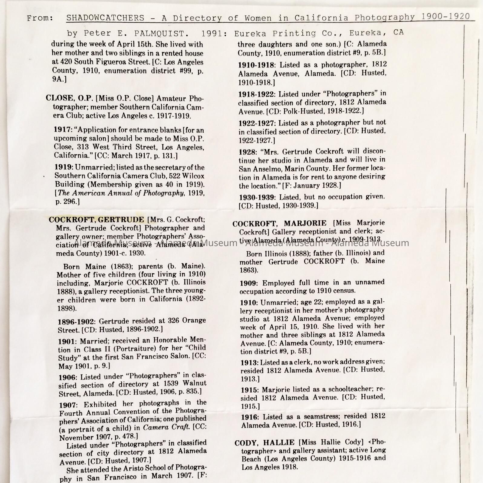 BIOGRAPHICAL INFORMATION CONCERNING GERTRUDE COCKROFT, FEMALE PHOTOGRAPHER AND GALLERY OWNER. ACTIVE IN ALAMEDA FROM 1901 THRU CIRCA 1930, MRS COCKROFT'S WORK IS REPRESENTED IN THE ALAMEDA MUSEUM COLLECTION.