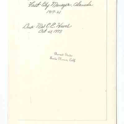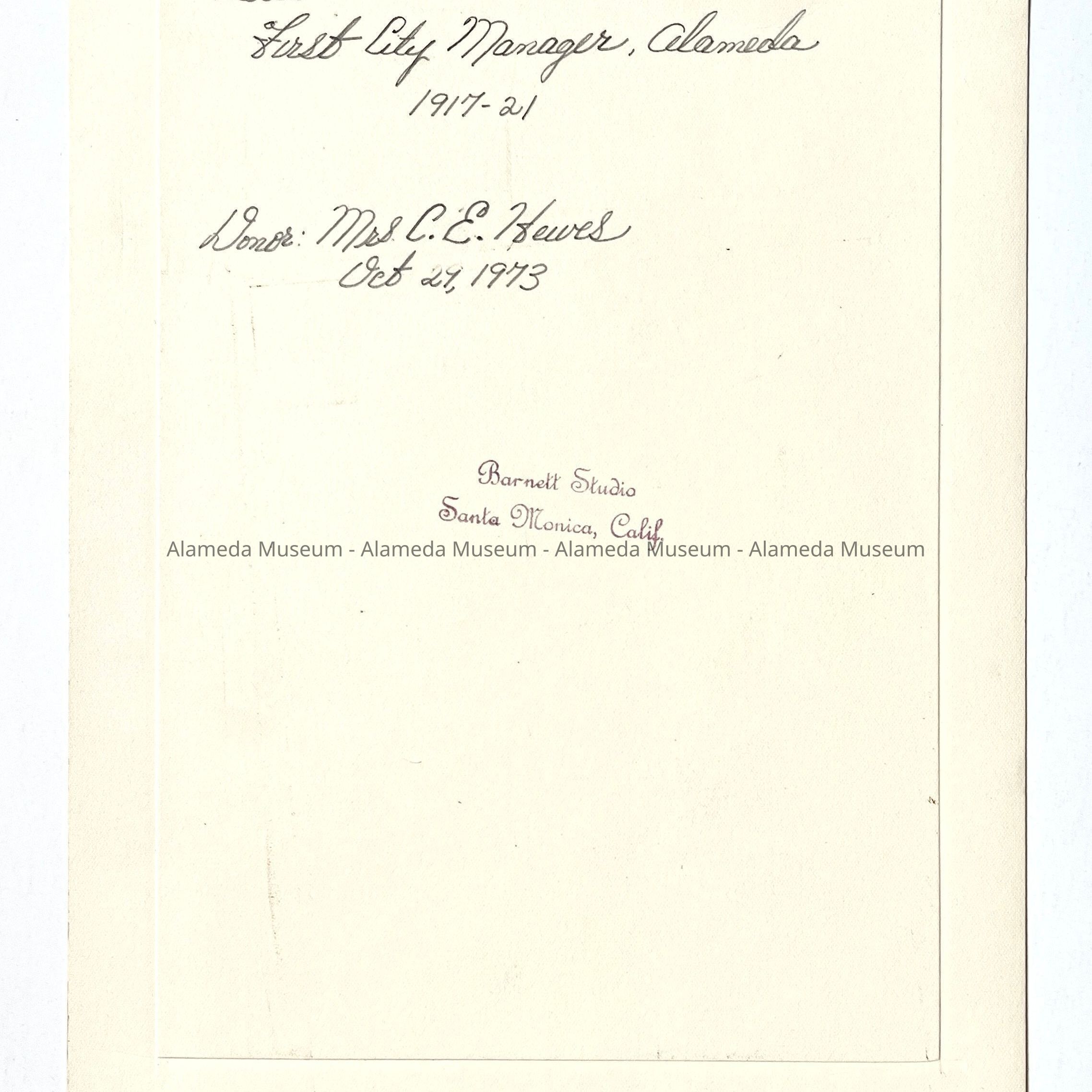 HISTORY OF OBJECT: PHOTO PORTRAIT OF CHARLES E. HEWES, FIRST CITY MANAGER, ALAMEDA 1917-21.