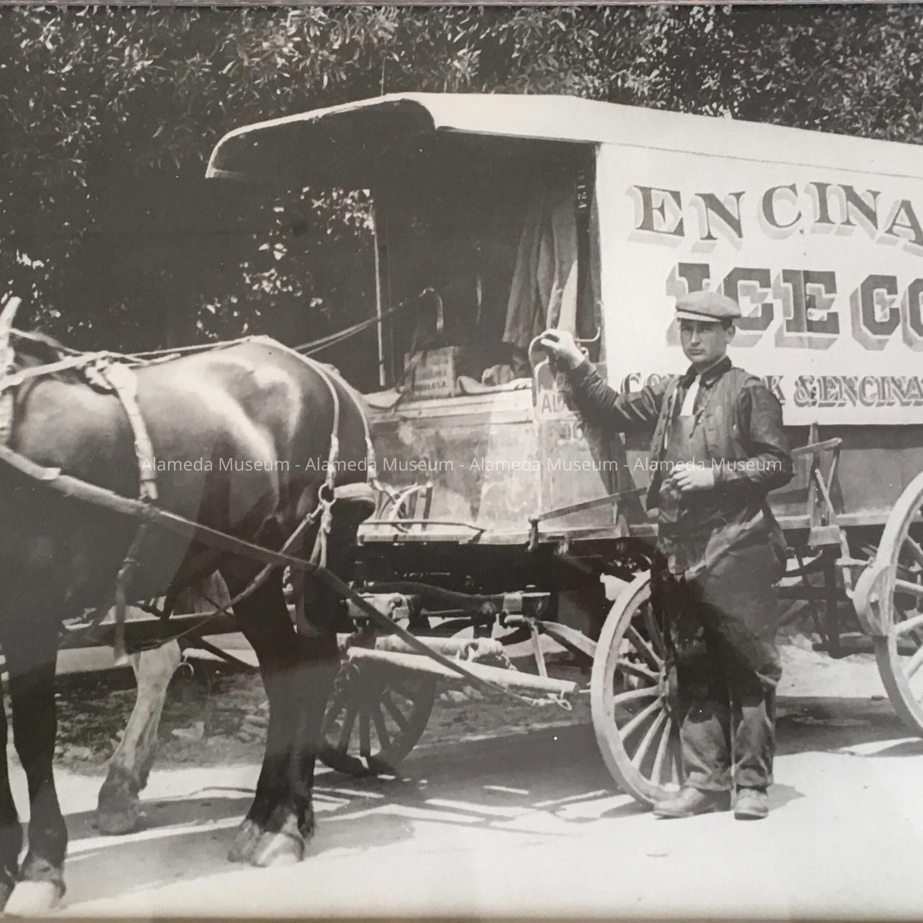 Photograph in frame of Encinal Ice Co. Horse-Drawn Wagon and Hartwig Swanson 1907Entry/Object ID