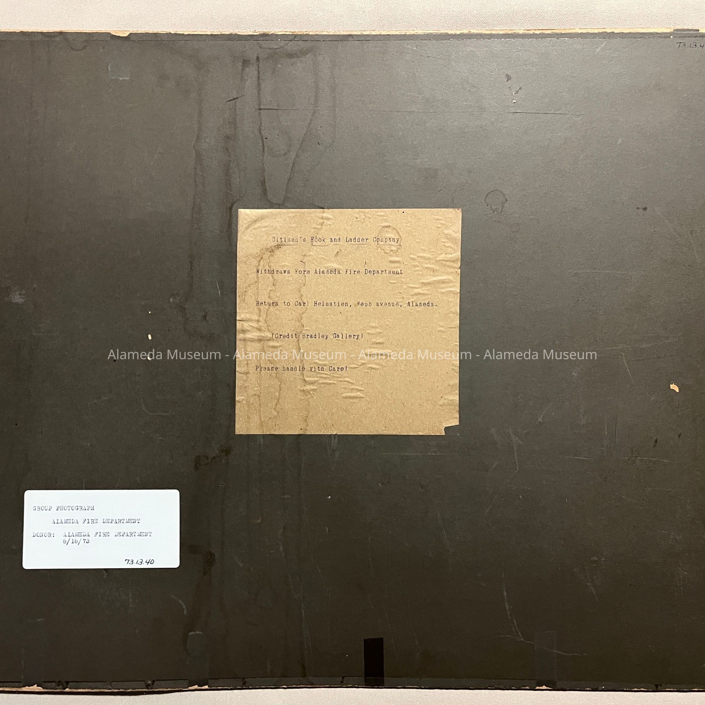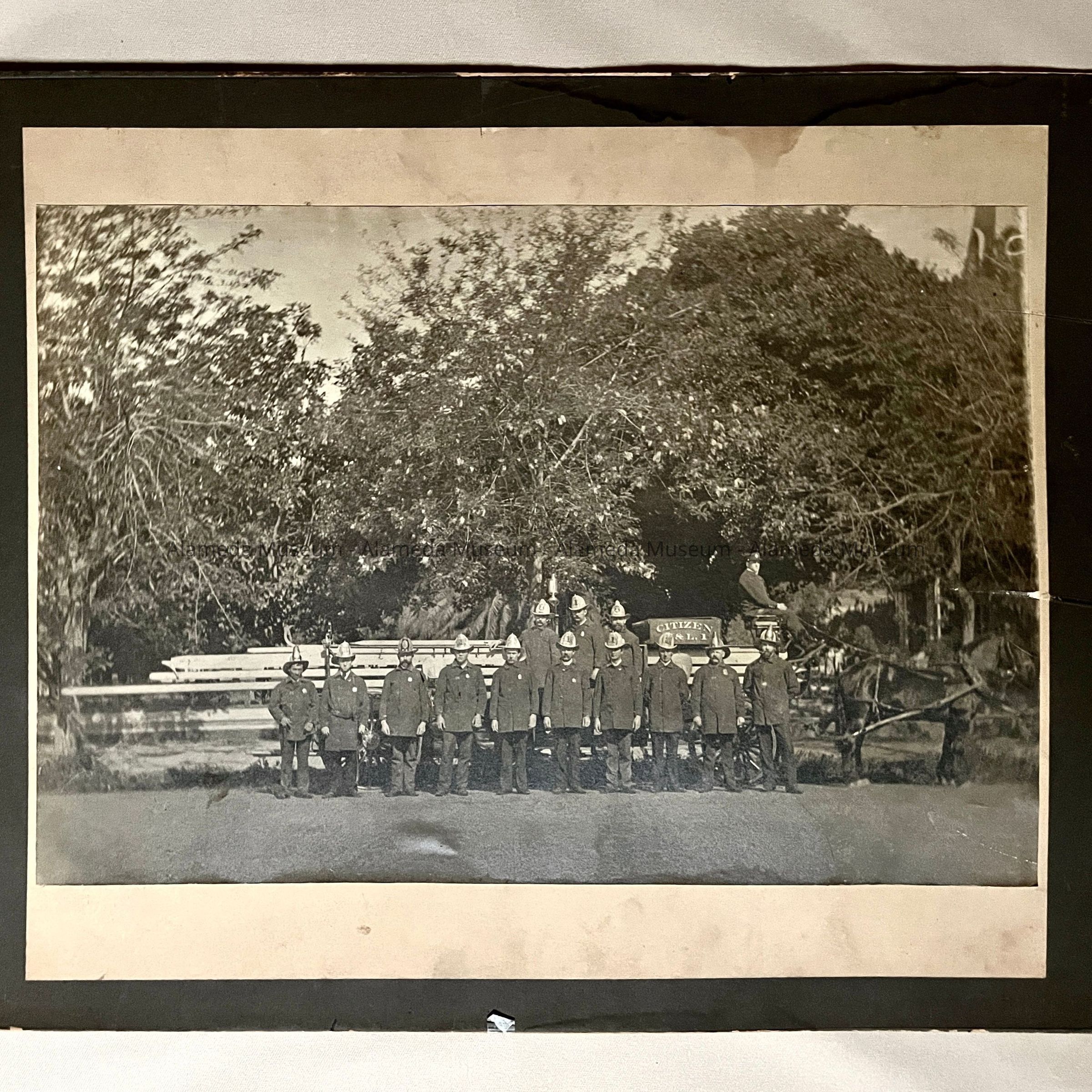 HISTORY OF OBJECT: PHOTOGRAPH OF CITIZEN HOOK AND LADDER TRUCK #1., & GROUP OF 14 MEMBERS. WAGON DRAWN BY BLACK HORSE.