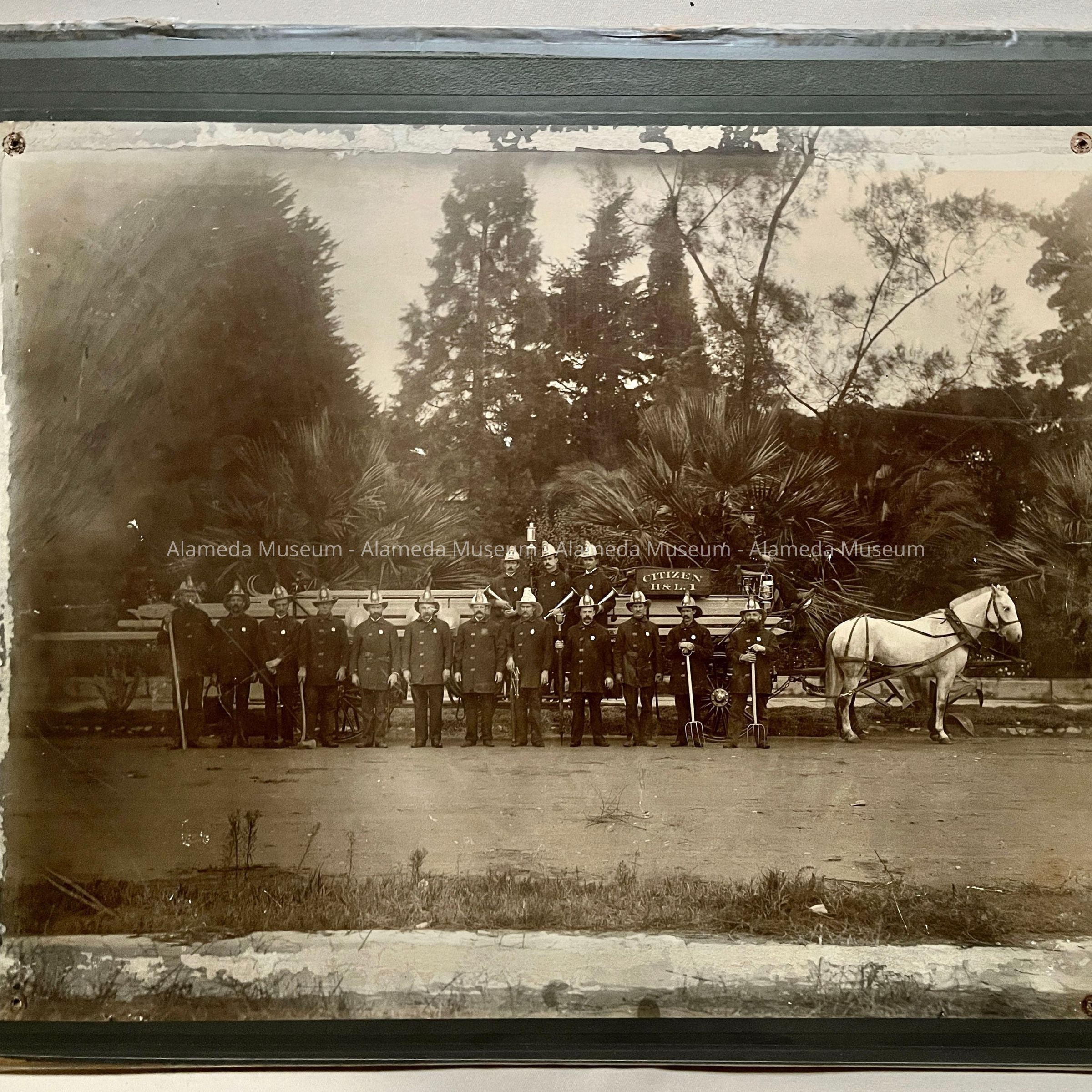 GROUP PHOTOGRAPH OF 16 MEMBERS. HORSE DRAWN LADDER TRUCK. THREE MEMBERS CARRYING SPEAKING HORNS.