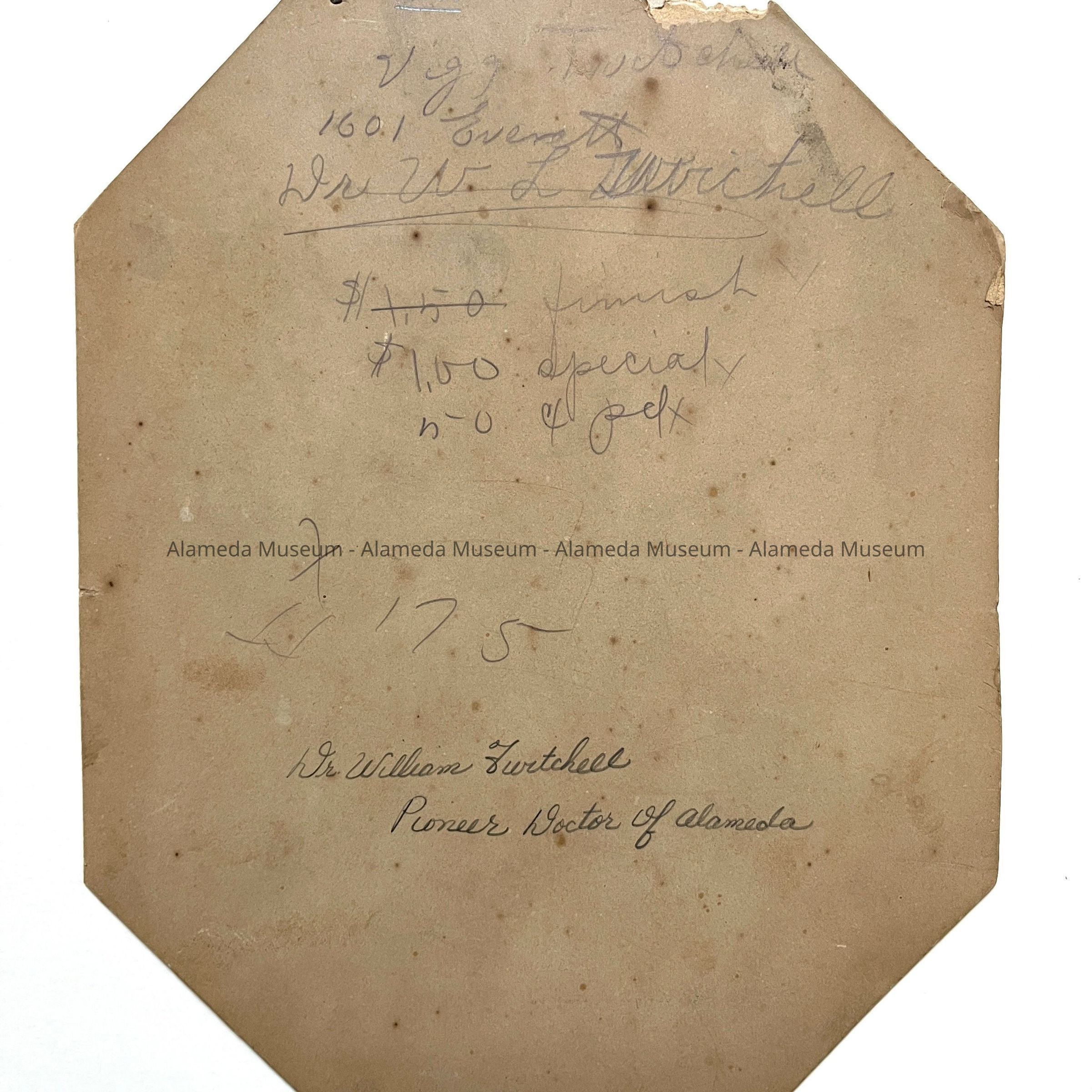 HISTORY OF OBJECT: PORTRAIT OF DR. WILLIAM TWICHELL, PIONEER DOCTOR OF ALAMEDA. HIS HOME WAS LOCATED ON THE NORTH WEST CORNER OF LINCOLN AND EVERETT STREET, ALAMEDA, (1601 EVERETT )