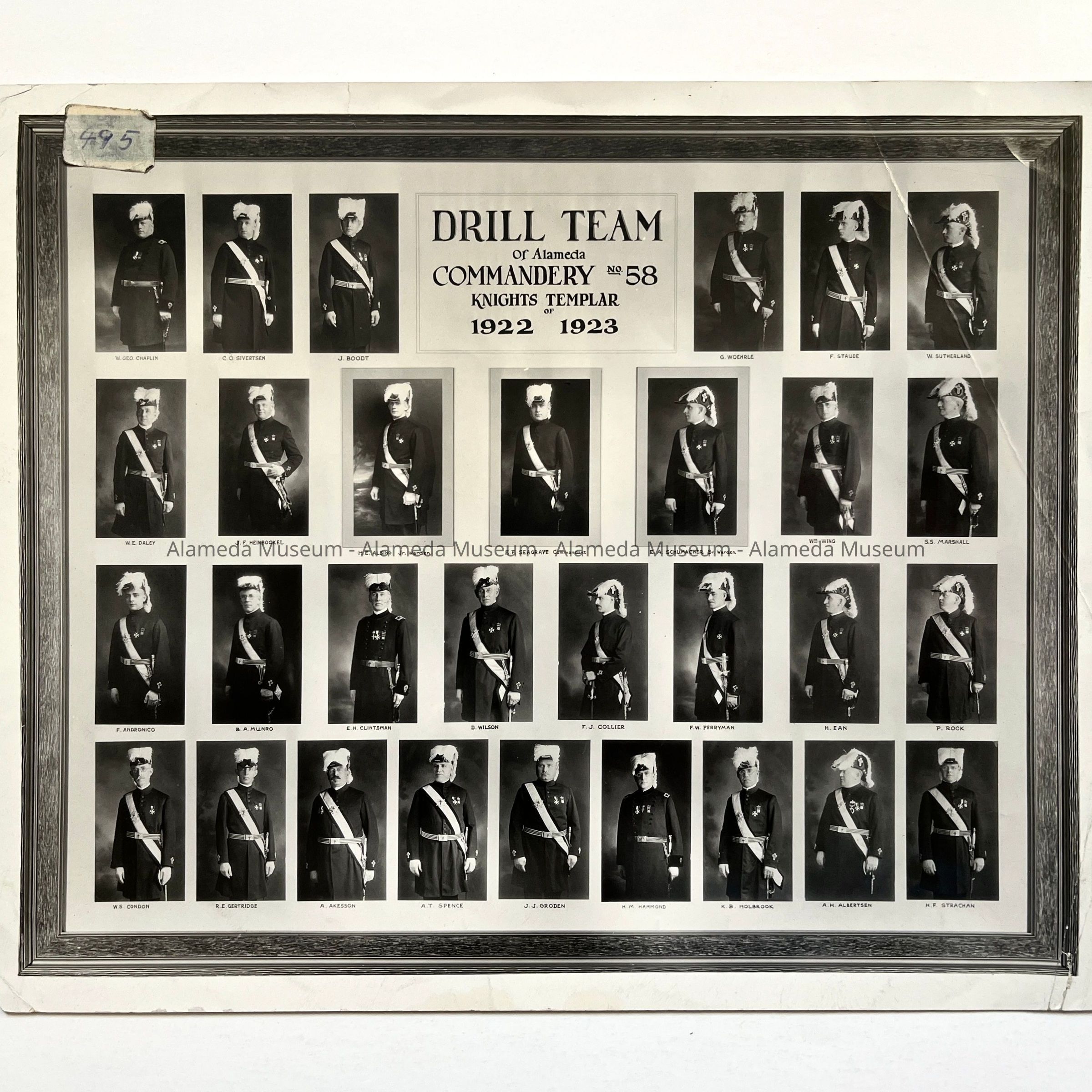 History of Object: Photograph of a framed group of photo portraits of members Of the Drill Team of the Alameda Conmandery #58, Knights Templar, for 1922 and 1923.