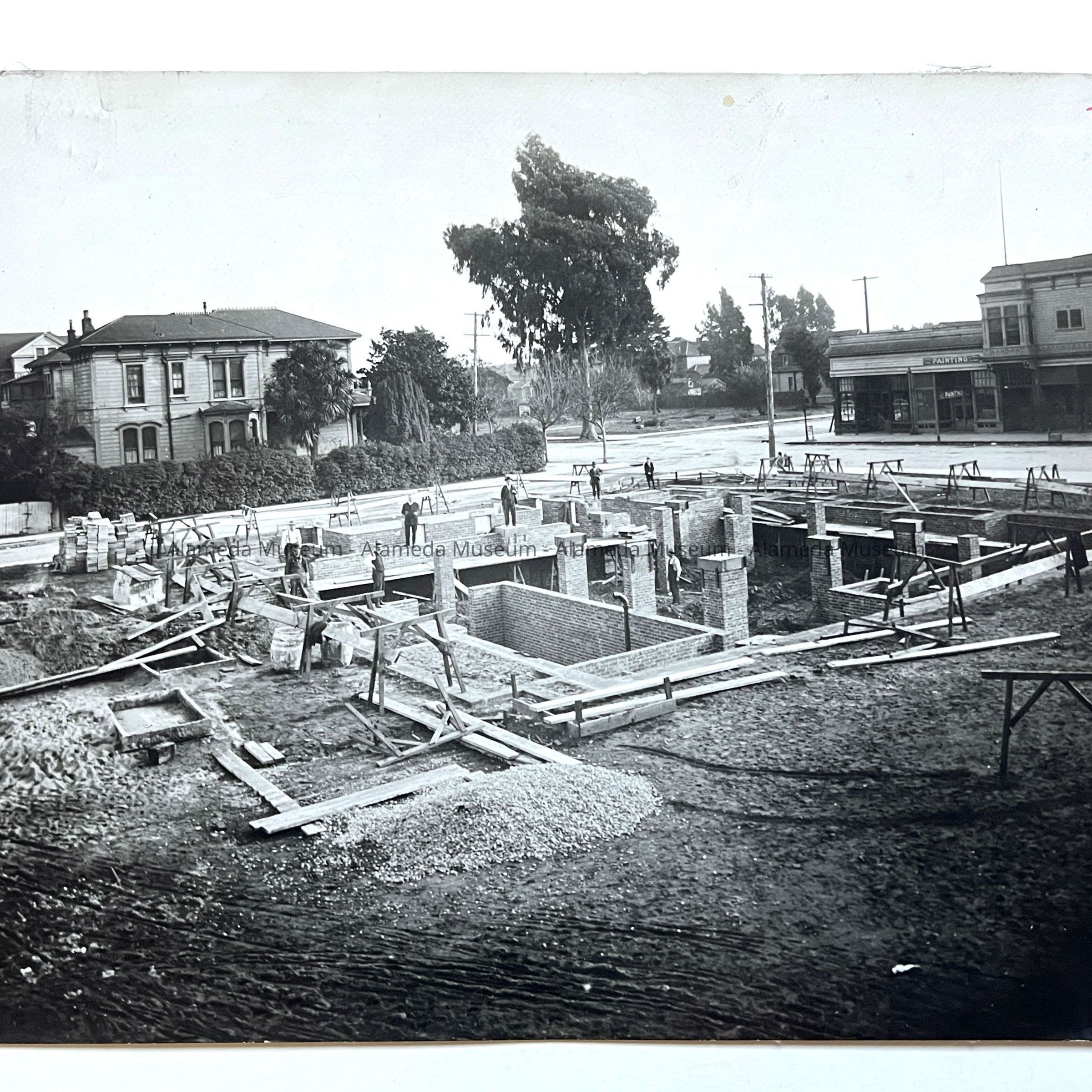 THIS PARTICULAR PHOTOGRAPH ILLUSTRATES THE MEN WORKING ON THE FOUNDATION. THE TAYLOR EUCALYPTUS CAN BE SEEN IN THE CENTER OF THE PHOTOGRAPH, SOUTH EAST CORNER CENTRAL AVENUE AND PARK AVENUE.