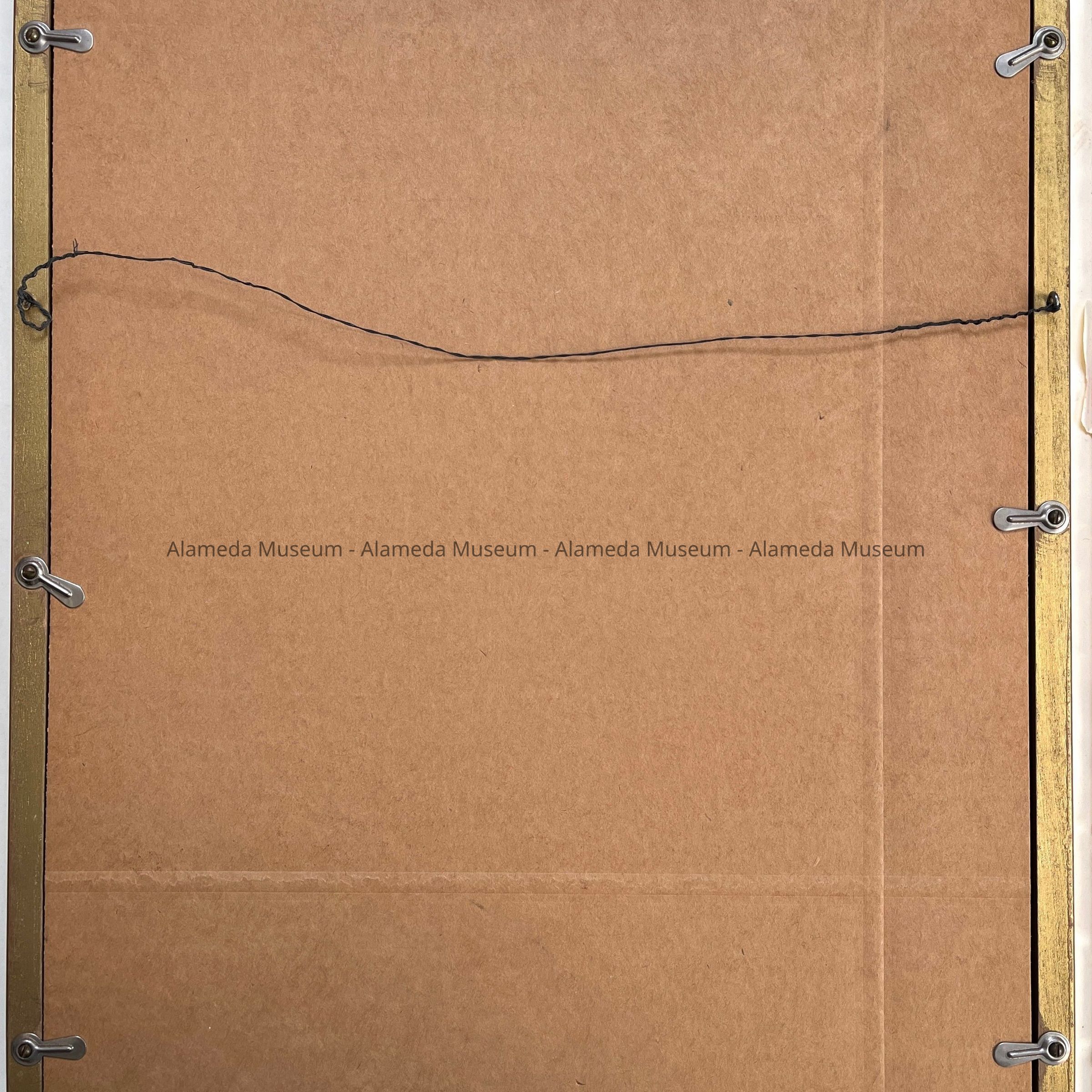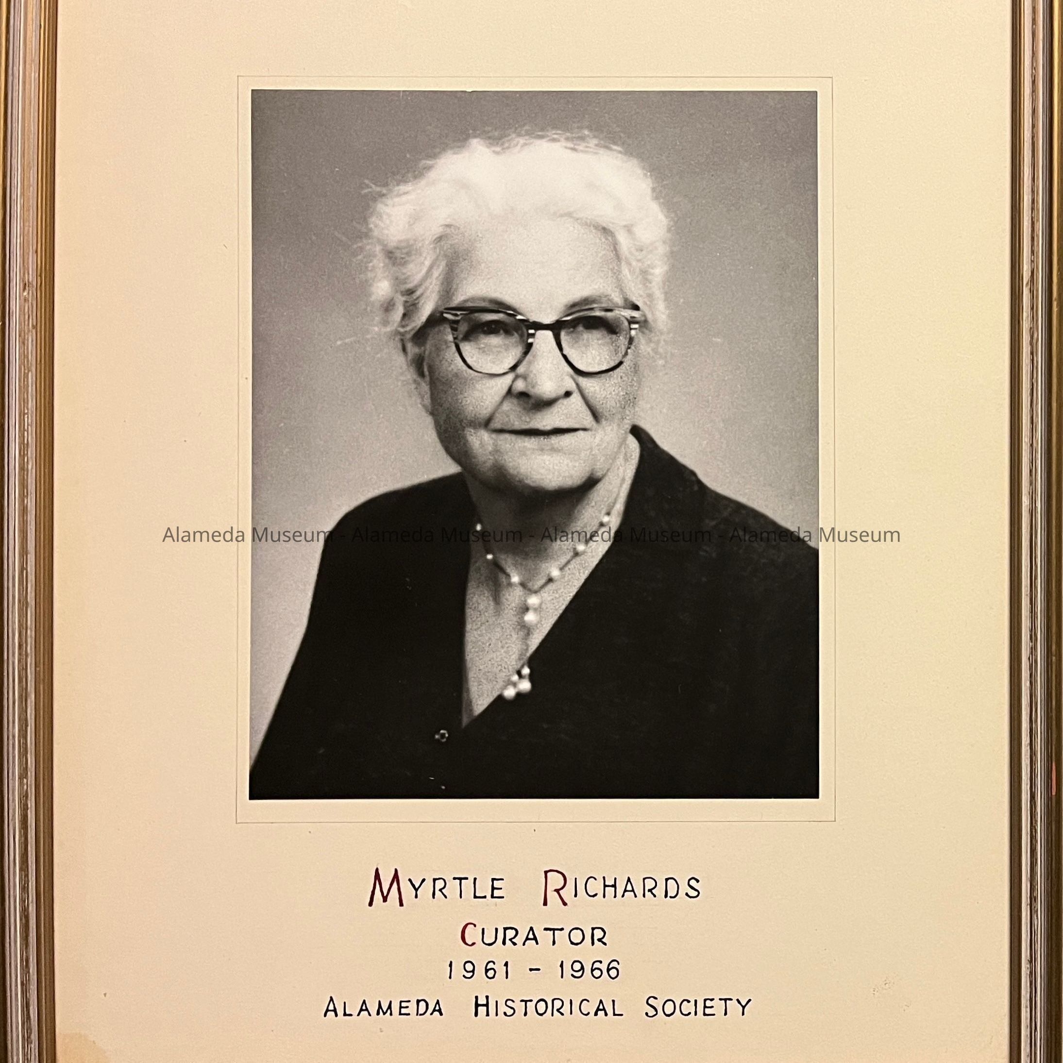 DESCRIPTION: BLACK-AND-WHITE PHOTOGRAPH, WITH OFF-WHITE-COLORED MATTE. MATTE HAS HANDWRITTEN CAPTION IN RED-AND BLACK-COLORED TYPE, "MYRTLE RICHARDS, CURATOR, ALAMEDA HISTORICAL SOCIETY, 1961-66." PHOTOGRAPH UNDER GLASS IS IN AN ANTIQUE GOLD COLORED FRAME.