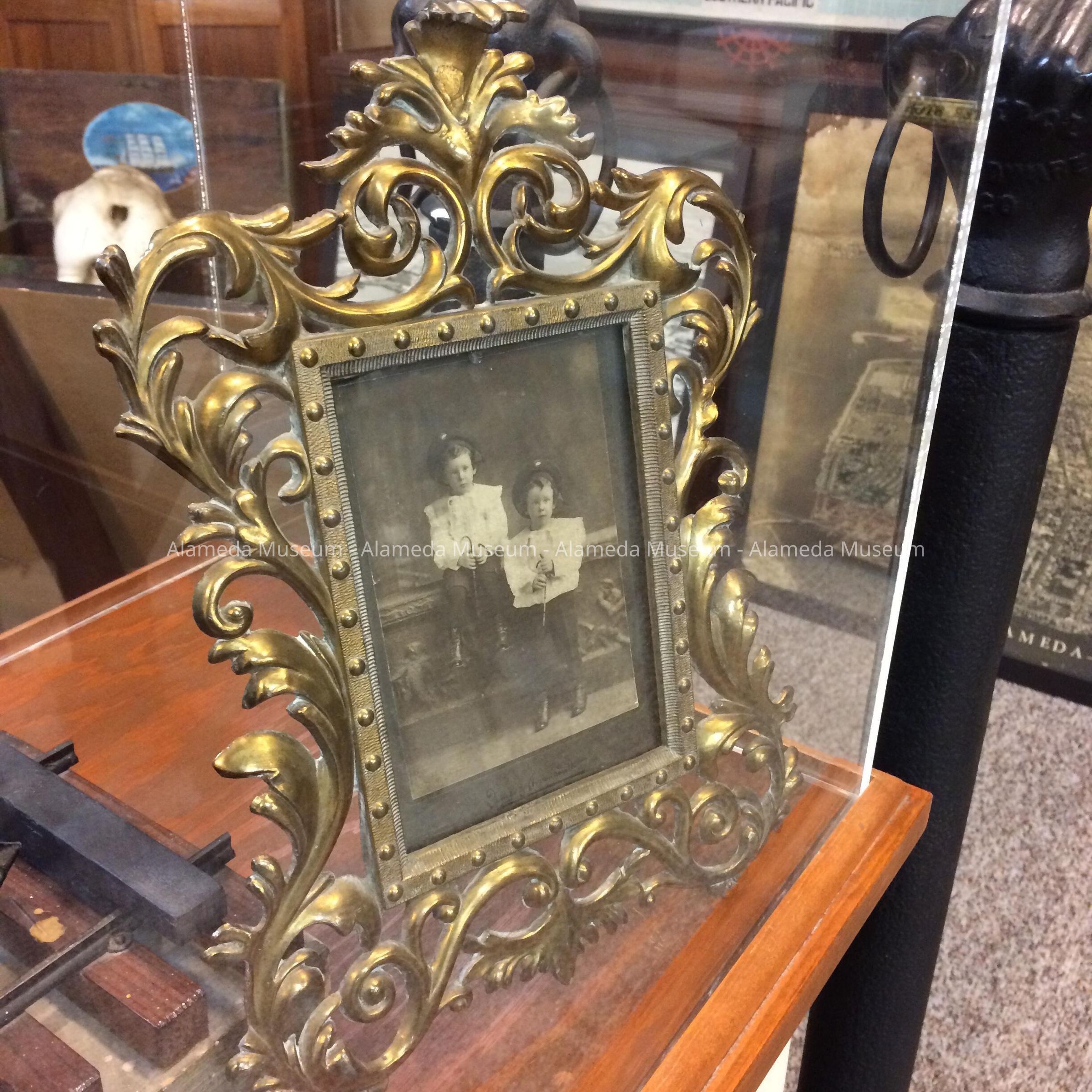 HISTORY OF OBJECT: THIS IS A PHOTOGRAPH OF THE TWIN SONS OF MR. GEORGE WULZEN. THE TWINS WERE BORN IN 1899. IT WAS IN THEIR HONOR THAT MR. WULZEN BUILT THE MODEL TRAIN, A REPLICA OF THE NARROW GAUGE RAILROAD ENGINE THAT RAN ON ENCINAL AVENUE, FROM ALAMEDA TO SANTA CRUZ. THE TRAIN WAS DONATED TO THE HISTORICAL SOCIETY BY WILLIAM AND MARGARET BENNETT OF DIAMOND SPRING, CALIF. MARGARET IS THE DAUGHTER OF GEORGE WULZEN WHO BUILT THE ENGINE, AND SISTER OF THE TWINS. MR. WULZEN WAS BORN IN ALAMEDA, MAY 28, 1873.