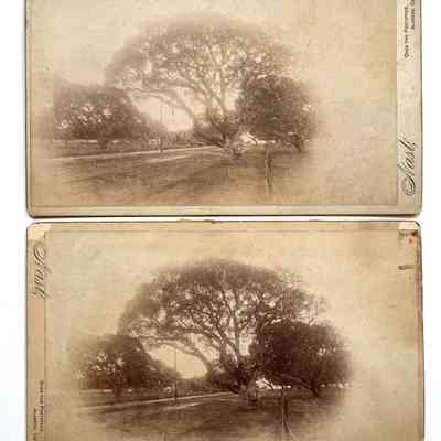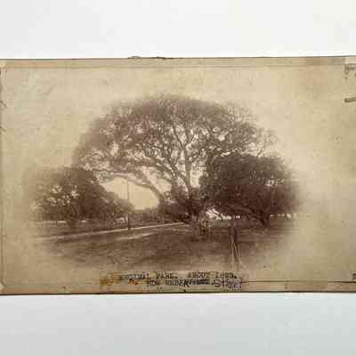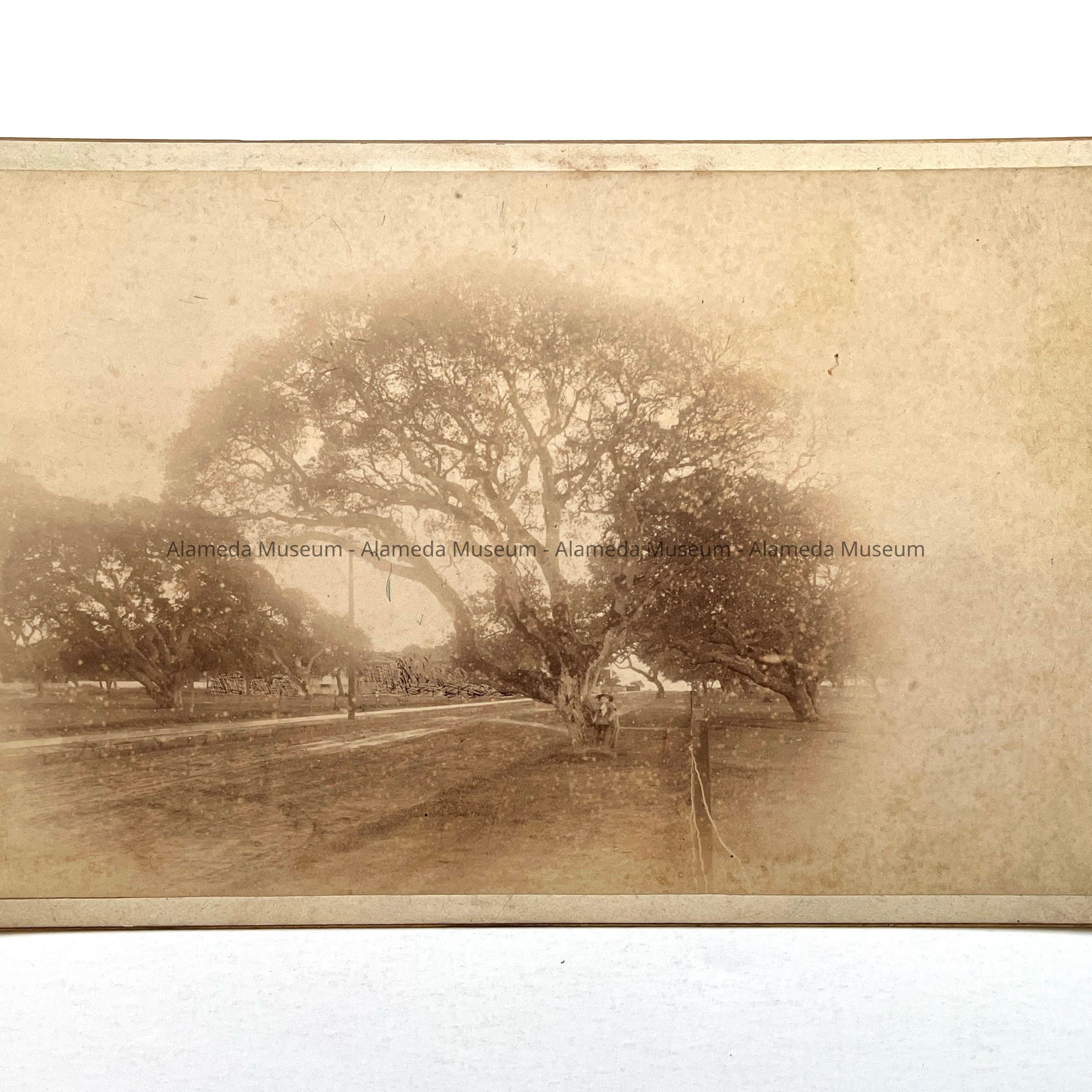 HISTORY OF OBJECT: THE PICTURE ILLUSTRATES WEBER STREET AS IT APPEARED IN 1890. COVERED WITH OAK TREES. THE VIEW IS TAKEN LOOKING SOUTH. WEBER STREET WAS THE HOME OF CAROLINE DWINELLE, WIDOW OF W. W. CHIPMAN, FOUNDER OF ALAMEDA. FOR WHOM THIS PHOTOGRAPH WAS TAKEN. GIVEN TO THE HISTORICAL SOCIETY BY MRS. CAROL HECHE, GRAND DAUGHTER OF MRS. CAROLINE CHIPMAN DWINELLE.