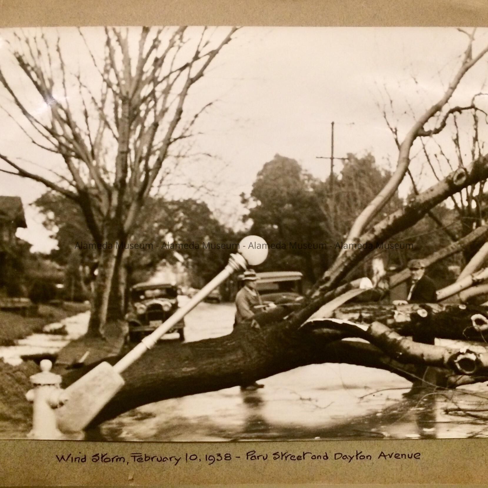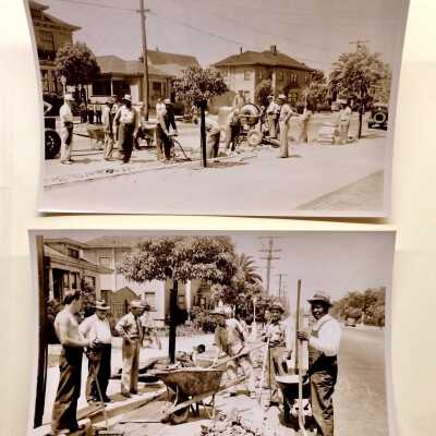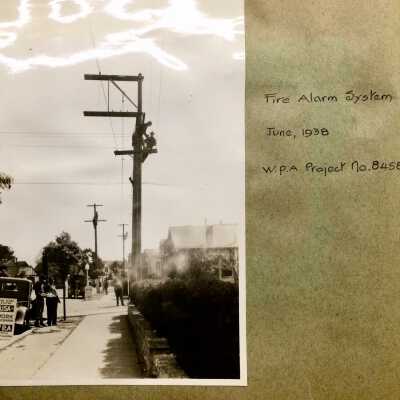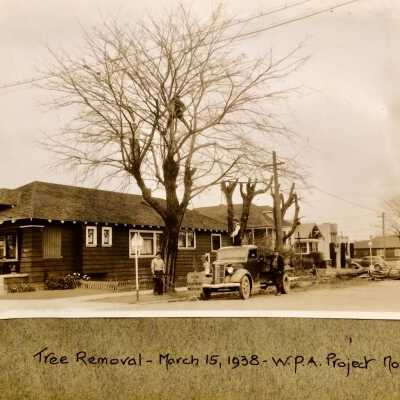 0. Two pictures of WPA workers, Jan. 1934; 1. Wind storm Feb 10, 1938; Paru Street and Dayton Avenue; 2. Wind storm Feb 10, 1938 Hibbard Street at Lincoln; 3. Sanitary sewer, Dayton Avenue between Grand & Paru street (WPA 8279); 4. Tree Removal March 15 1938 (WPA7658); 5-13. Government Island March 15, 1938 to September 7, 1938, (WPA 8571); 14. Fire alarm system, June 1938 (WPA 8458); 15. Sanitary Sewer - Otis Drive Sept. 7, 1938 (WPA 8918-A); 16. -21. Bleachers McKinley Park October 26-December, 1938 (WPA 8894-B). Loose photos: 21 (Bleachers); 22, 23. Machine Shop Corporation Yard, March 28, 1939 (WPA 10,734); 24, 25. Sanitary Sewer or sidewalk pavement project, location unknown; 26; building a small building, location unknown; 27. Sanitary Sewer or sidewalk pavement project, location unknown.