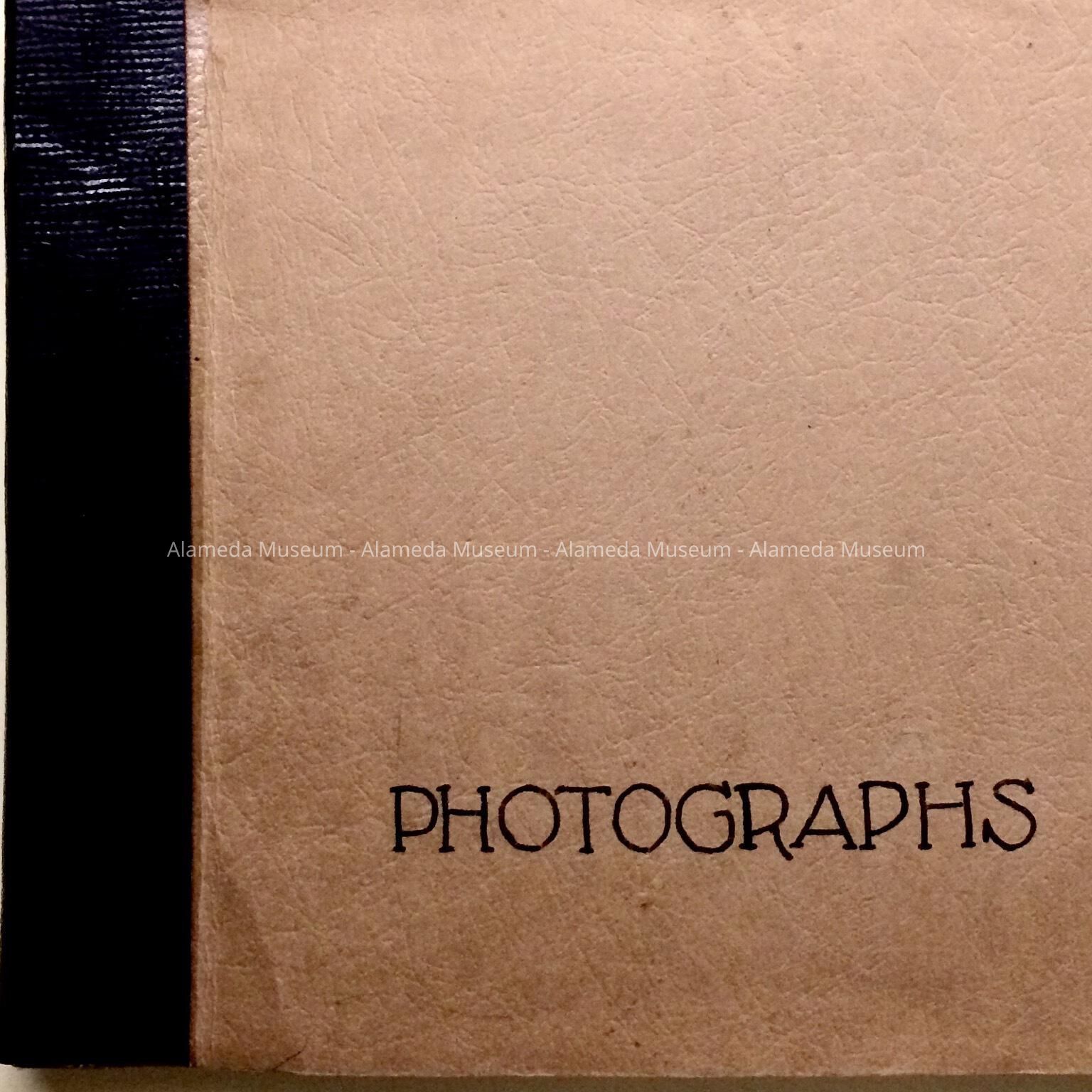 Description: Heavy paper cover with pseudo leather look, and black alligator-skin looking plastic spine covering, with hand-written caption: PHOTOGRAPHS. First pages contain black and white photos mounted on tan inside paper pages with captions, with additional loose photos tucked inside, especially in later.