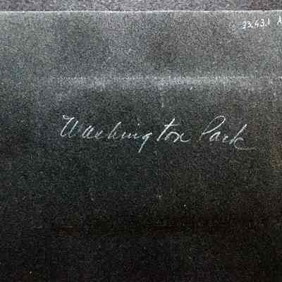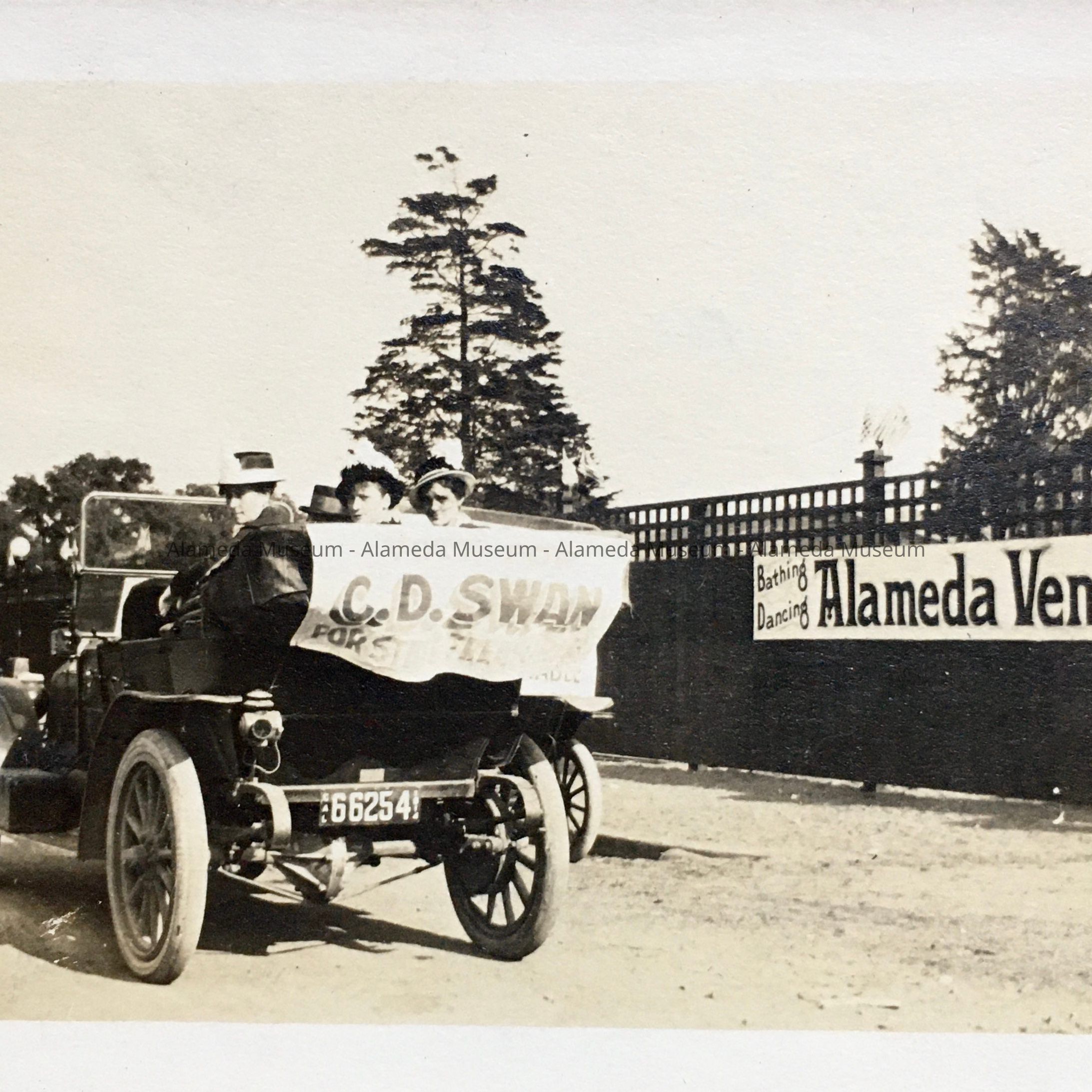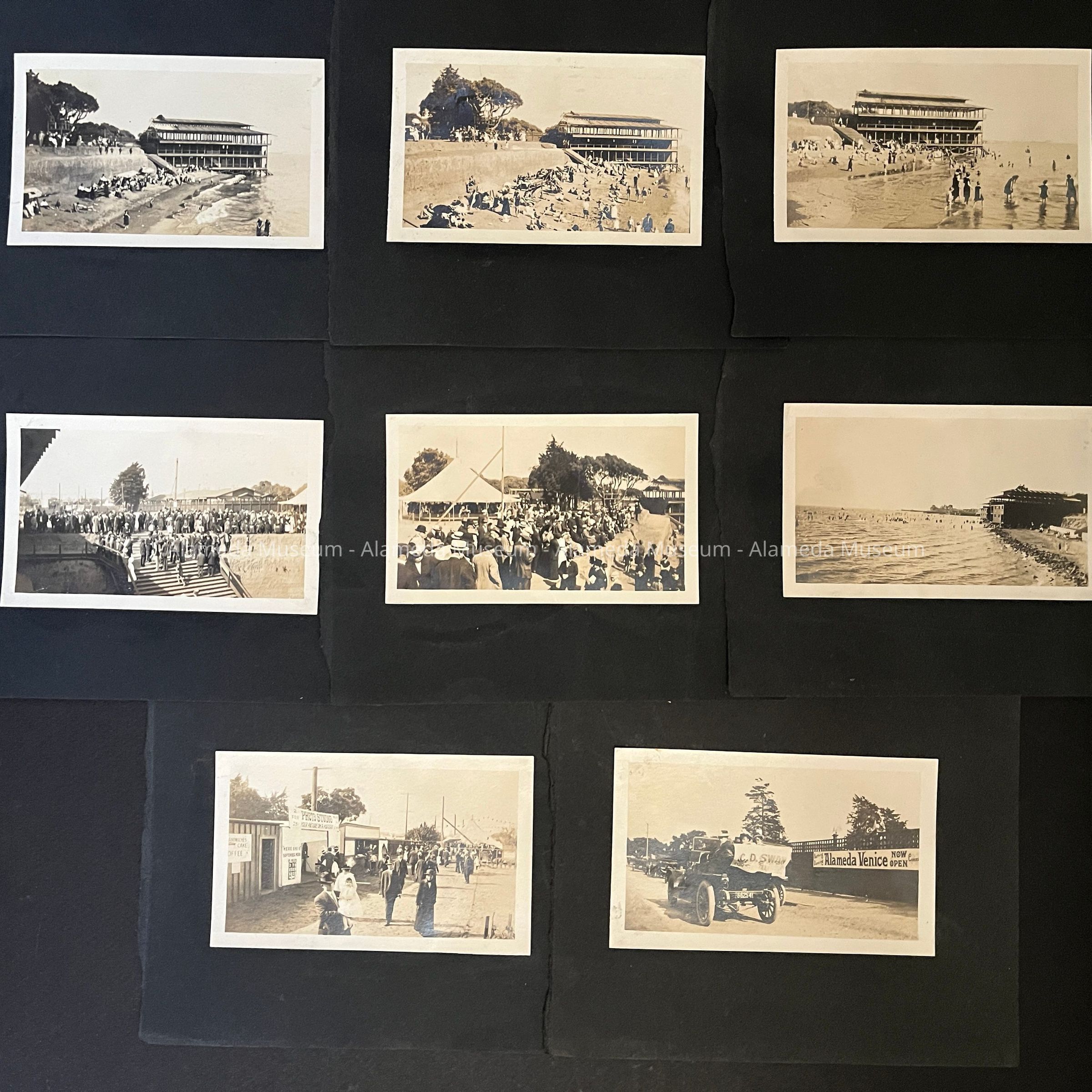 Description: sepia colored photographs, mounted (glued) on black photo album paper, featuring beach scenes or an avenue with people. A has 'Washington Park' in pencil on the reverse. A-C have a building, with a street lined with a wood fence, and broad staircase to the left and a sandy cliff to the left of that. On C. a pier with building at the end is visible. D. appears to be the top of that staircase; E. has the building from the top of the cliff with a merry-go-round; F. shows the building from the other side, but from a high vantage point (on top of the cliff), with a similar building right behind. G. shows a path lined with concessions and the fence in the background; H. shows cars in front of the fence with a banner 'Alameda Venice Now Open' and in smaller type 'Bathing Dancing Conces[sions]'. Also on H, a banner on the car with 'Vote Vote C.D. Swan for St...' [remaining words illegible...].