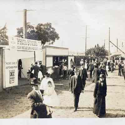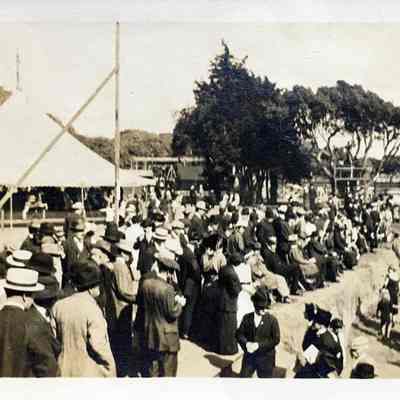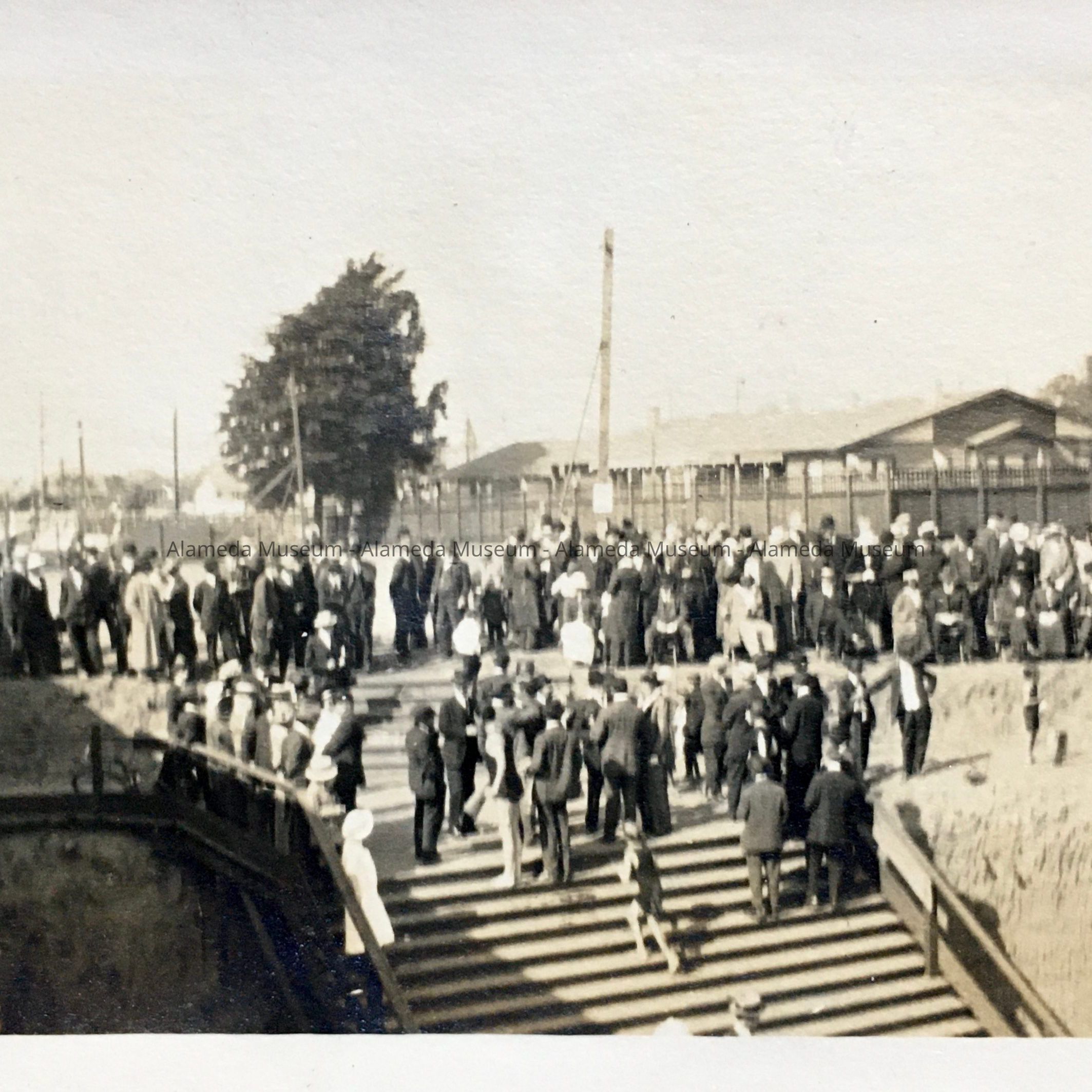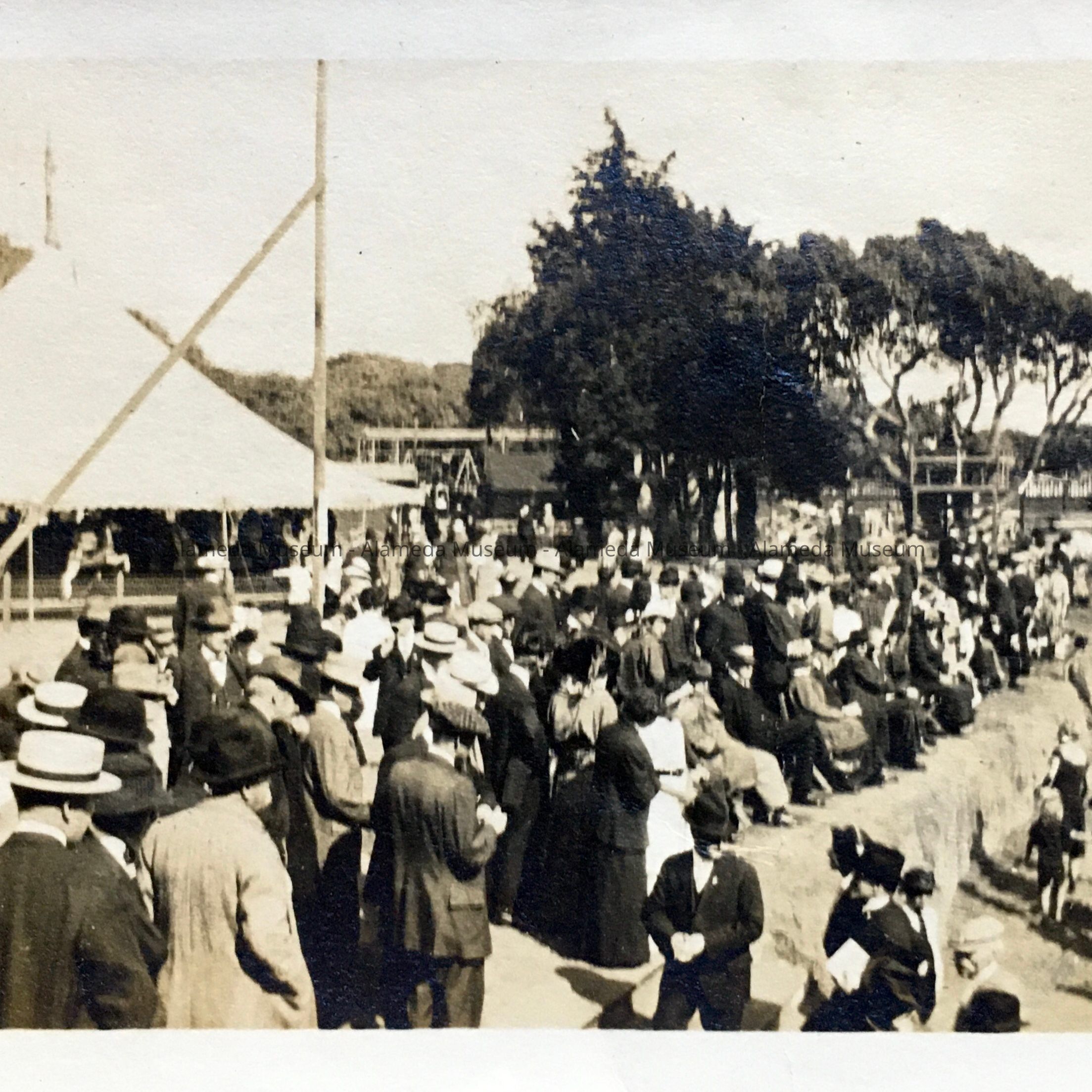 History of Object: Photographs found in a folder labeled 'Venice Baths / Palm Beach'. Possibly this was opening day. Venice Baths was opened around 1914, and accessible from Washington Park, what is now 'Upper' Washington Park. The owner, W.R. Geary, declared bankruptcy in 1915. On C. The Encinal Yacht Club club house is visible.