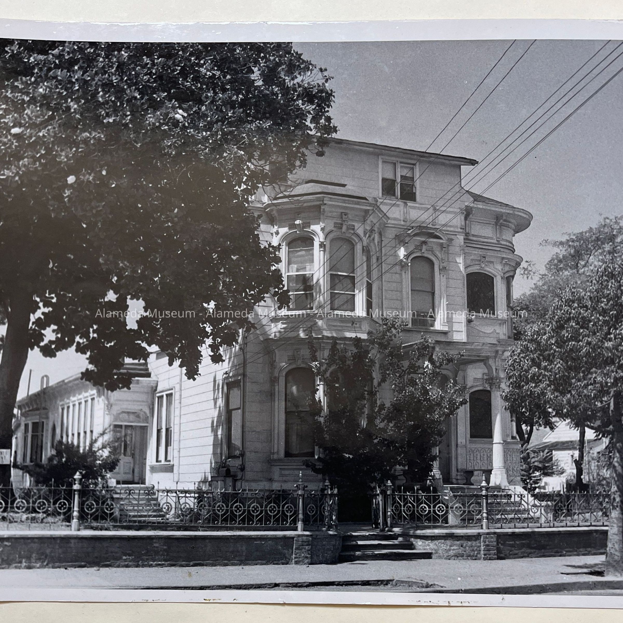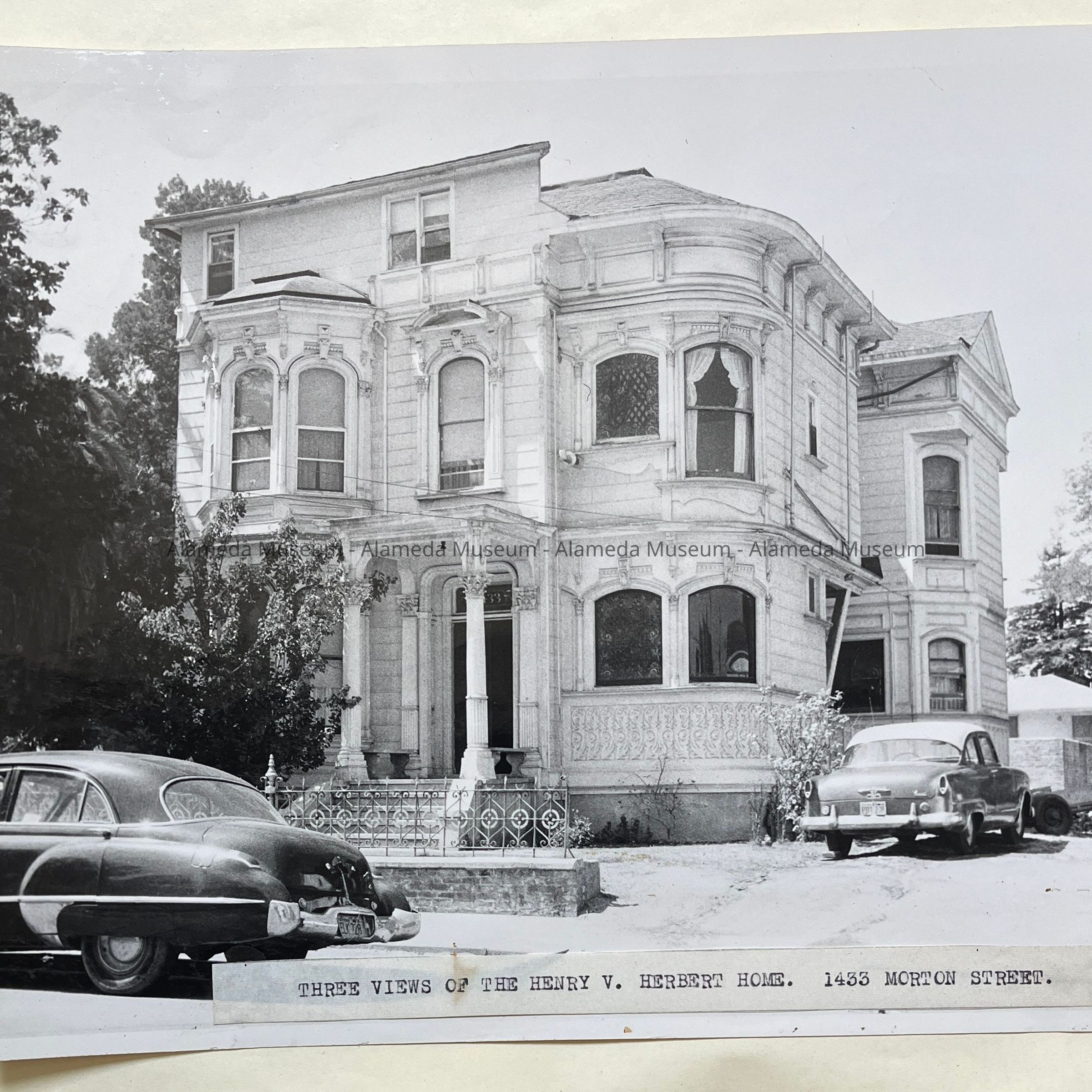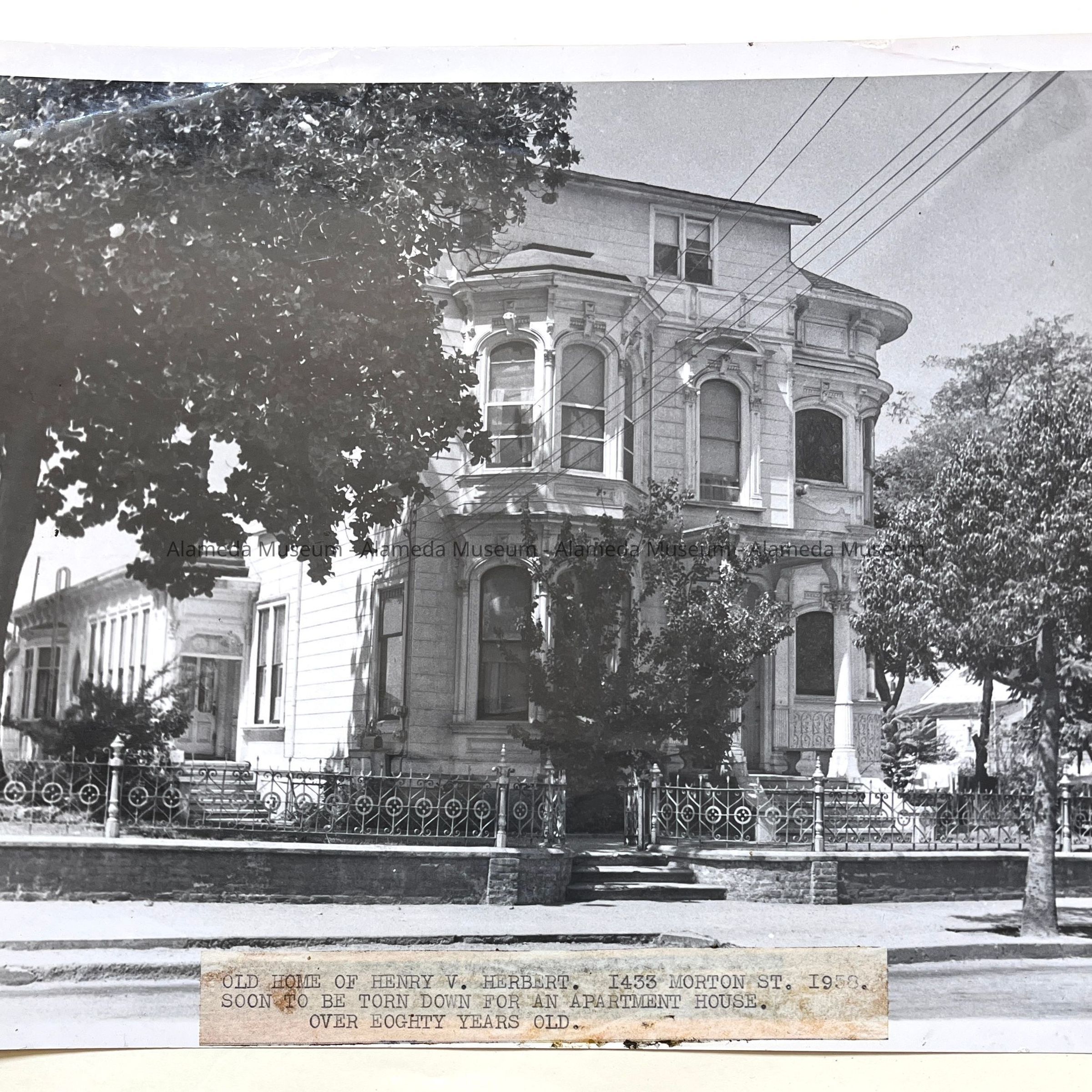 Photographs depicting various angles of Henry V. Herbert's home, located at 1433 Morton Street. Mr. Herbert was an attorney for Southern Pacific. The house was demolished in the early 1970's and only the wrought iron fence remains. Two art glass windows from the home are now in the museum collection and were removed from the house prior to demolition. The photograph was taken by Harriet Hallonquist, a member of the Alameda Photographic Society.