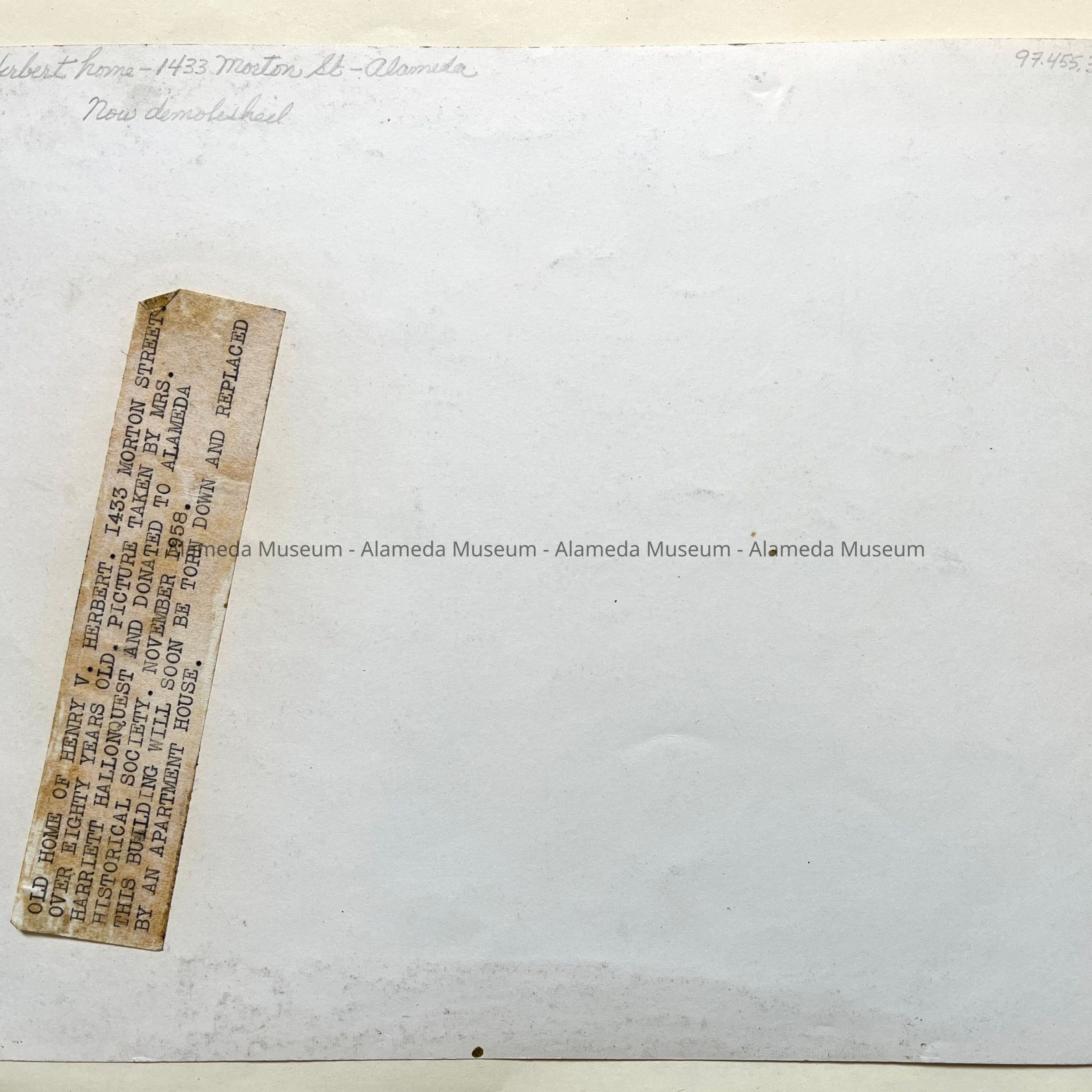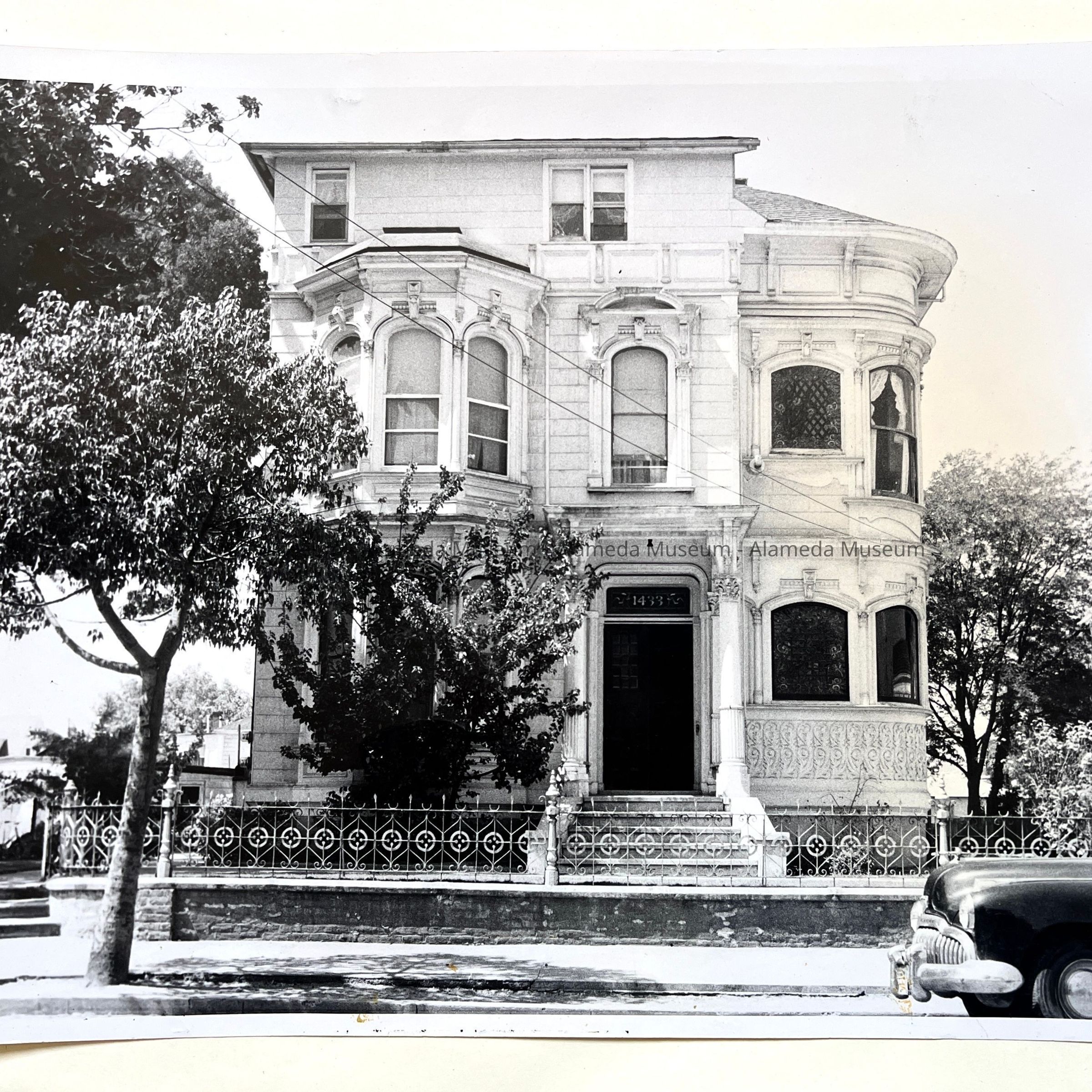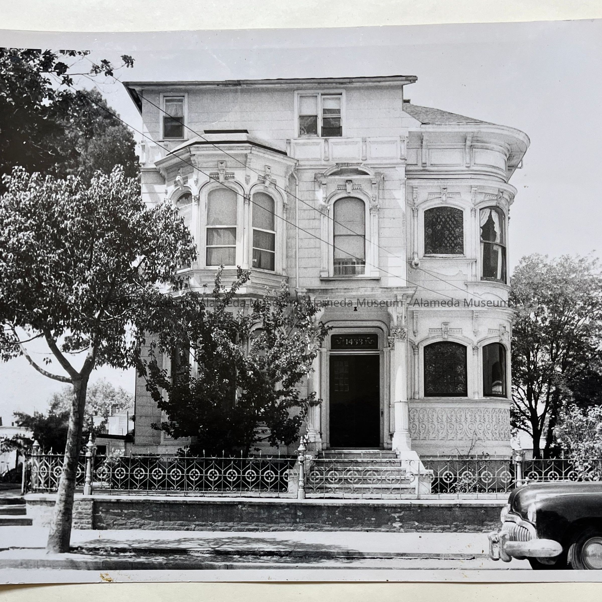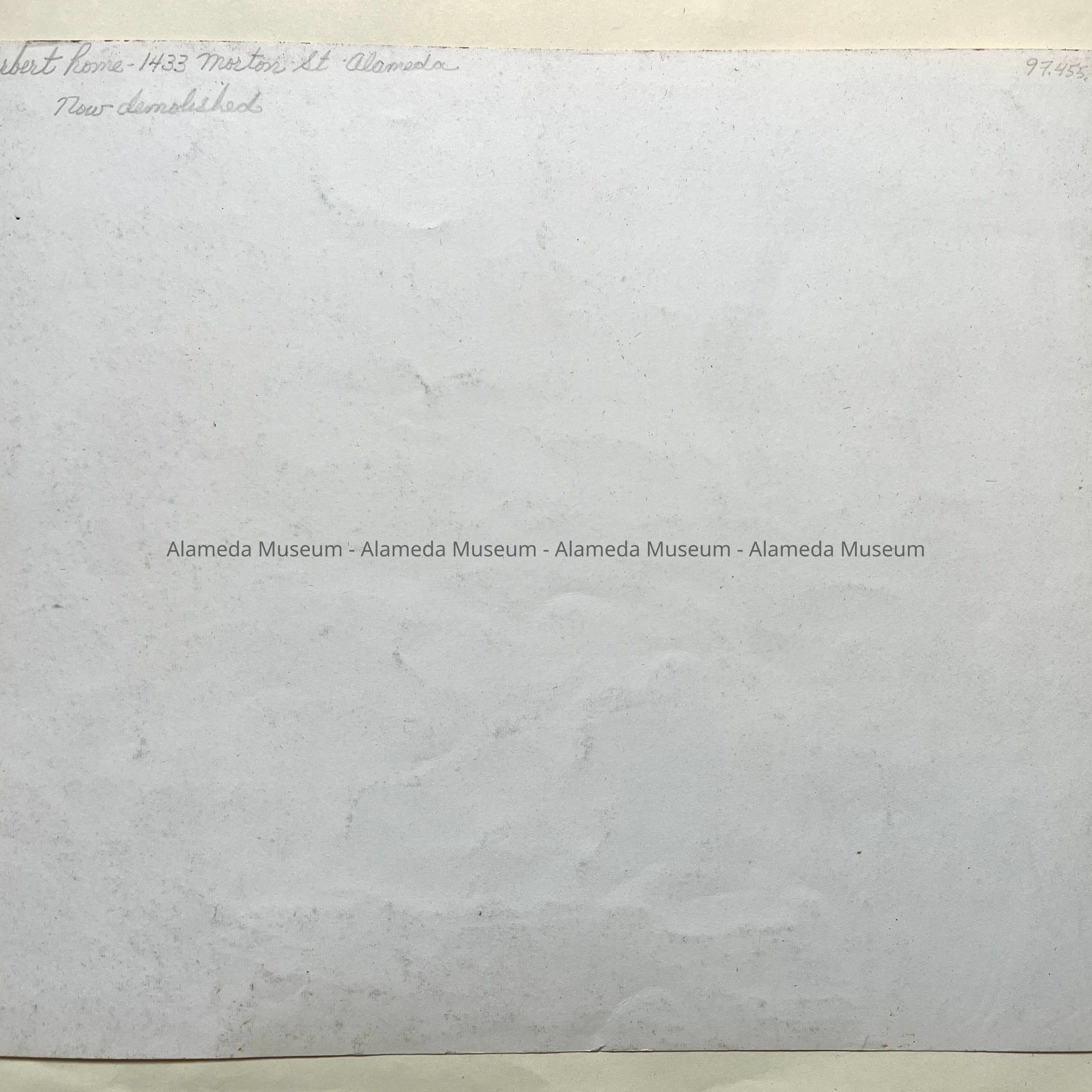 Photographs depicting various angles of Henry V. Herbert's home, located at 1433 Morton Street. Mr. Herbert was an attorney for Southern Pacific. The house was demolished in the early 1970's and only the wrought iron fence remains. Two art glass windows from the home are now in the museum collection and were removed from the house prior to demolition. The photograph was taken by Harriet Hallonquist, a member of the Alameda Photographic Society.