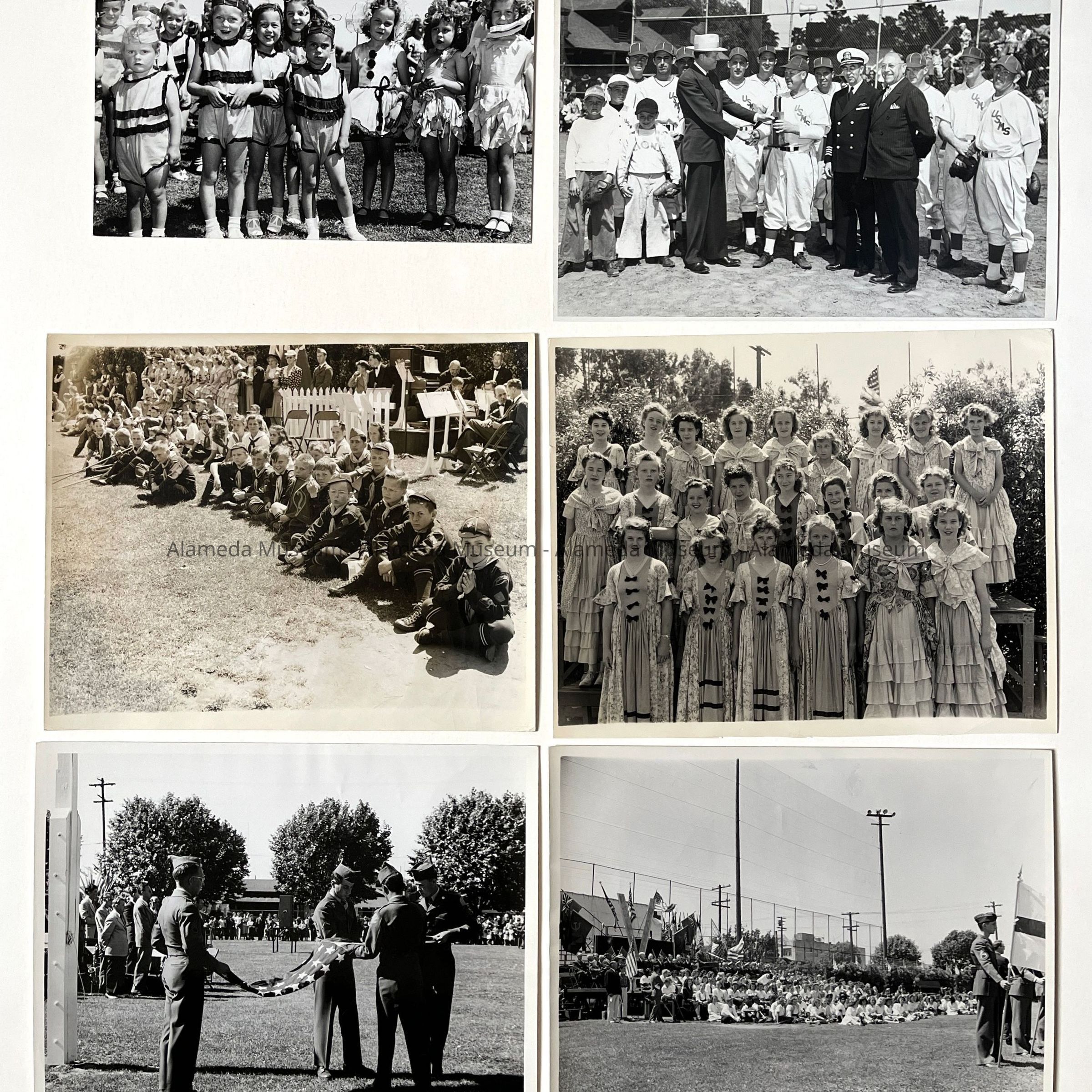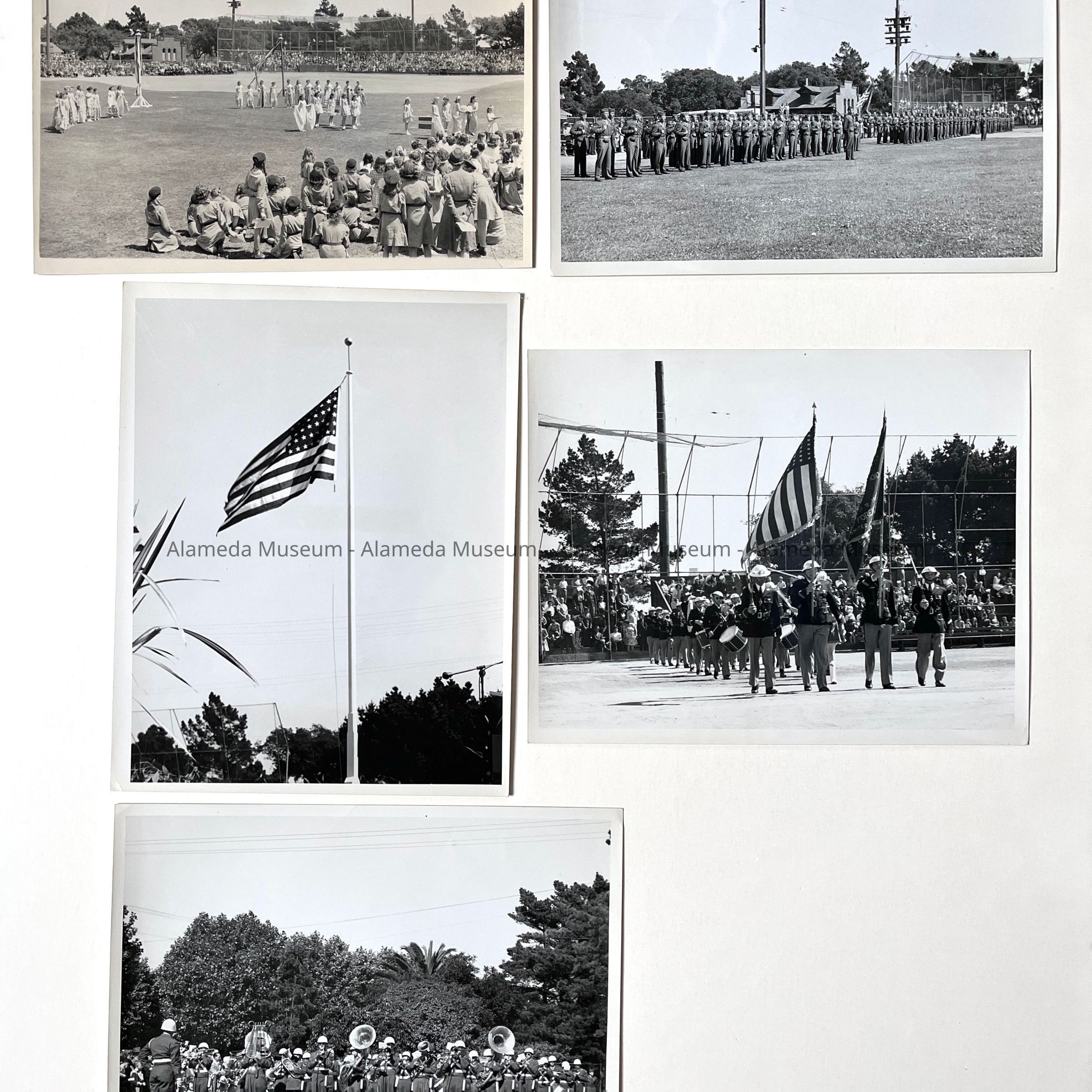 History of Object: Series of 13 photos showing activities connected with the Alameda Recreation Department Pageant held on June 1, 1945: (a) Group of costumed children; (b) civic officials presenting award to the U.S.M.S. baseball team; (c) group of Cub Scouts; (d) older girls attired in long-gowned costumes; (e) soldiers folding the U.S. flag; (f) view of civic officials and the public in bleachers; (g) girls presenting a dance pageant; (h) group of soldiers in formation; (i) the U.S. flag in breeze high up a flagpole; (j) military color guard; (k) Army band performing.