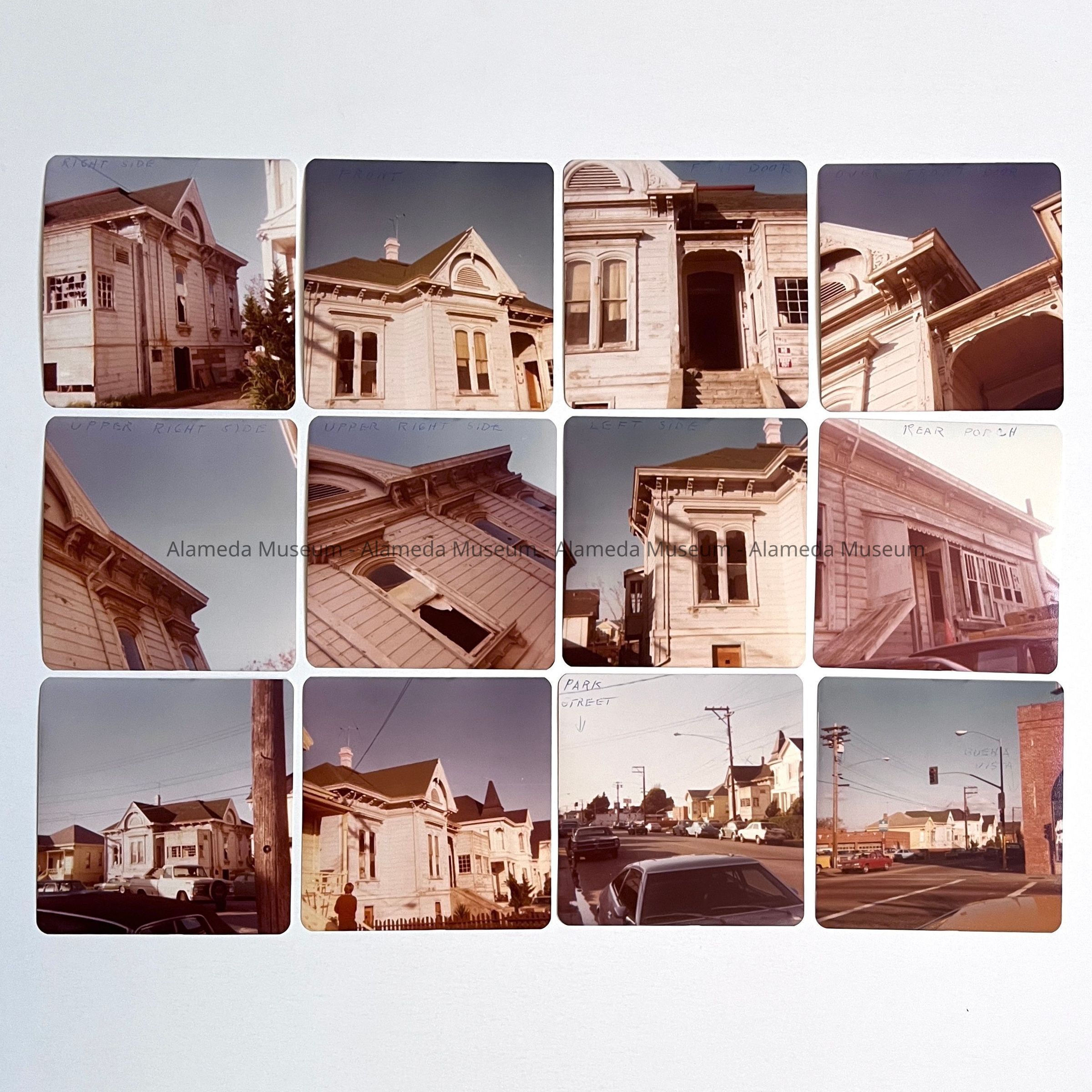 History of Object: Set of photos featuring exterior views of a Victorian home located at 2415 Buena Vista Avenue (between Park and Everett Sts.). Included within this set of 12 images are overall views of the structure as well as detail shots of the craftsmanship. A former owner was John Tregloan. This building was in a state of disrepair and scheduled for imminent demolition.