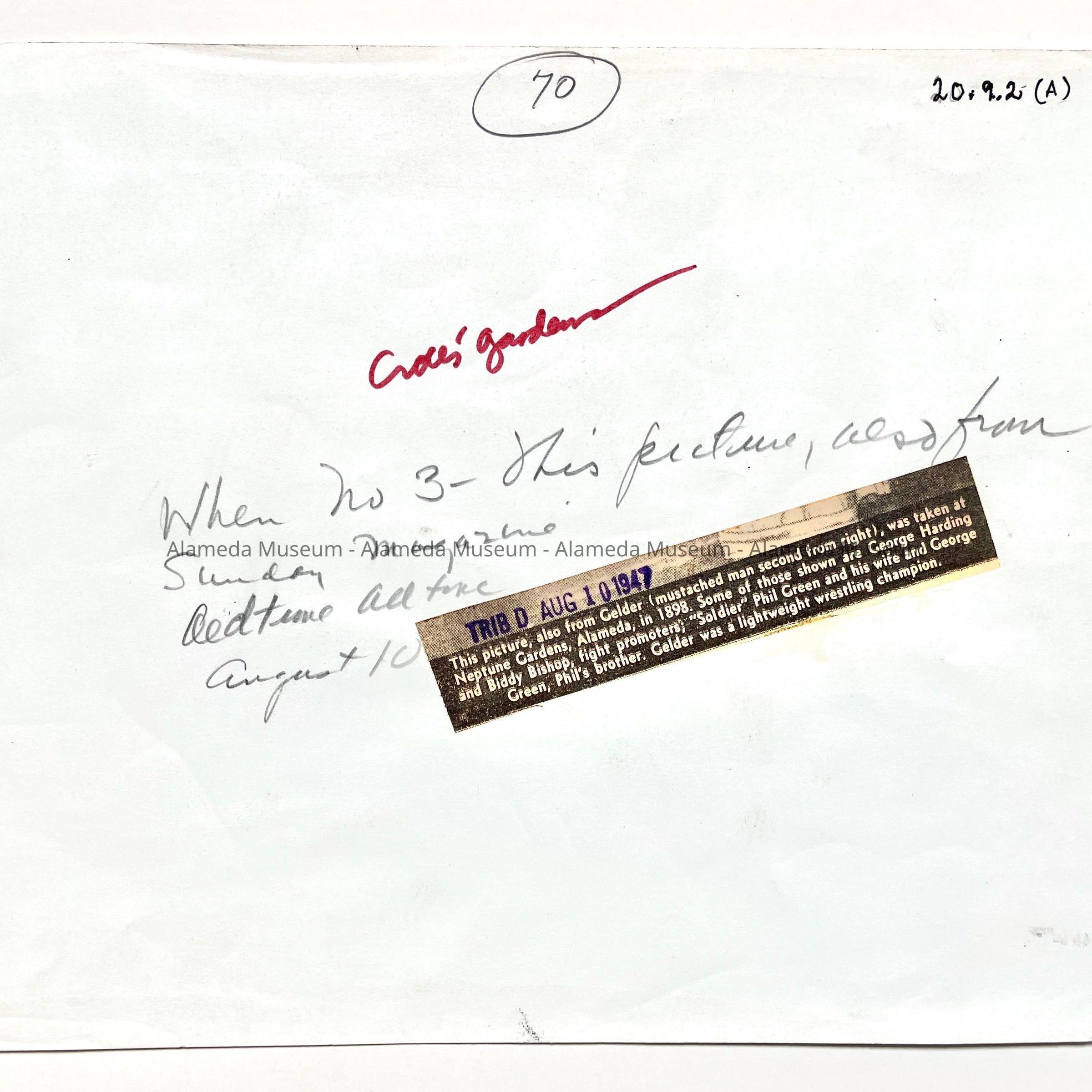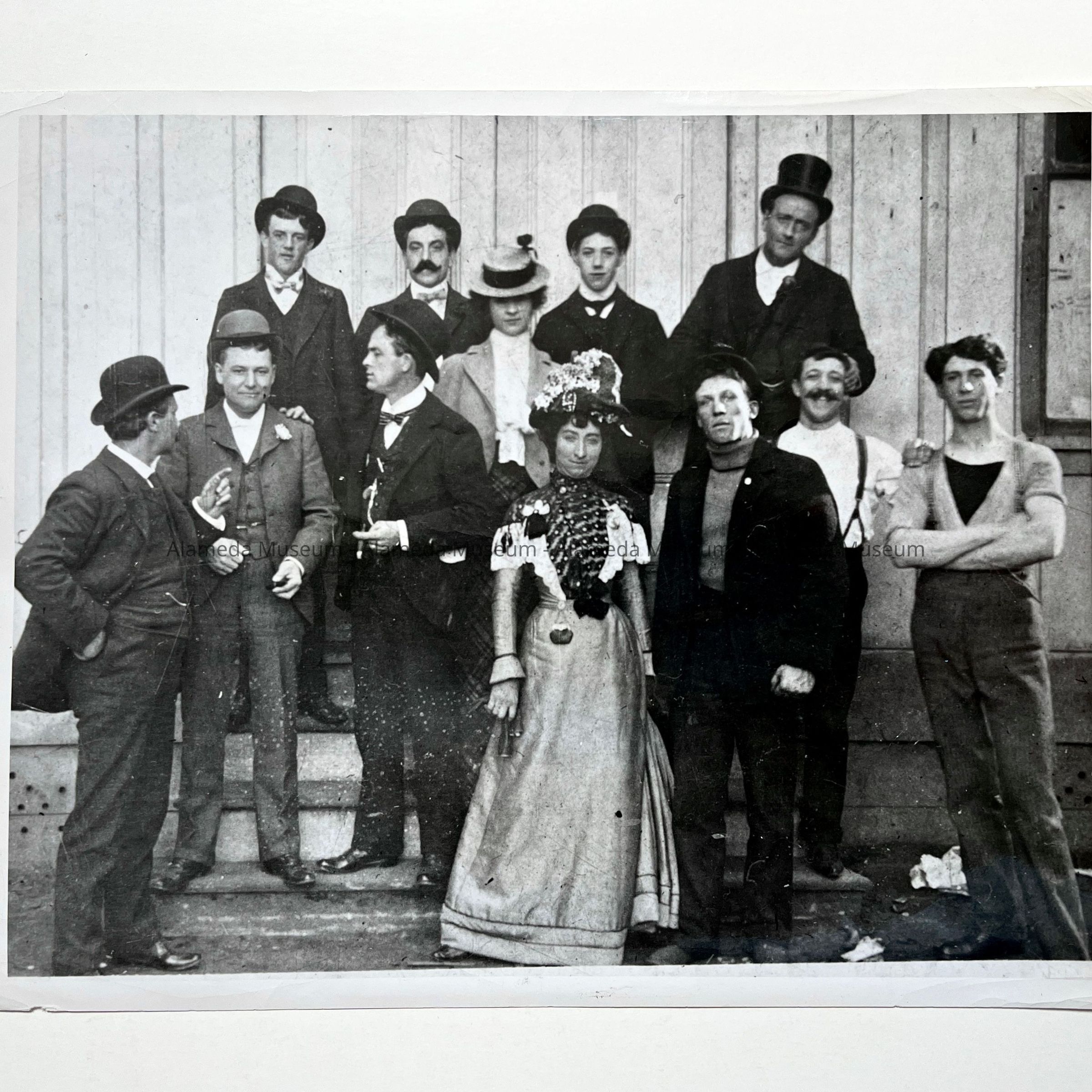 A: A reproduction of a photo taken at Neptune Gardens in 1898 showing a dozen people, unidentified among whom are George Harding and Biddy Bishop, fight promoters;