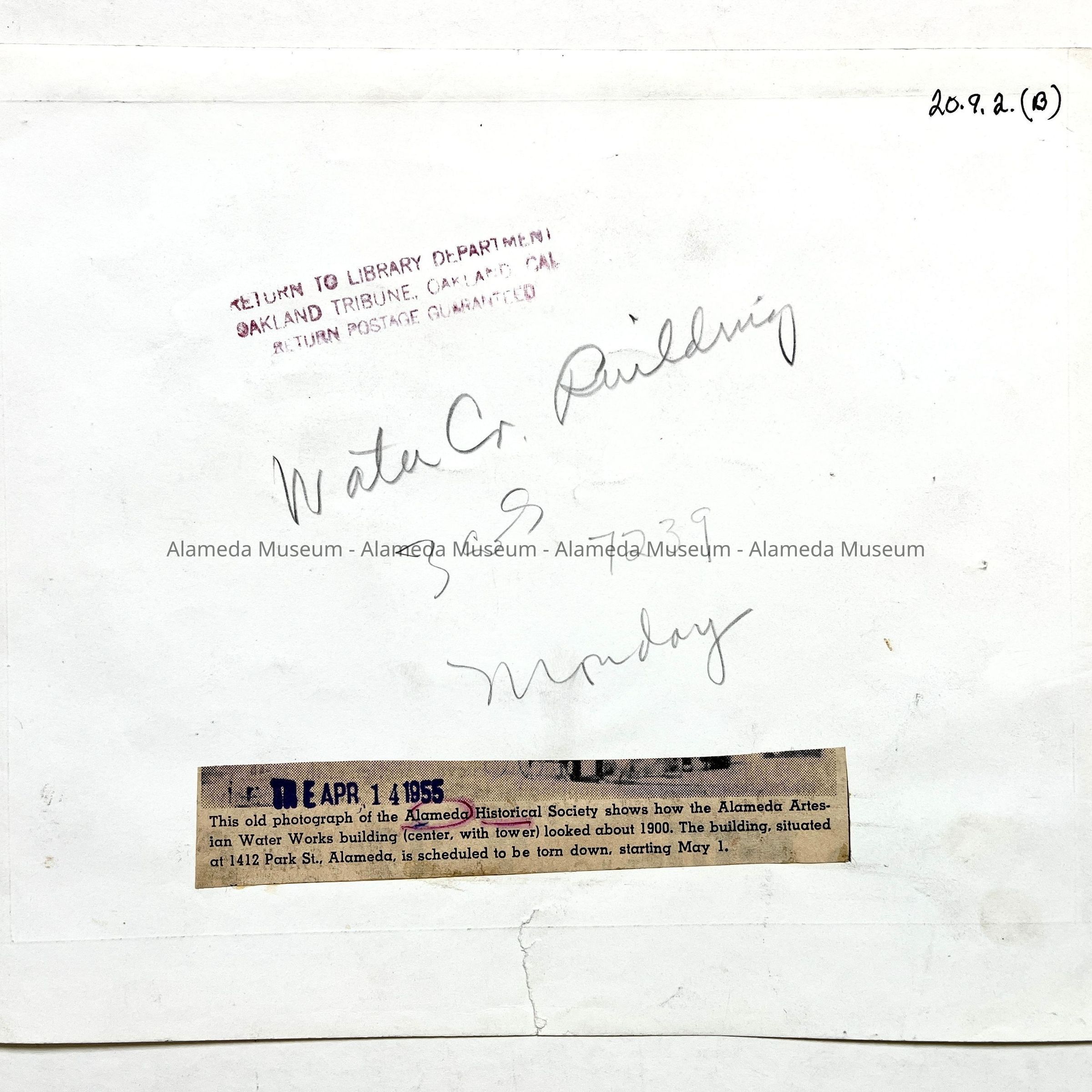 B: A reproduction of a photo of the Waterworks Building at 1412 Park Street;