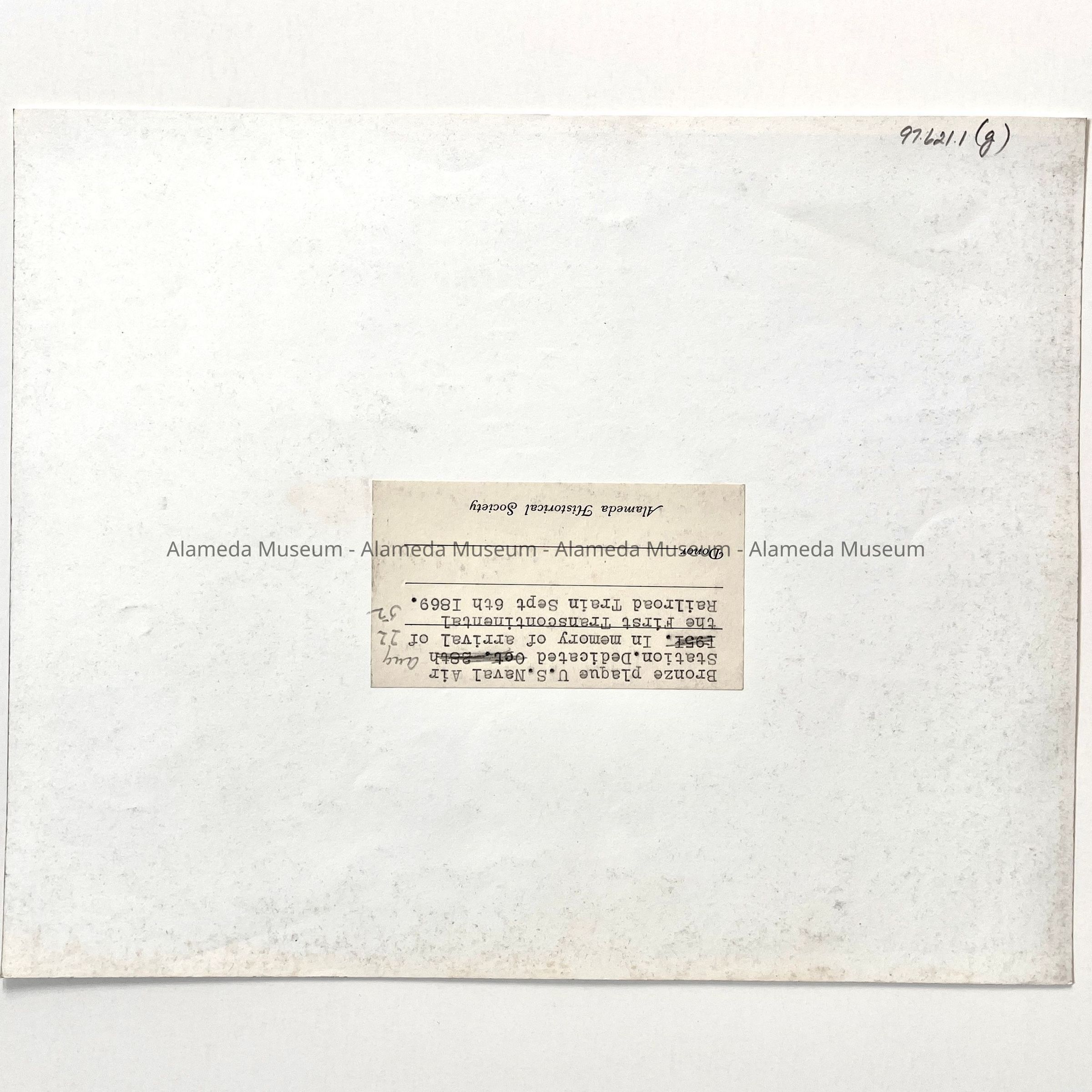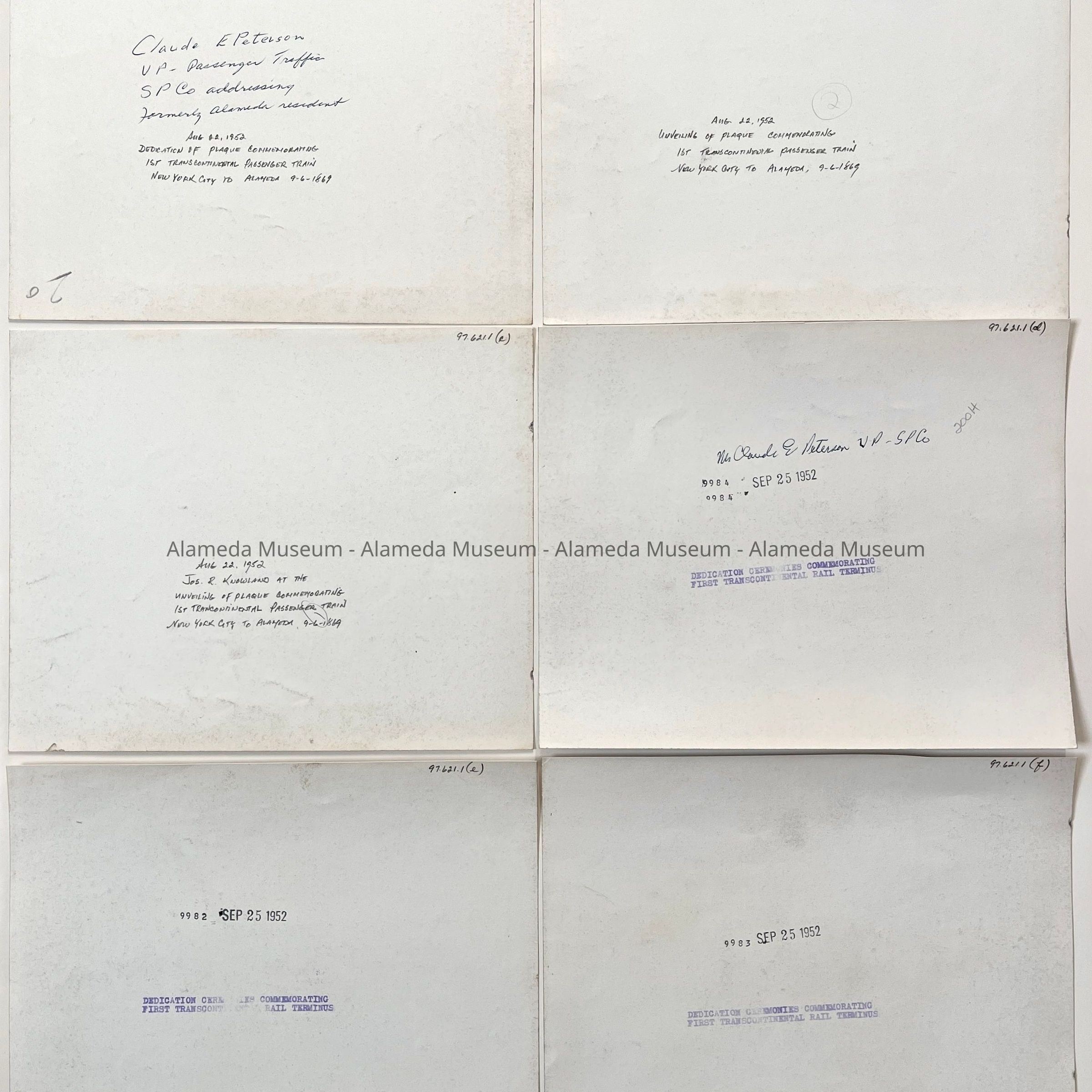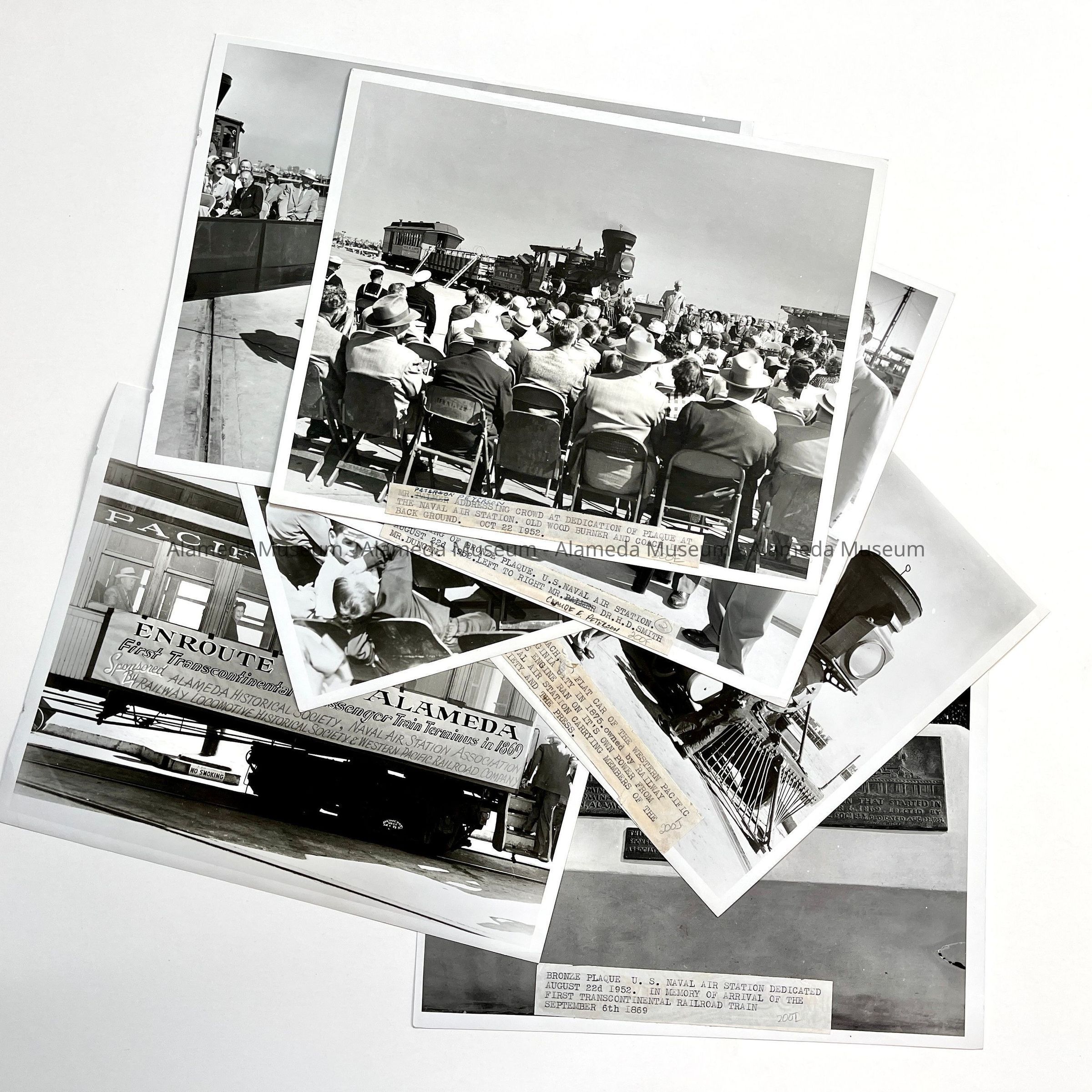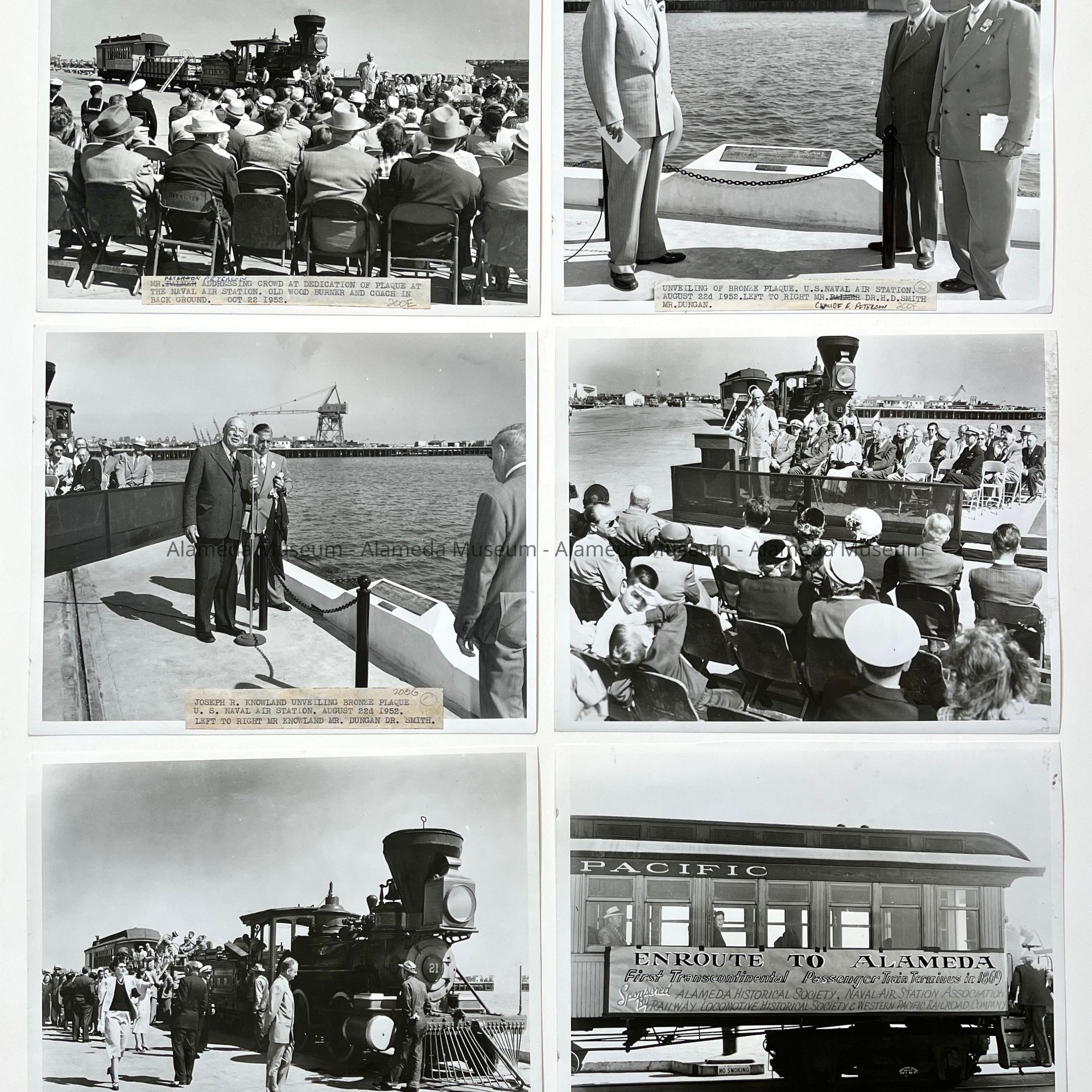 History of Object: Scenes from the dedication ceremony for a plaque at the N.A.S. commemorating the first transcontinental passenger train journey from New York City to Alameda completed on Sept. 6, 1869. Image #a - guests listening to speaker, a wood-burning locomotive is seen in the background; #b-officials standing beside the dedicated plaque; #c-Joseph R. Knowland addressing the guests; #d-Claude Peterson of the Southern Pacific Railroad addressing the crowd; #e-close-up view of the old locomotive; #f-passenger car close-up; #g-close-up of the bronze plaque.