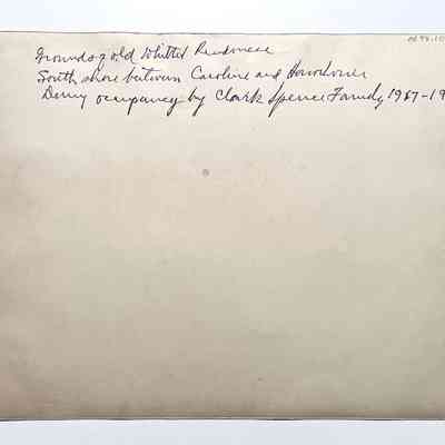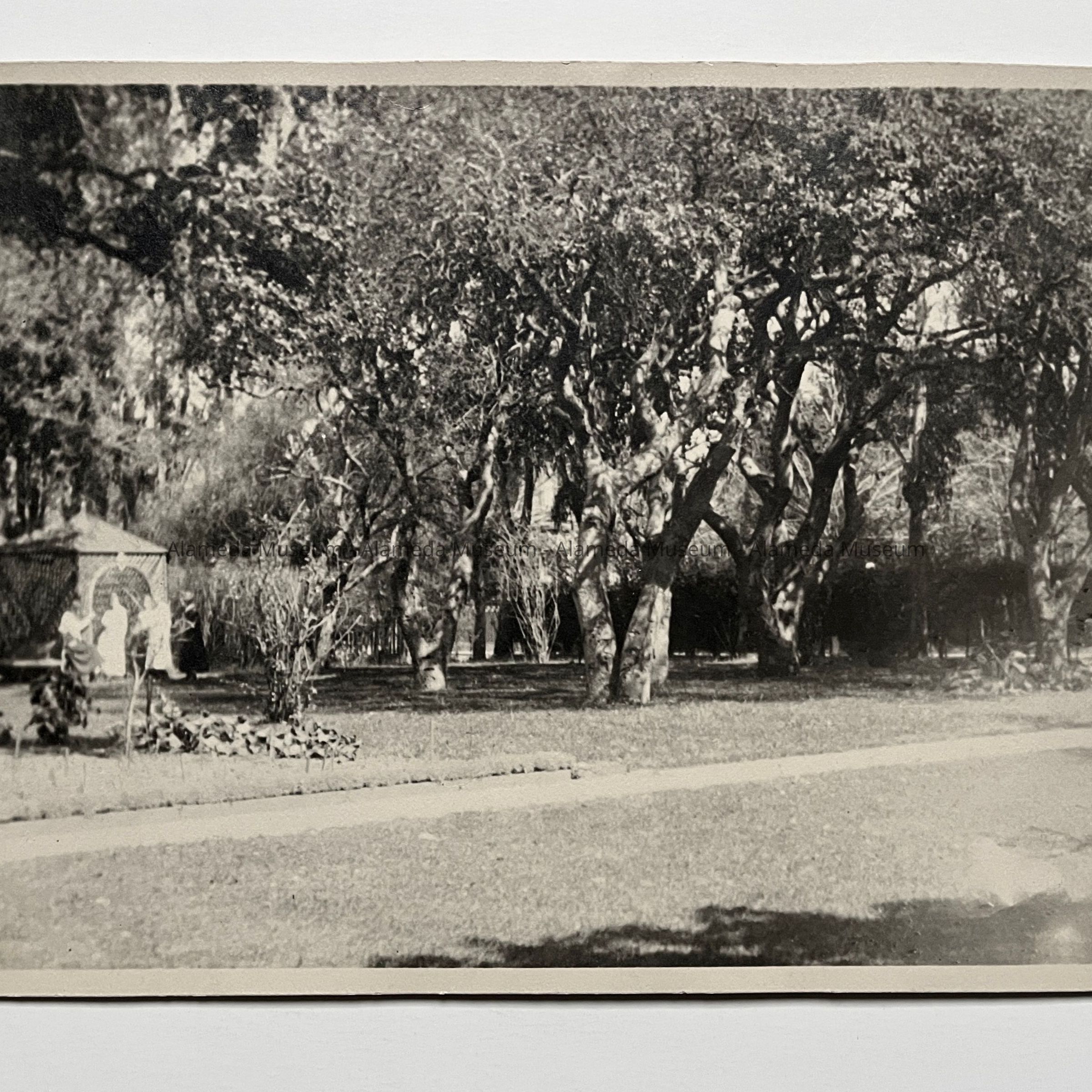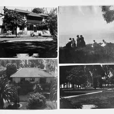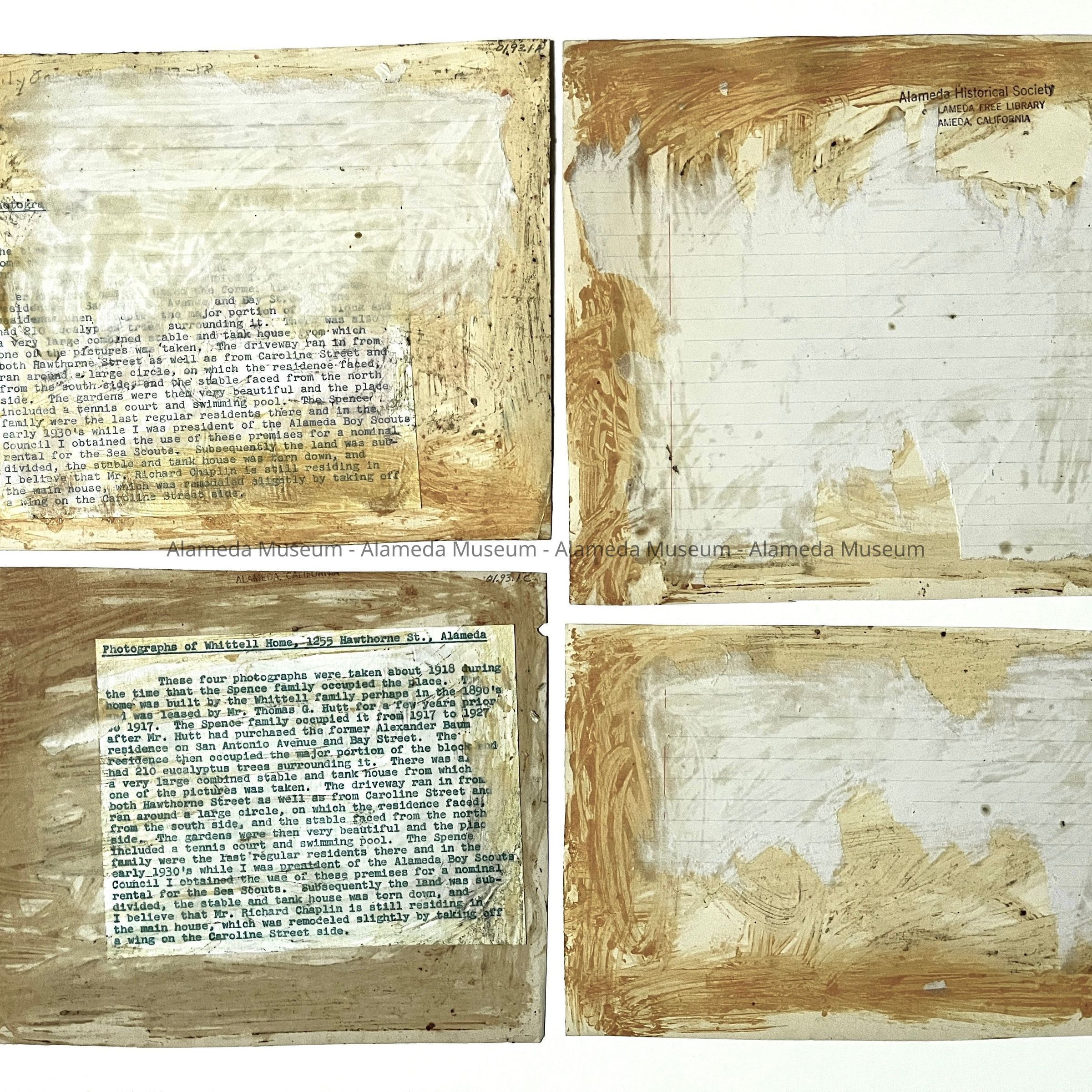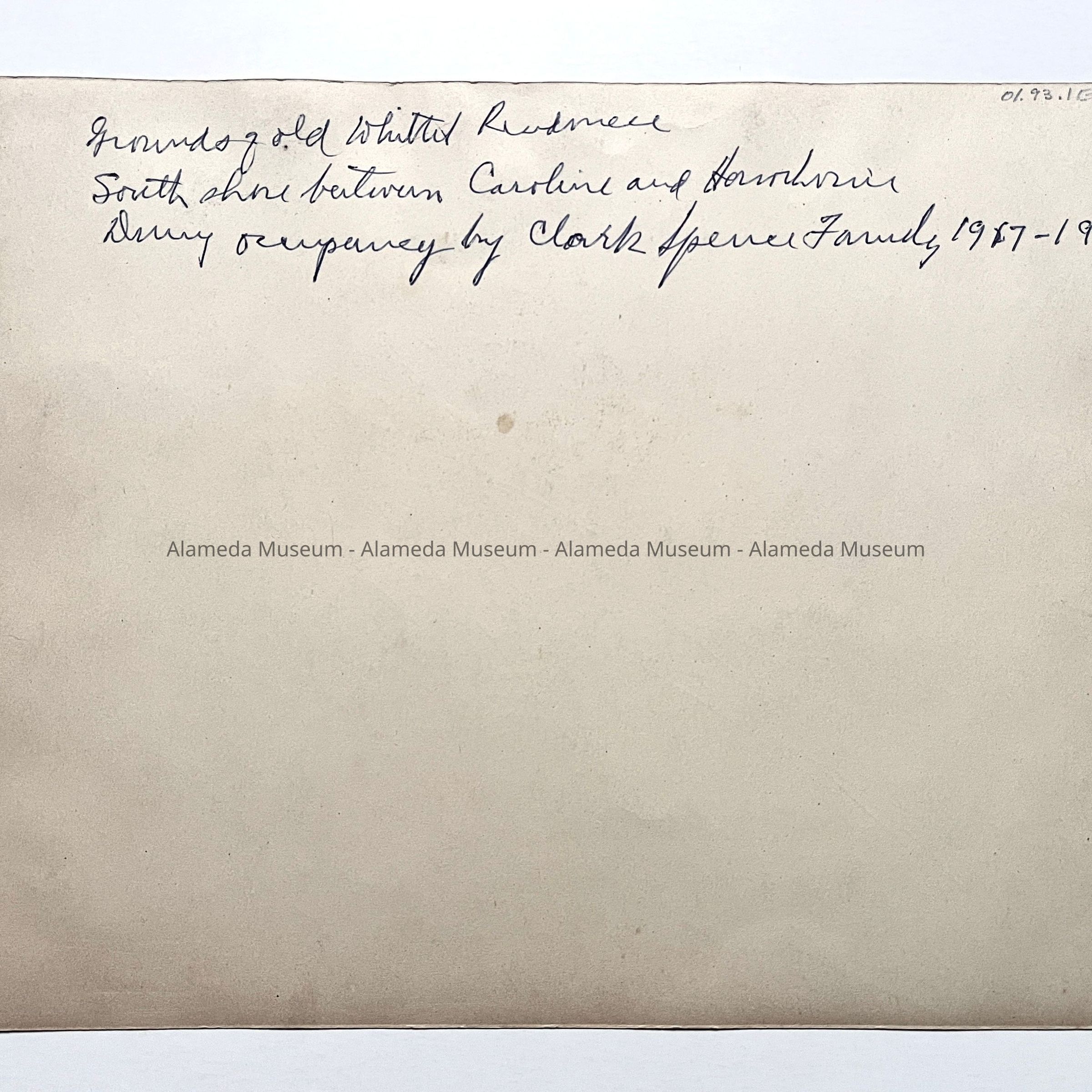 Photograph of the exterior view of the home and grounds of the Whittell residence, 1255 Hawthorne Street. It was taken during the occupancy of the Clark Spence family, 1917-1927. Photograph C has a typed list glued to the reverse side.