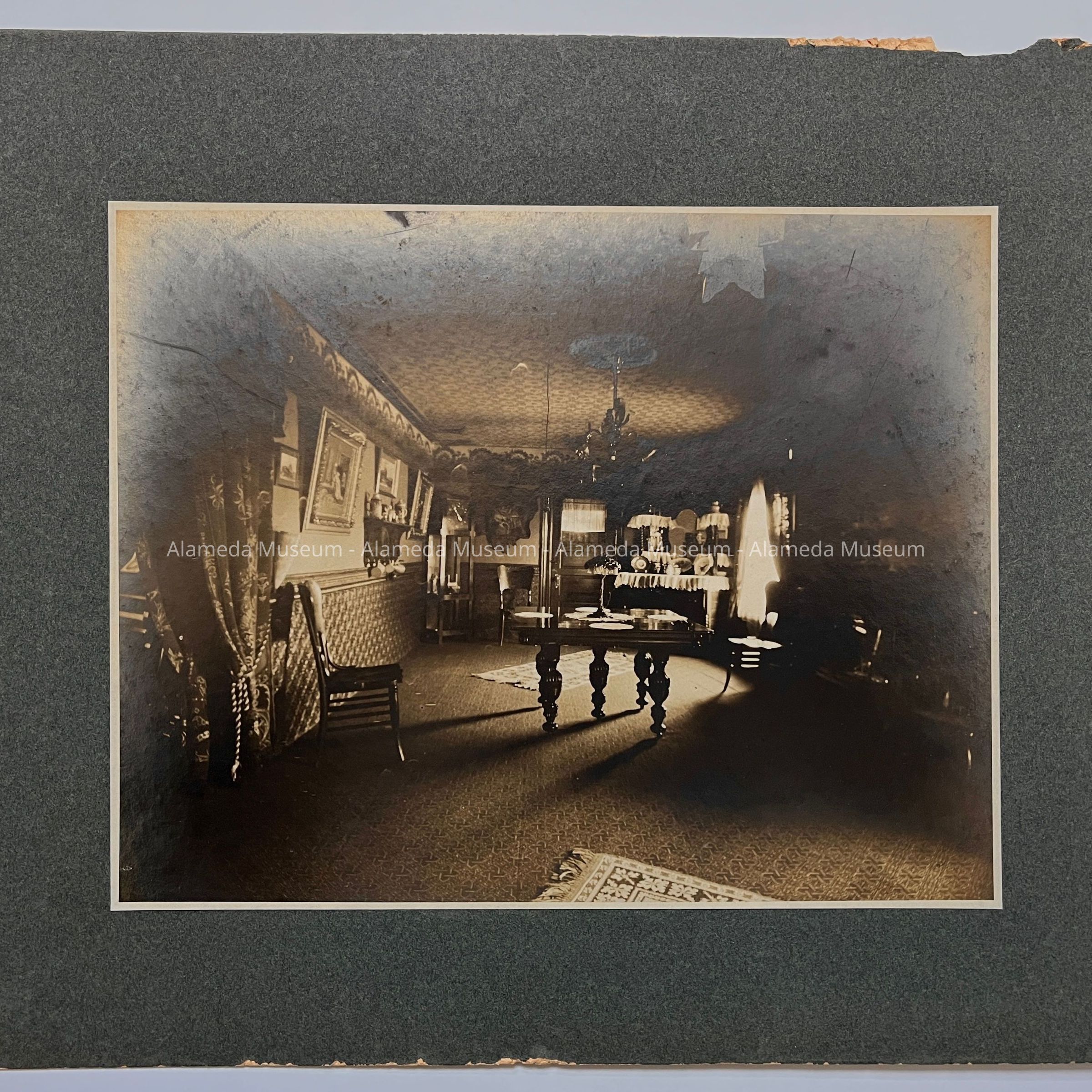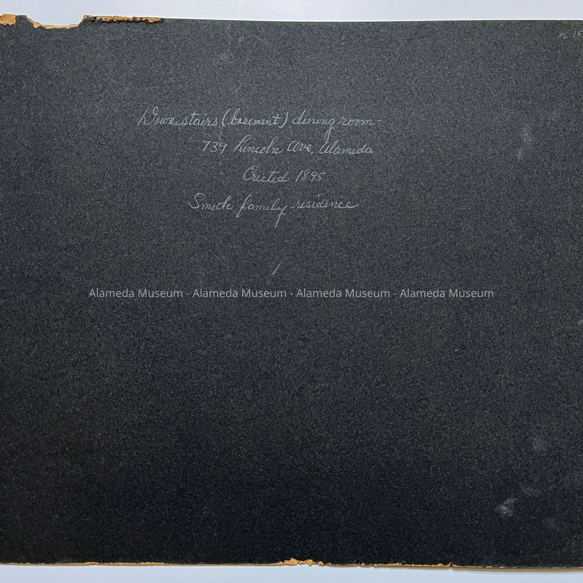 History of Object: The following collection of photographs depict the interior of 739 Lincoln Avenue (still standing), erected in 1895 by Marcuse & Remmel for Charles R. Smith. They appear to have been taken around 1901. This particular photo depicts the downstairs dining room which was located in what would be considered the basement
