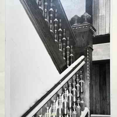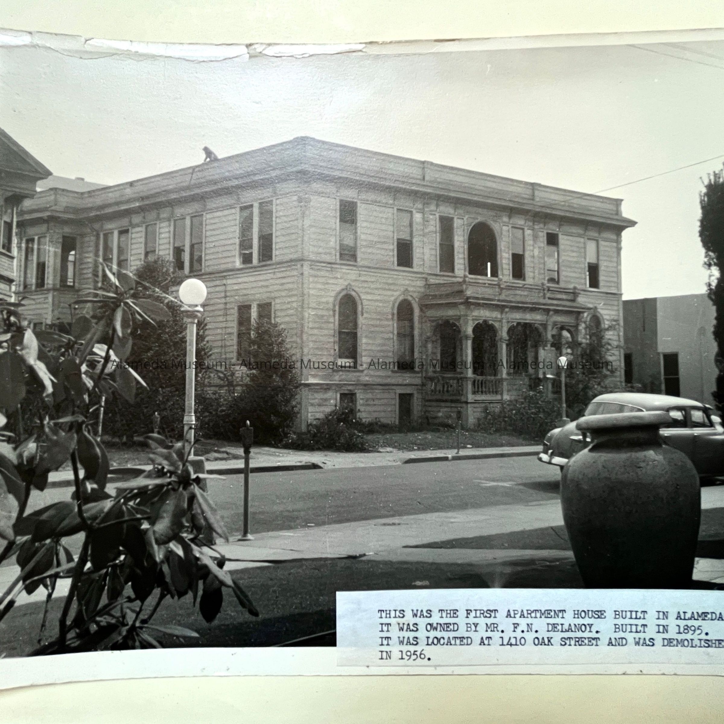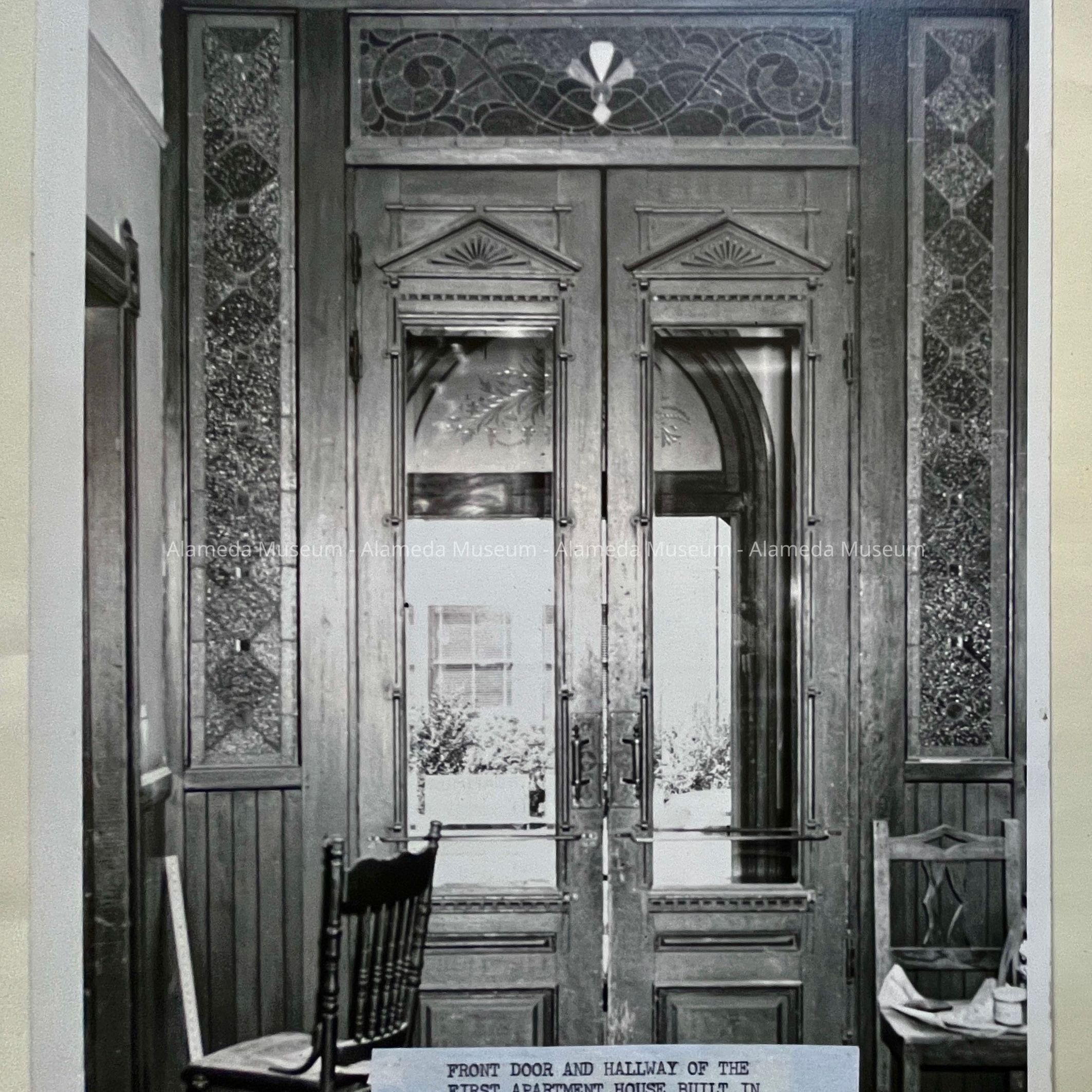 Photograph depicting the exterior and interior details of the Delanoy apartment building, which stood at the northeast corner of Oak and Central. It was demolished in 1956.