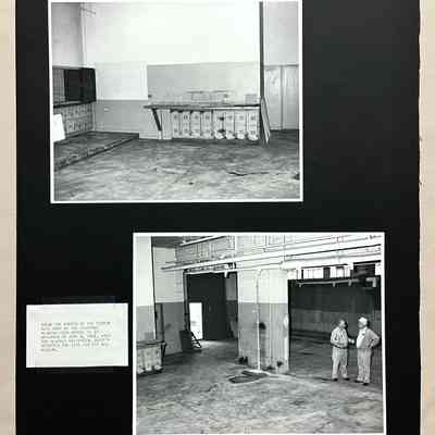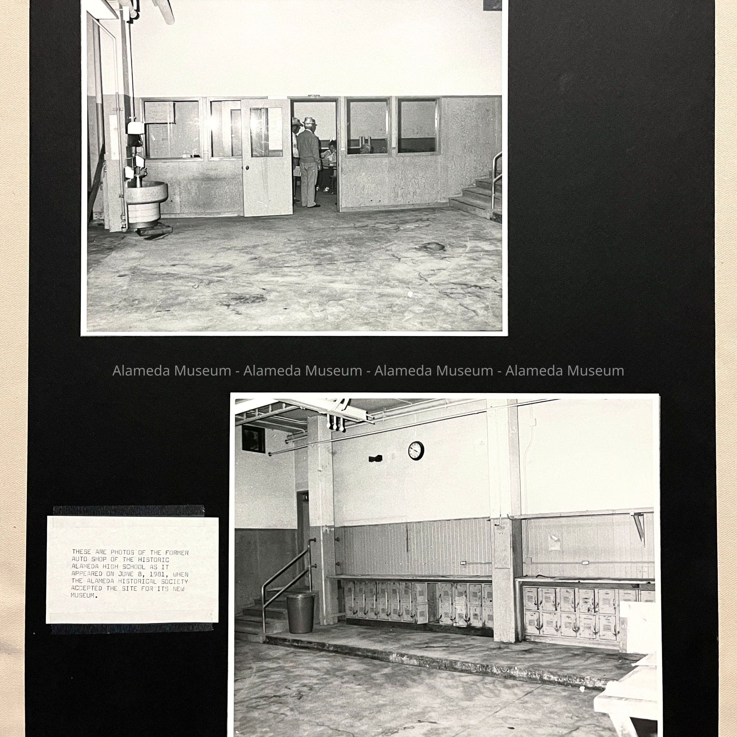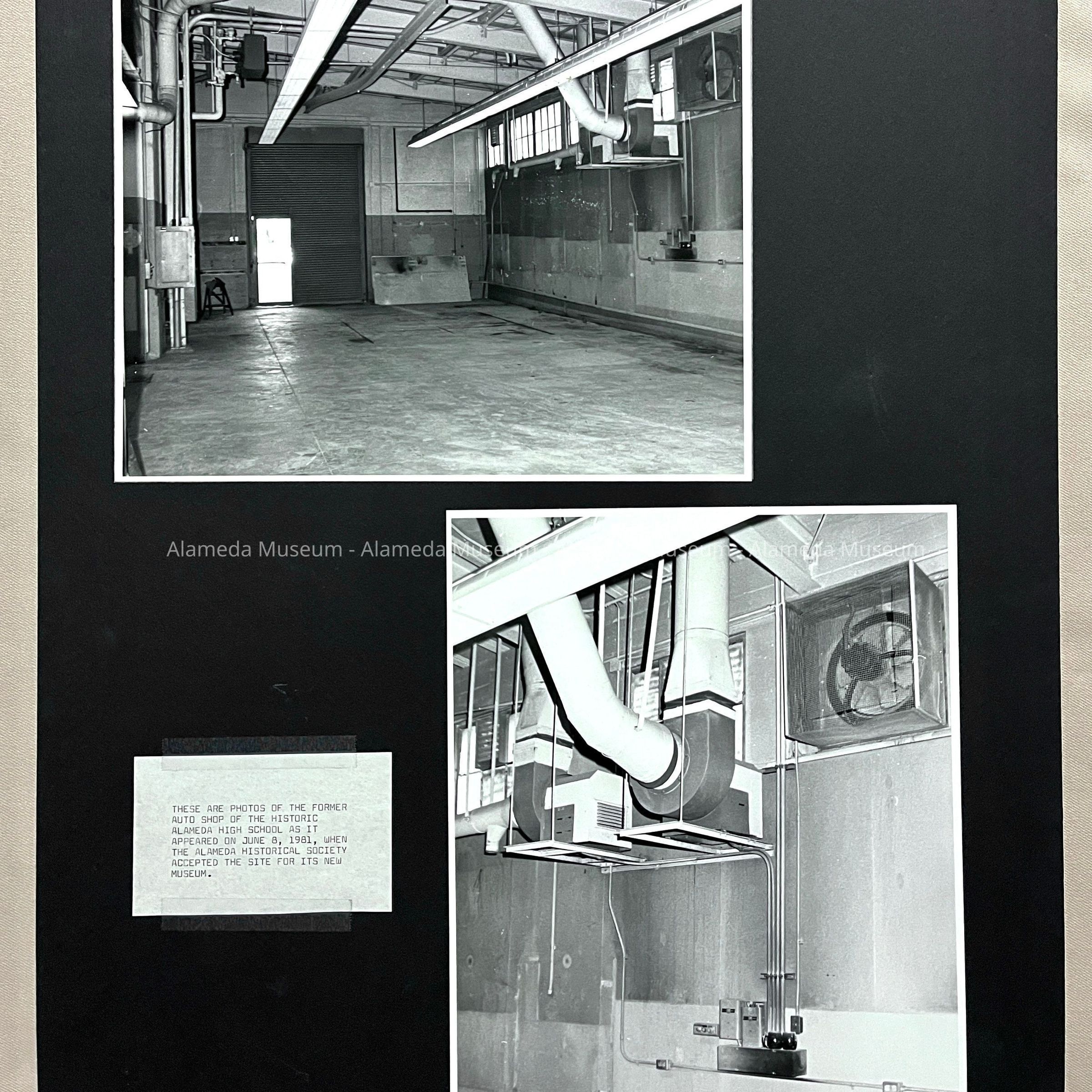 History of Object: Interior views of the former auto shop of the Historic Alameda High School at 1327 Oak Street, just prior to its conversion to the Alameda Historic Museum site (from 1981-1991). It currently serves as the location of the Alameda Recreation and Park Department office. Views: #a - heating pipe system; #b - ceiling and back wall; #c- old student lockers; #d - Maurice Fry (L) and Larry Pelton inspecting the site; #e - same men speaking to an unidentified woman seated in a side office; #f - old student lockers; #g - ceiling view; #h - heating and air system fixtures.