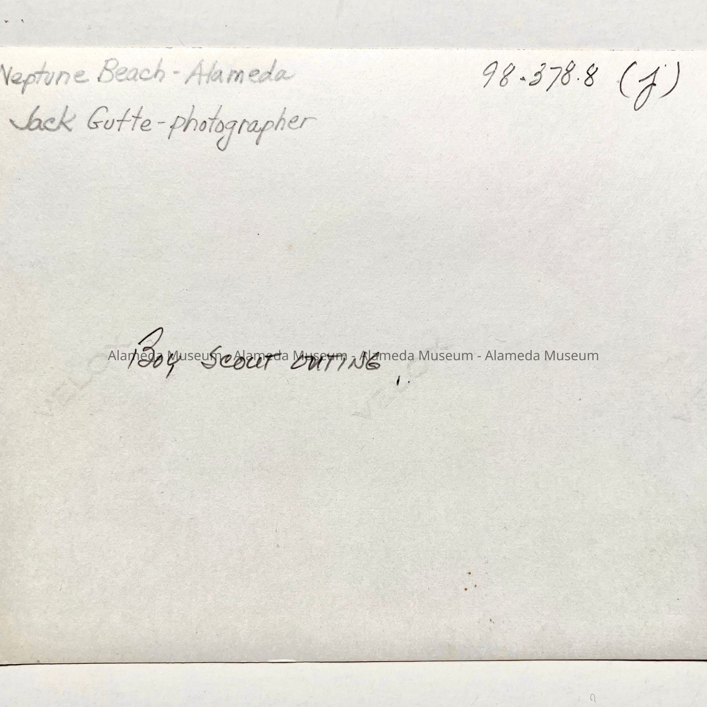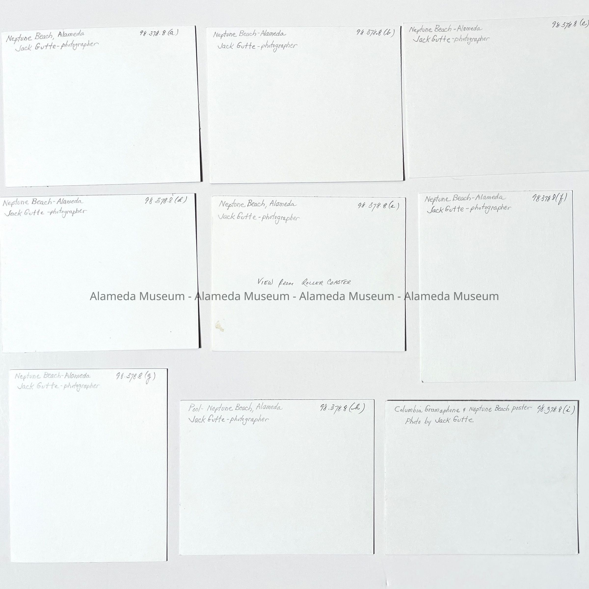Description: Set/10 prints, nine (#a-i) of which are modern black/white contact prints made from a negative of a photograph by Jack Gutte, Alameda; the tenth image (#j) is a vintage glossy print with lt. brown toning. All are unmounted.