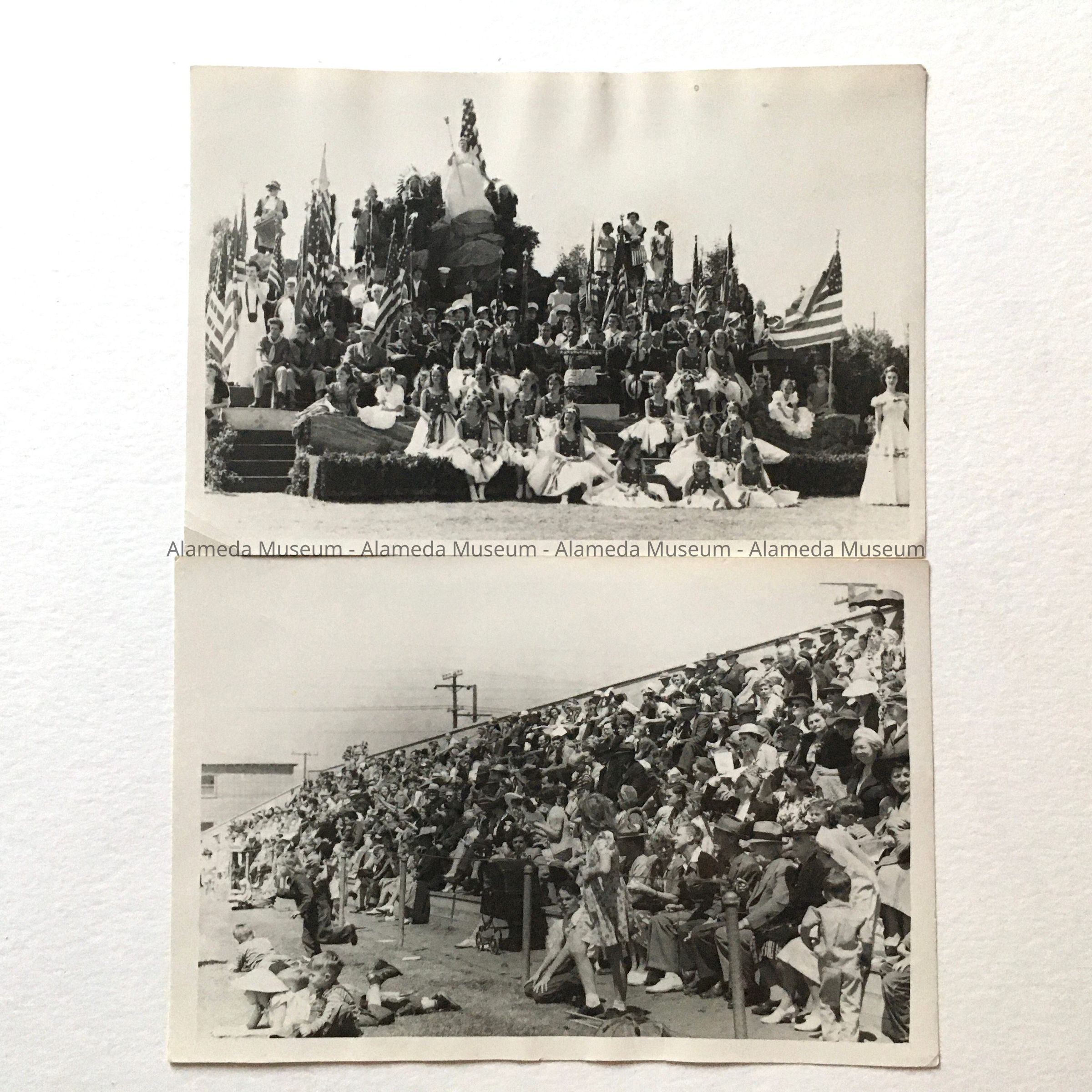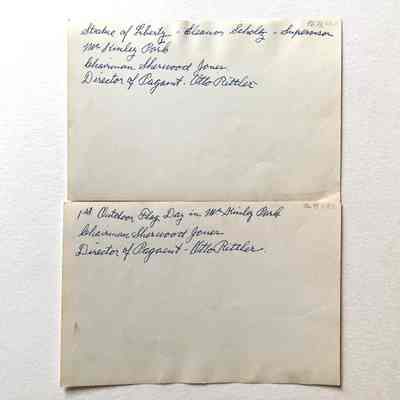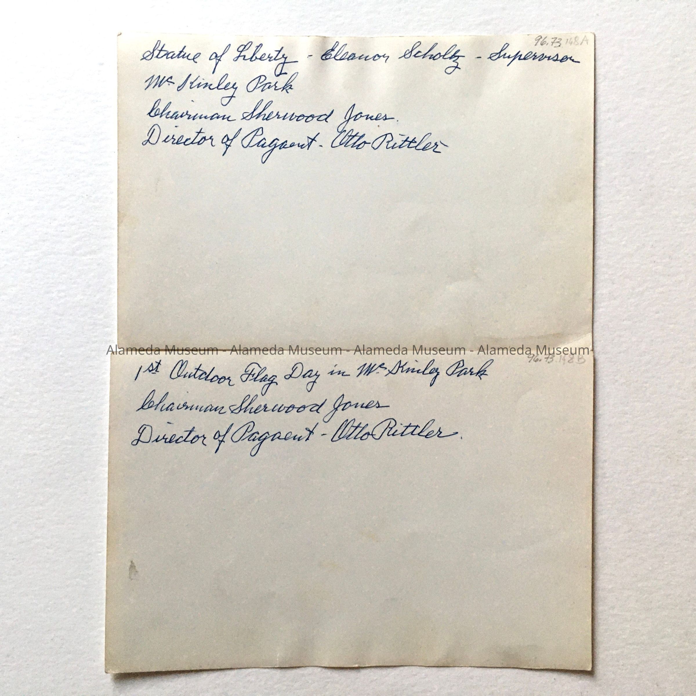 Two black-and-white glossy photos of participants (A) and audience (B) during a celebration. A has handwritten in blue pen on the back: ' Statue of Liberty - Eleanor Scholtz supervisor / McKinley Park / Chairman Sherwood Jones / Director of Pagaent - Otto Rittler'. B. has: 1st Outdoor Flag Day in McKinley Park / Chariman Sherwood Jones / Director of Pagaent - Otto Rittler'