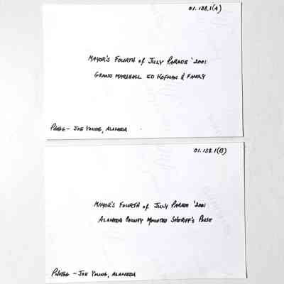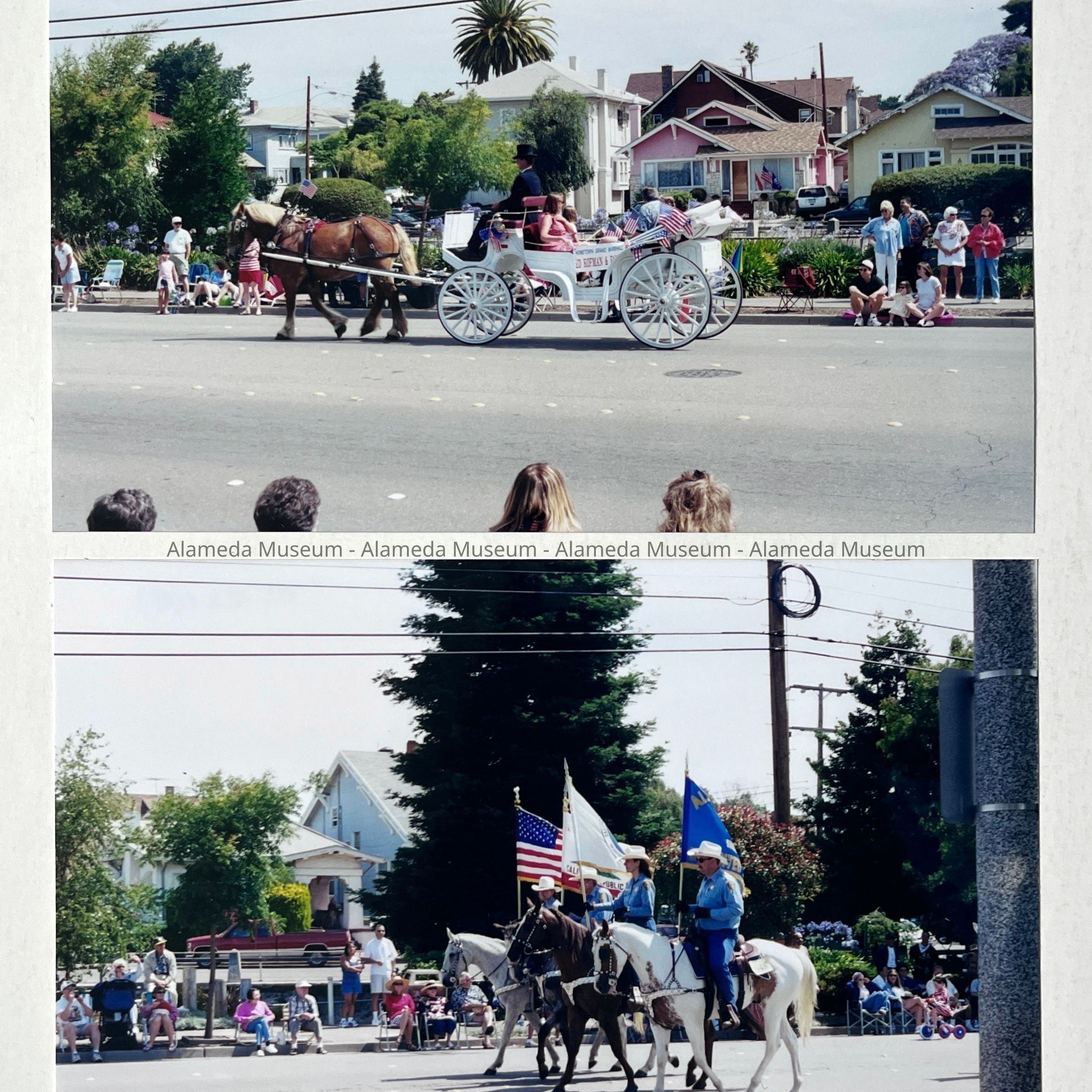 History of Object: Scenes from the annual Mayor's Fourth of July Parade: (A) Grand Marshall Ed Kofman and family riding in a horse-drawn carriage; (B) Alameda County Mounted Sheriff's Posse contingent.