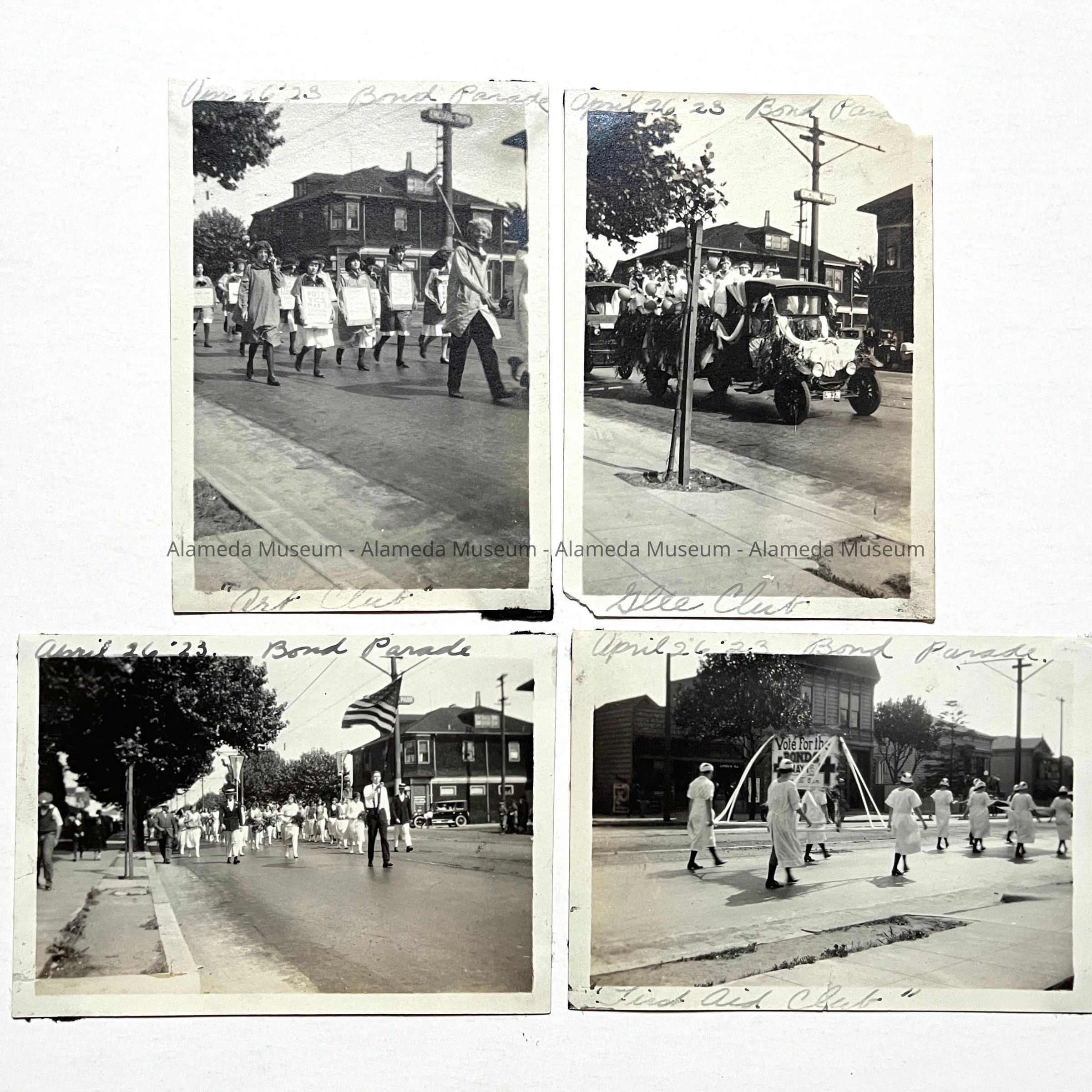 PHOTOGRAPHS OF VARIOUS PARTICIPANTS, VEHICLES, ETC. IN A BOND PARADE, ALAMEDA, APRIL 26, 1923. THE BOND DRIVE WAS POSSIBLY FOR THE THEN "NEW" ALAMEDA HIGH SCHOOL.