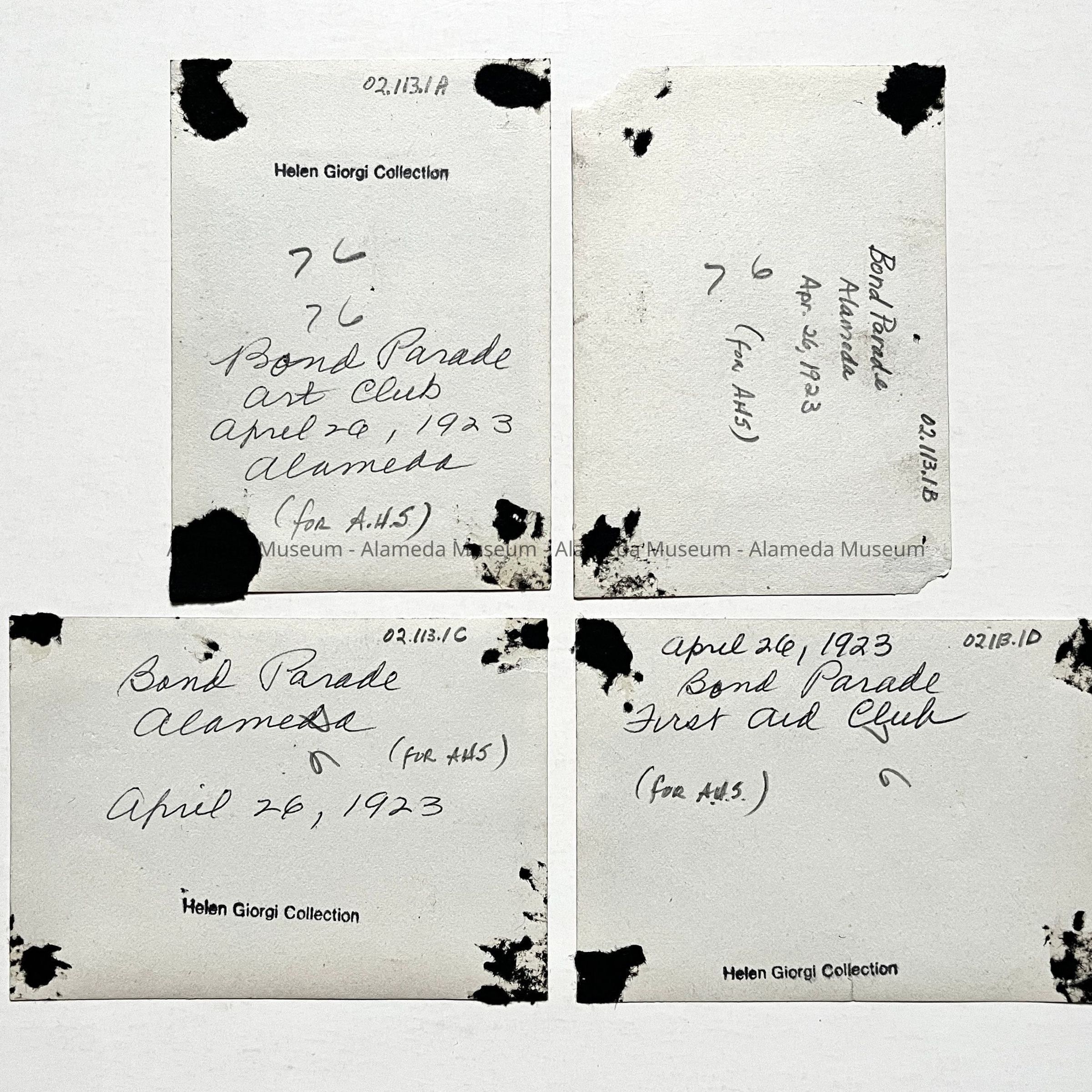 A SERIES OF FOUR BLACK-AND-WHITE SNAPSHOT PHOTOGRAPHS, UNSIGNED AND UNMOUNTED. FACES OF PHOTOS STATE, "APRIL 26, 1923 BOND PARADE."