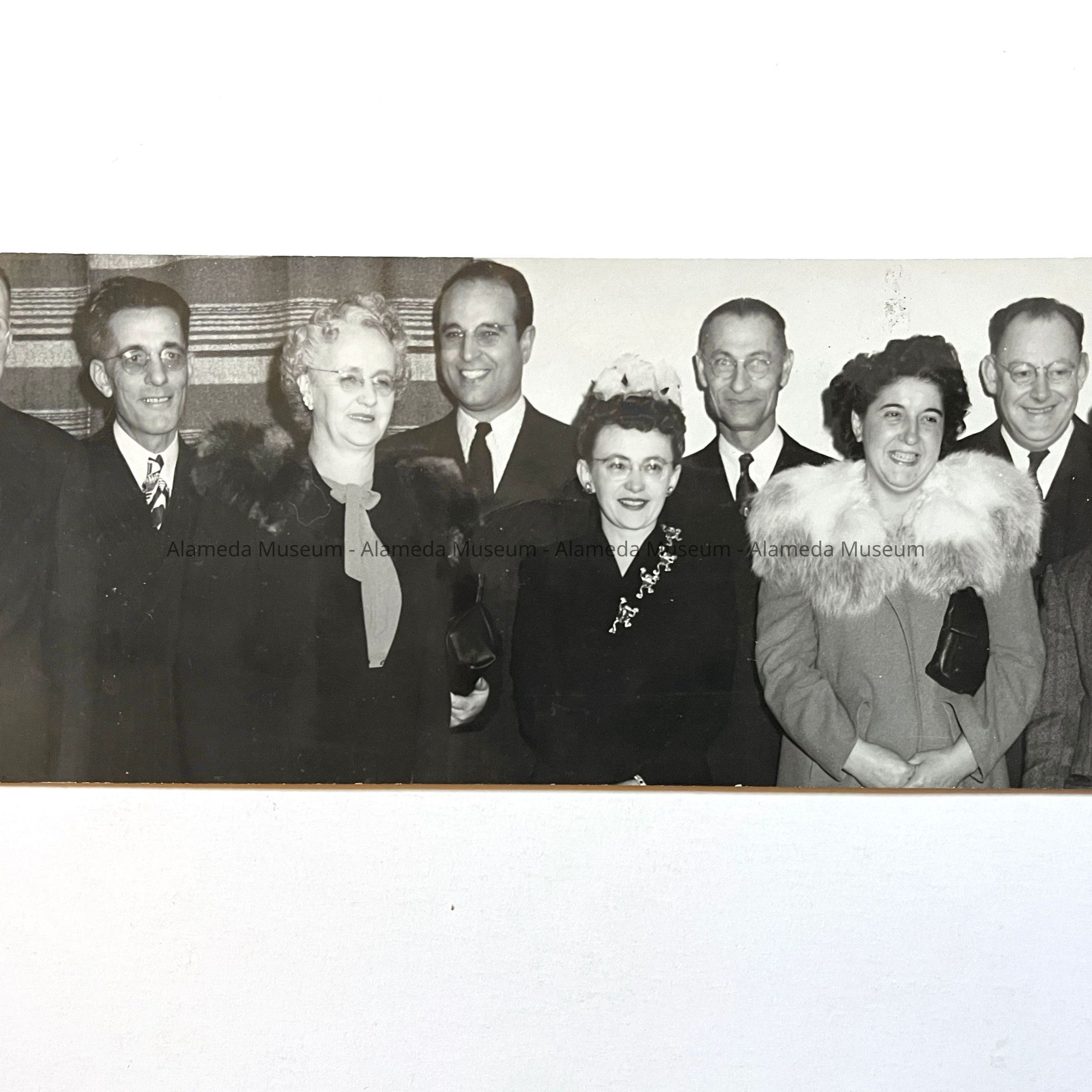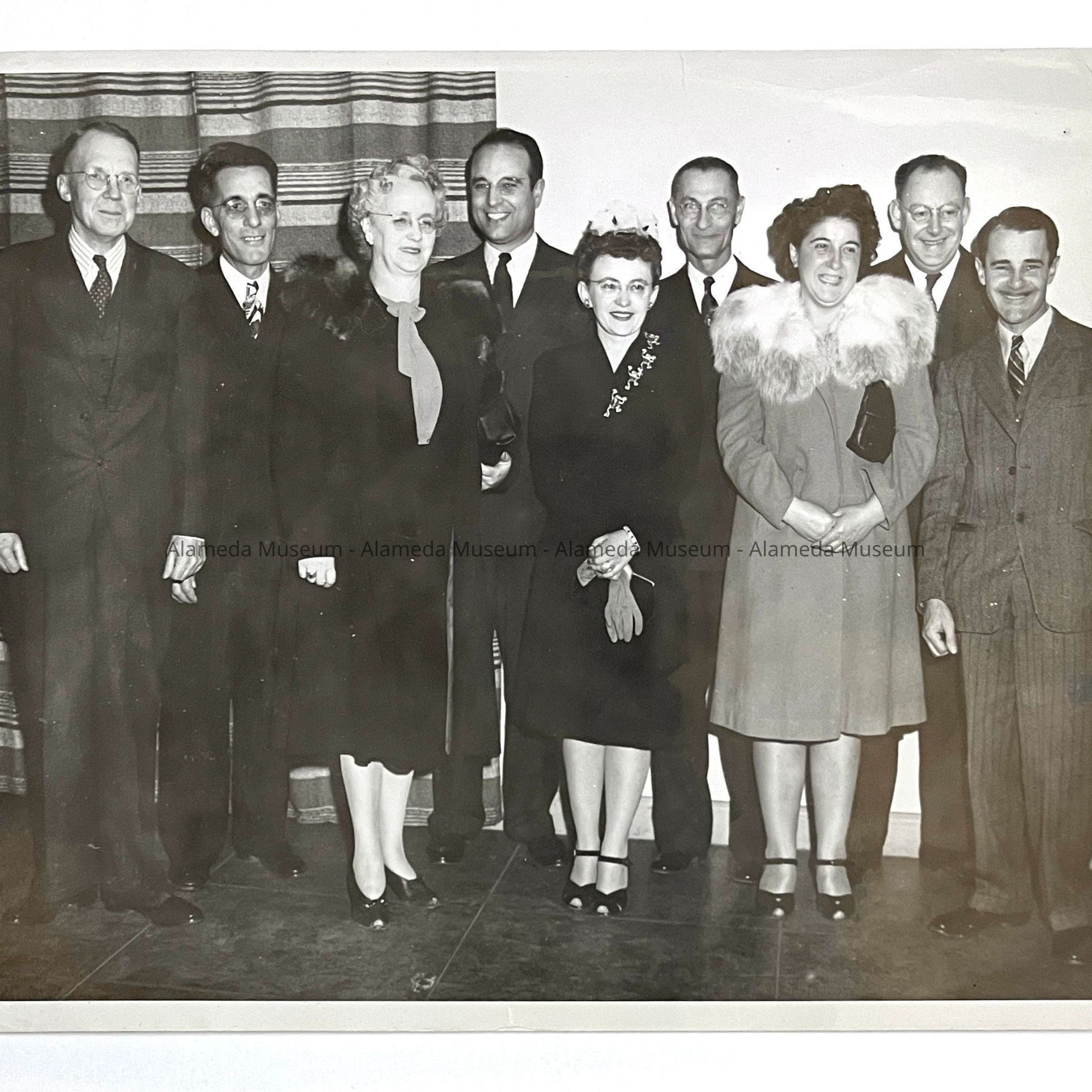 GROUP OF UNIDENTIFIED INDIVIDUALS, MALE AND FEMALE, WITH THE EXCEPTION OF FORD SAMUEL, POSTMASTER, CITY OF ALAMEDA. MR SAMUEL IS PICTURED FAR LEFT, WEARING GLASSES.
