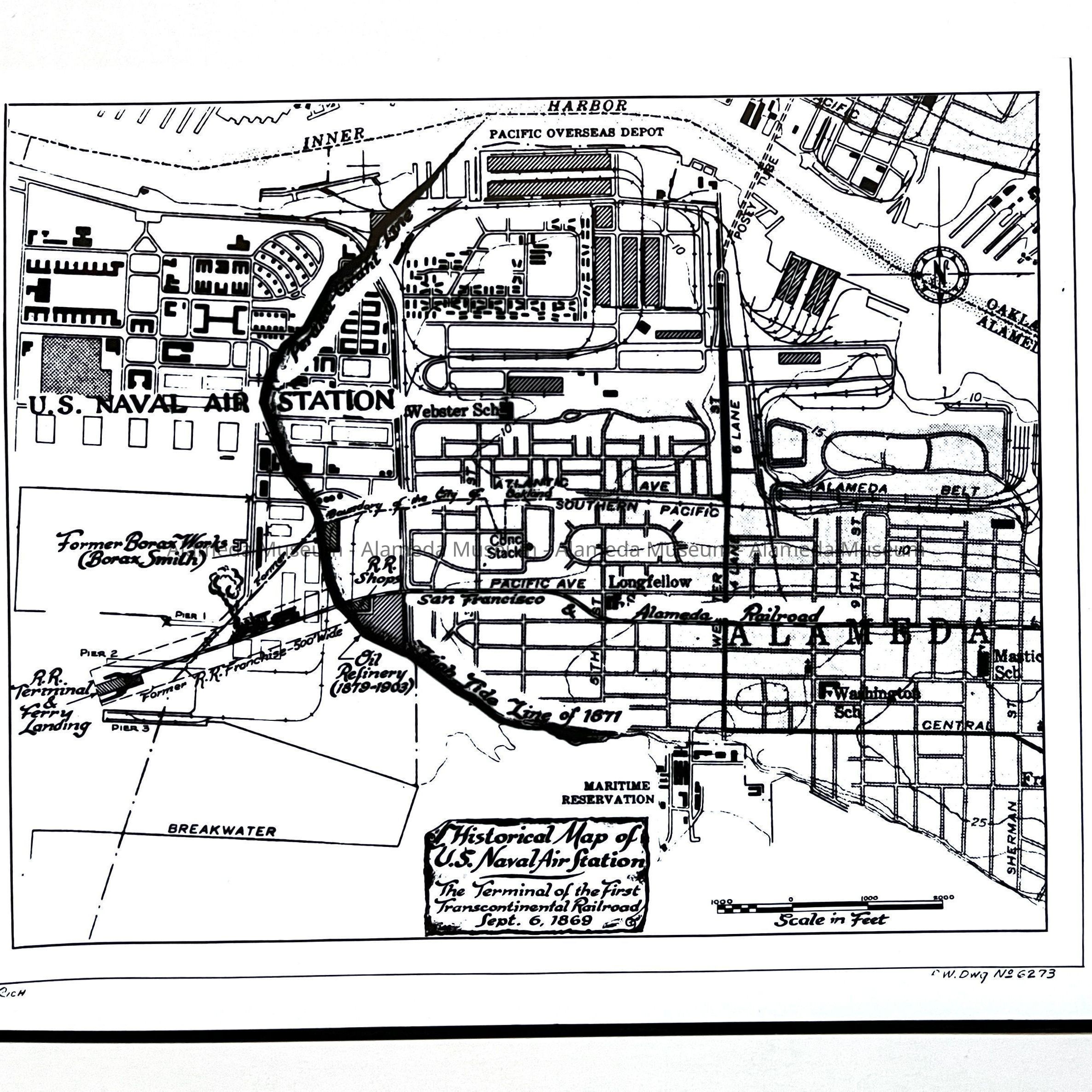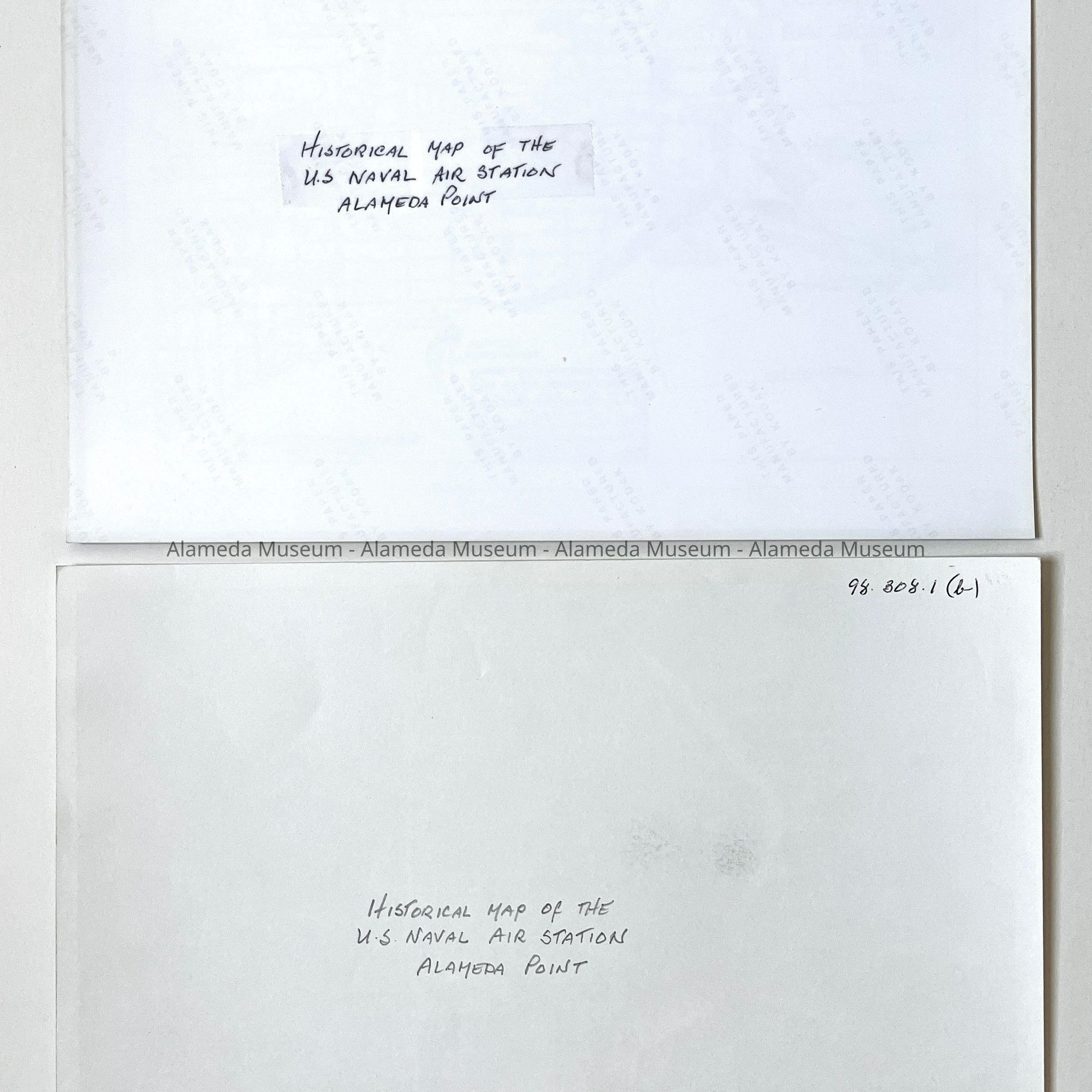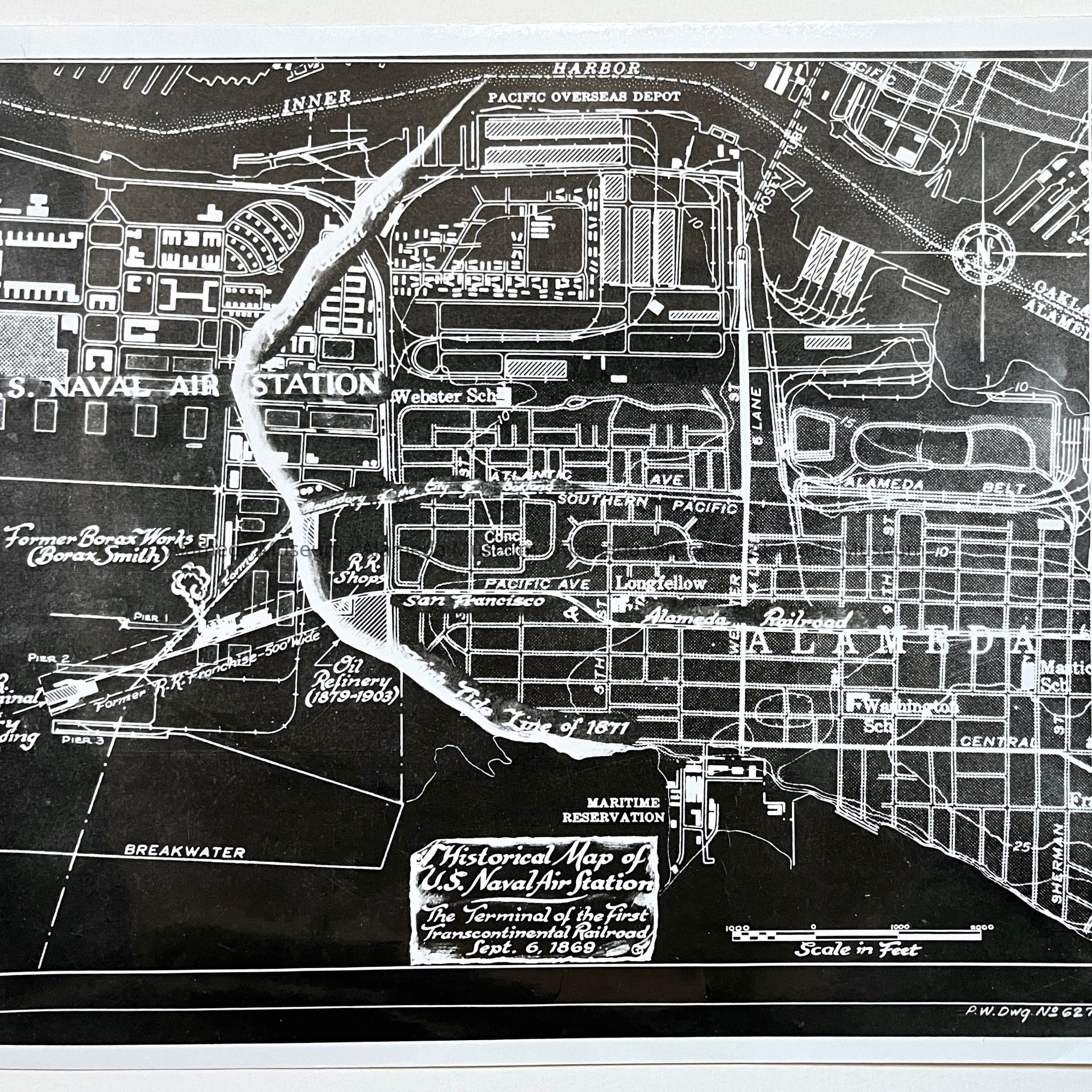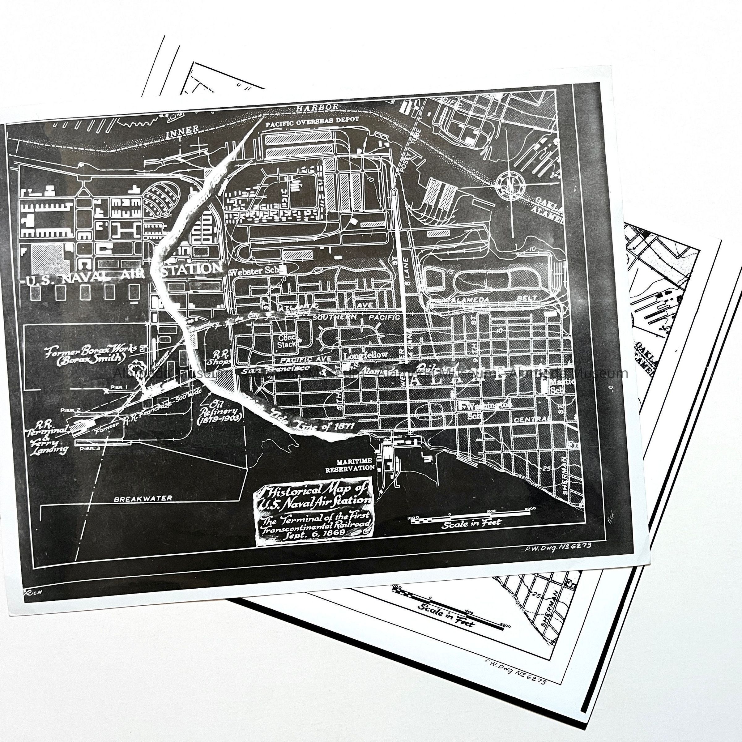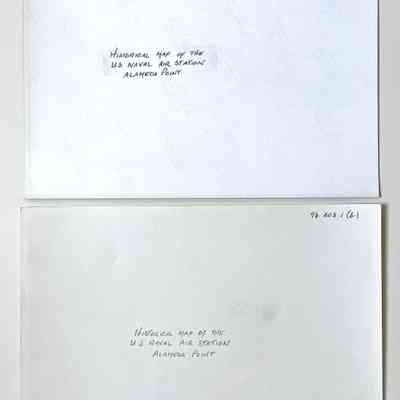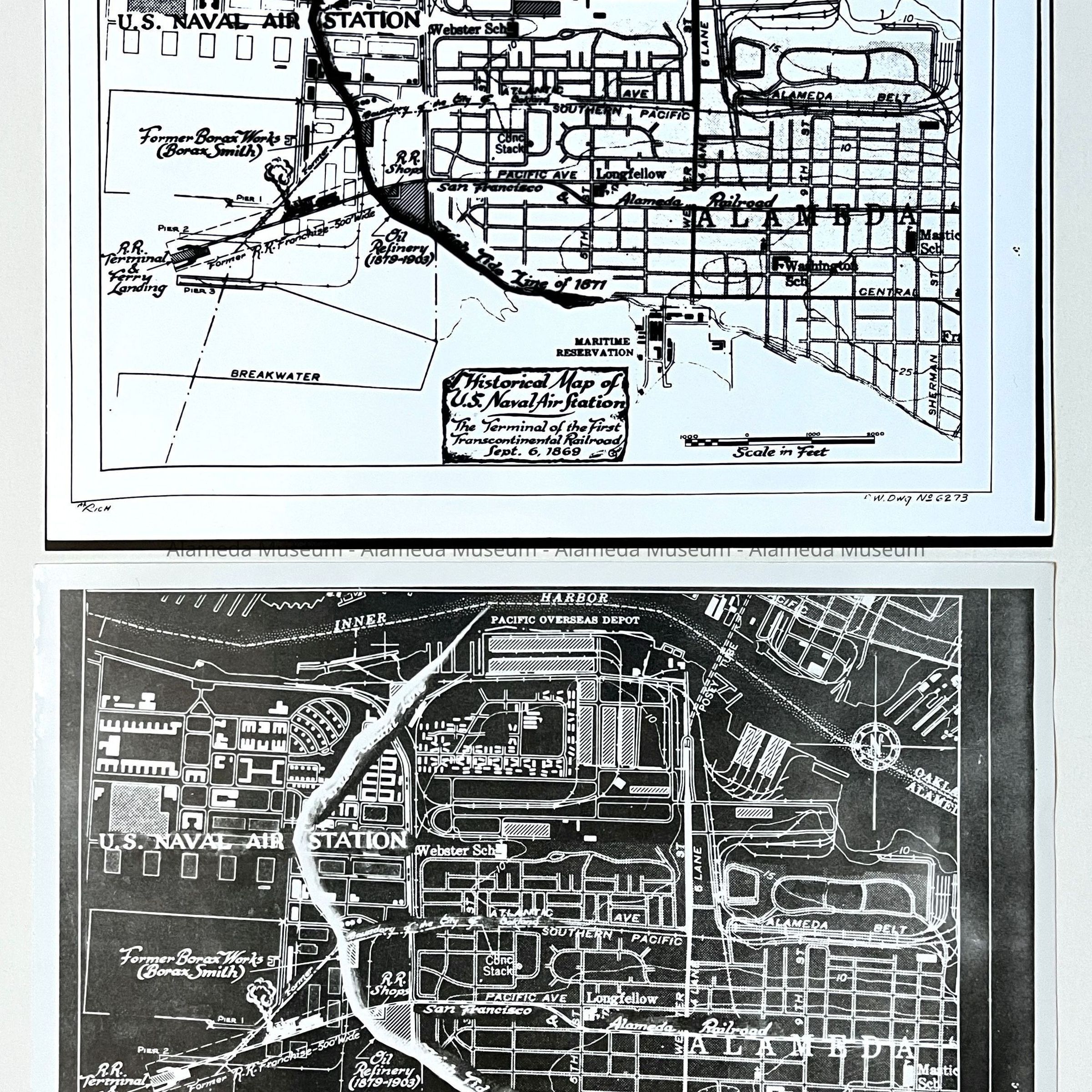 History of Object: Two photographs of a historical map of the U.S. Naval Air Station, Alameda: a) map with a white background; b) same, but with a black background due to a reversal process.