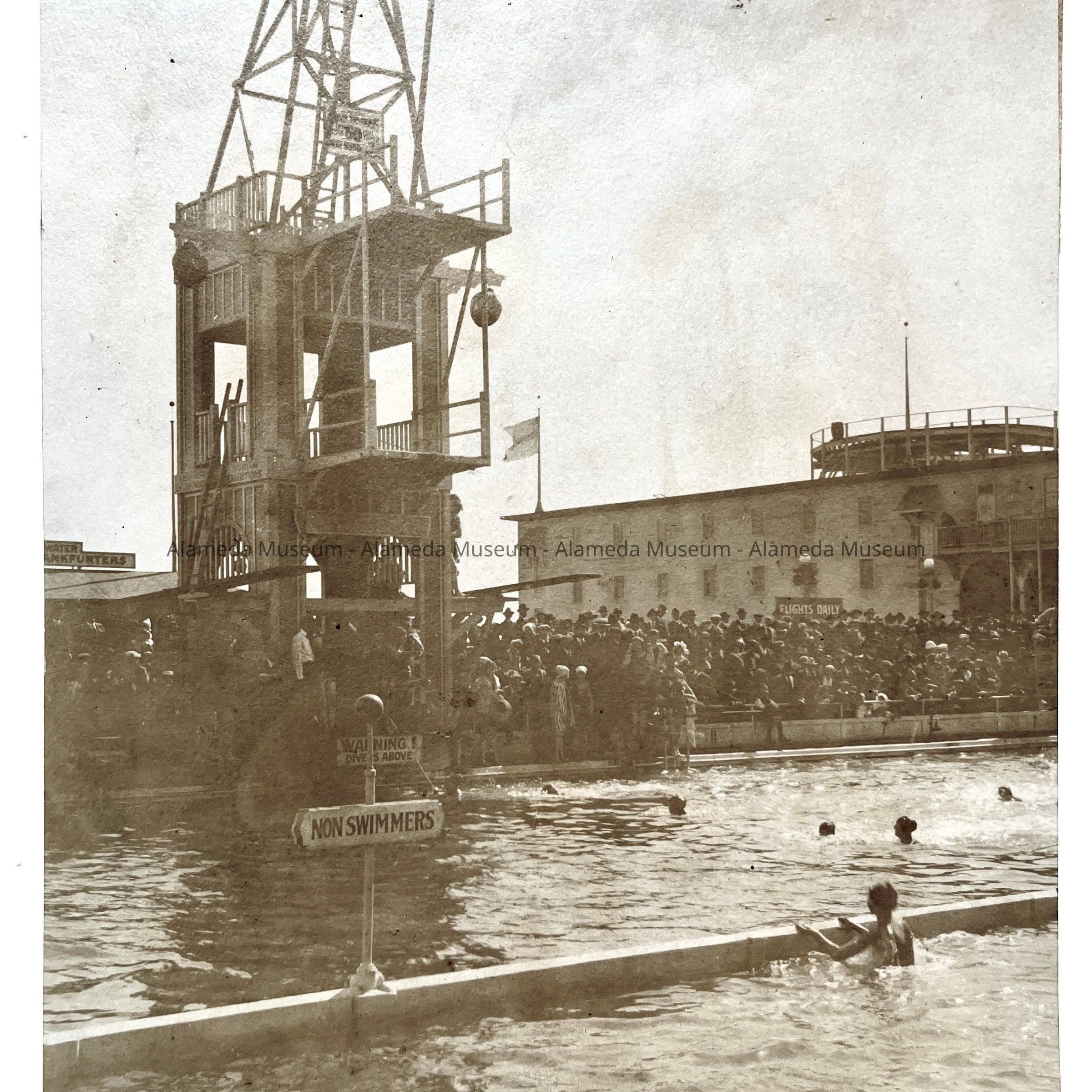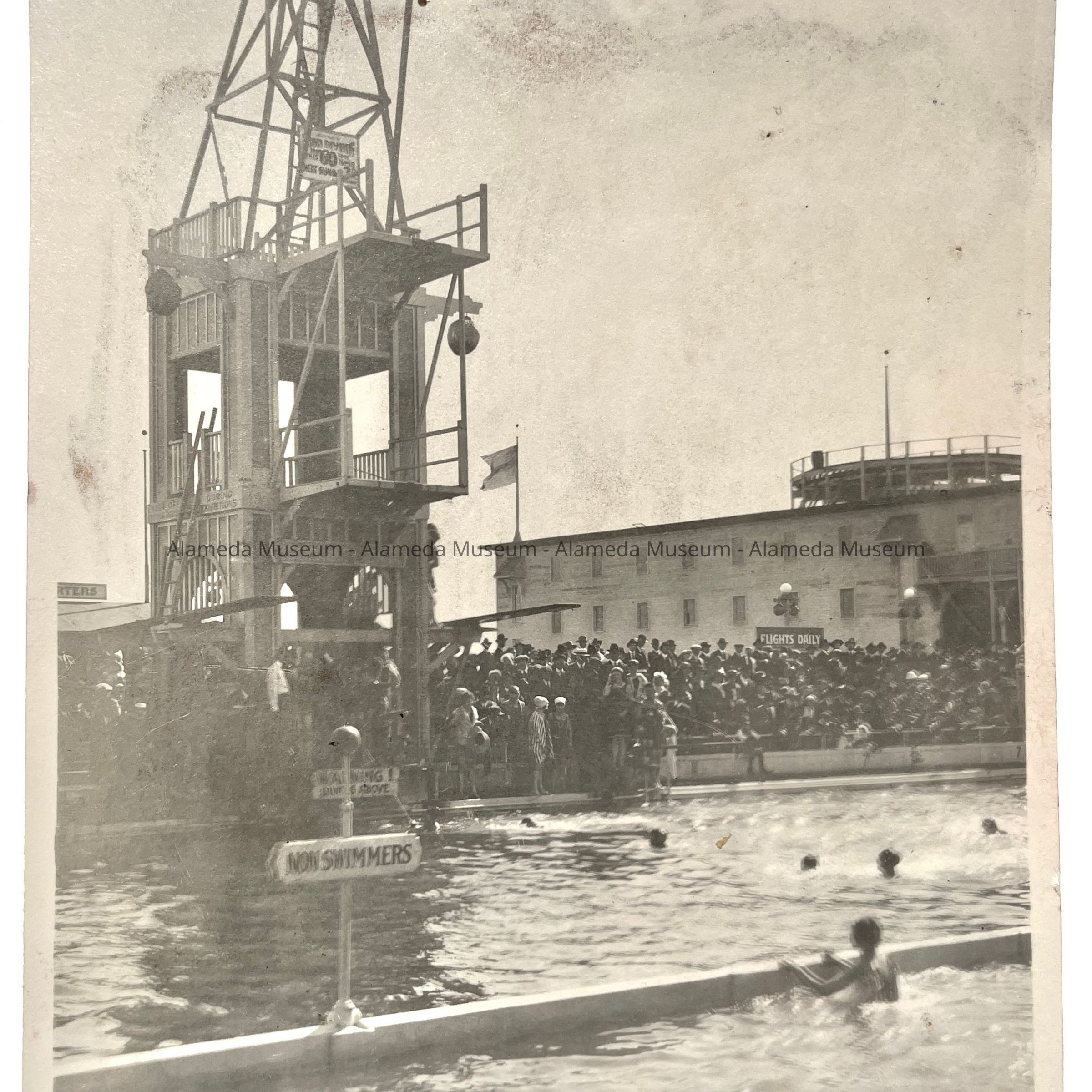 History of Object: View of a Neptune Beach swimming event. The large, tall diving platform is prominently featured.
