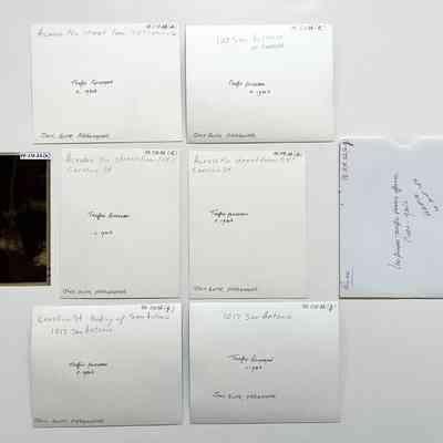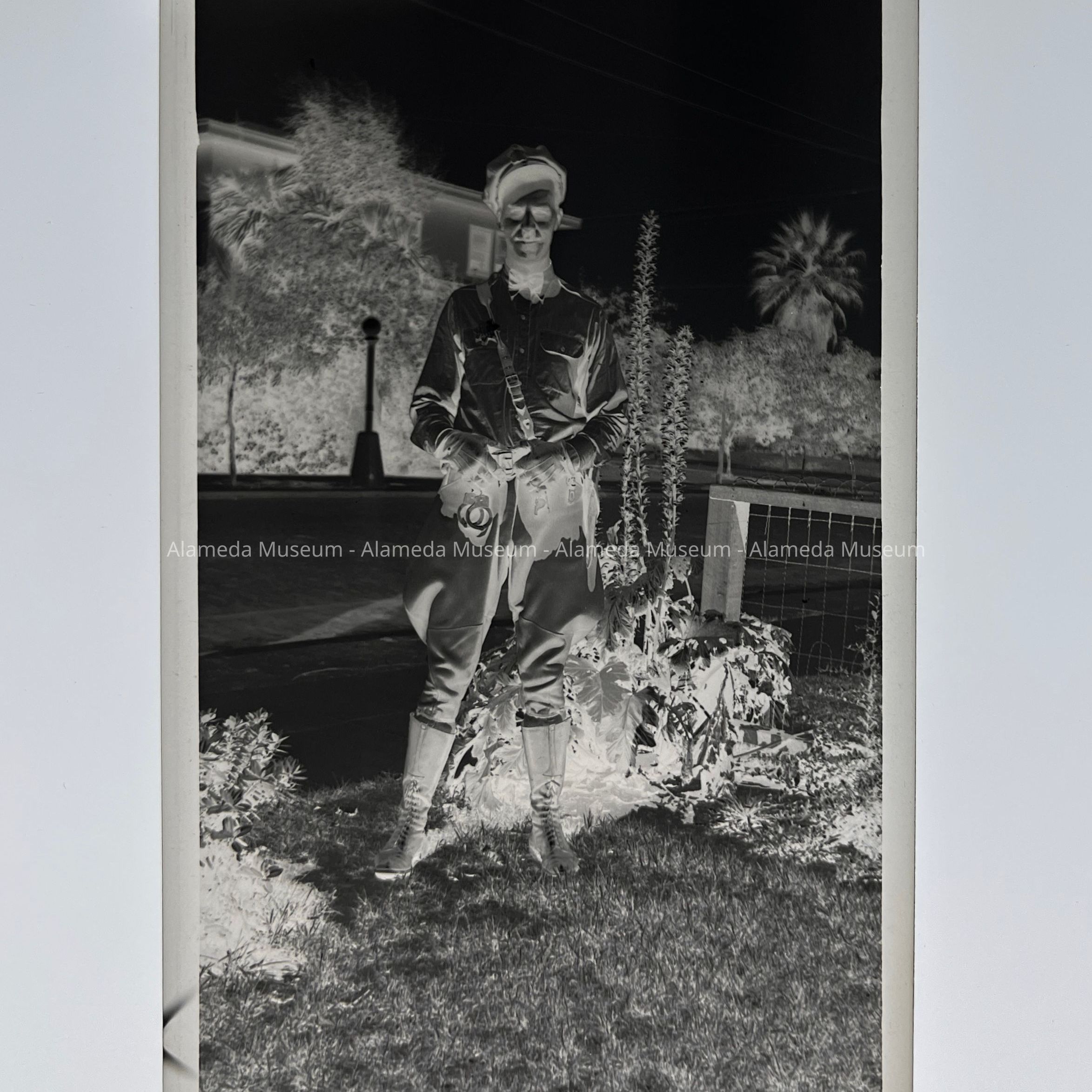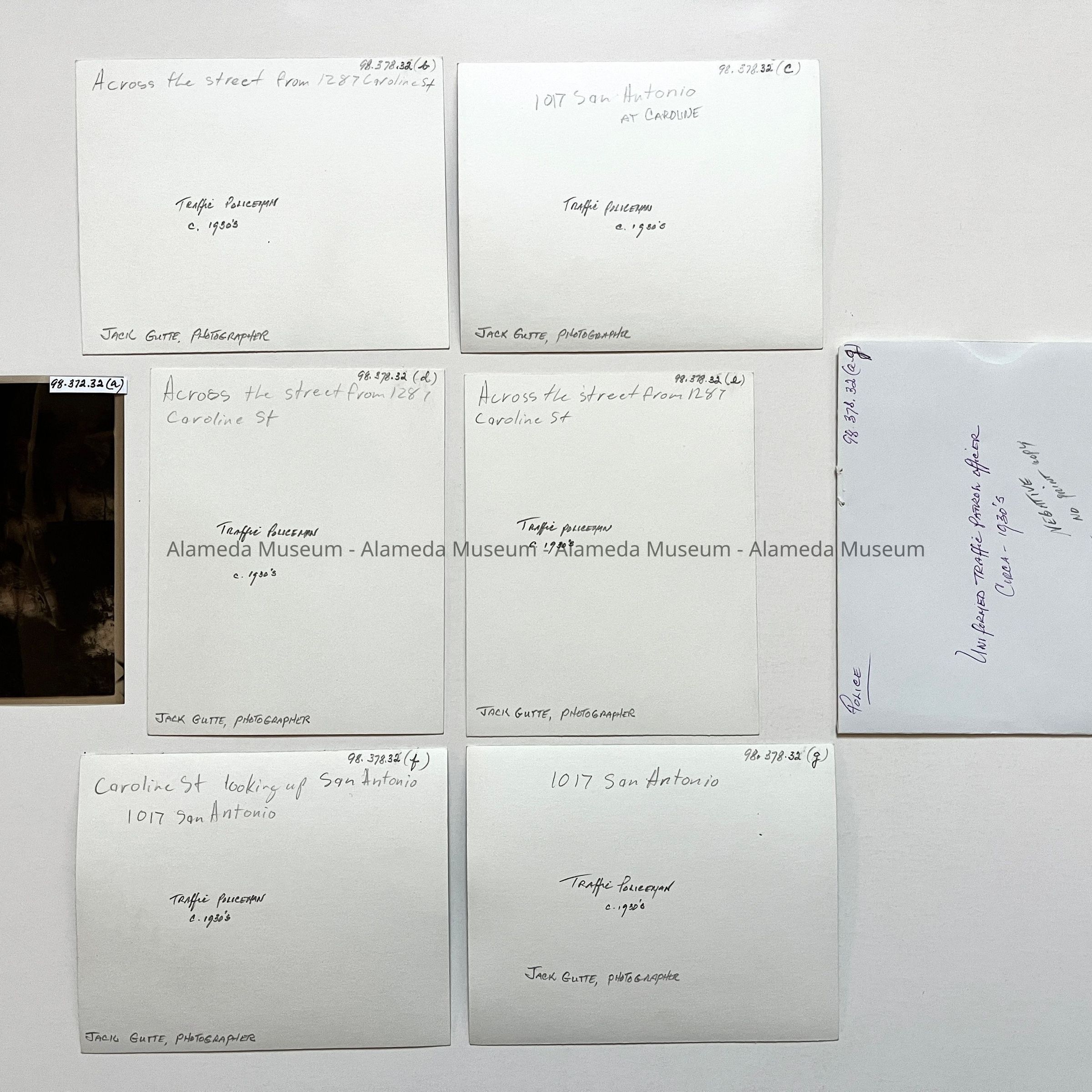 Description: Modern black/white contact prints developed by Dr. Vernon Rabbach, from photographic negatives taken by Jack Gutte, a professional Alameda photographer, as well as one undeveloped black celluloid photographic negative.