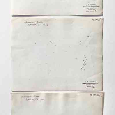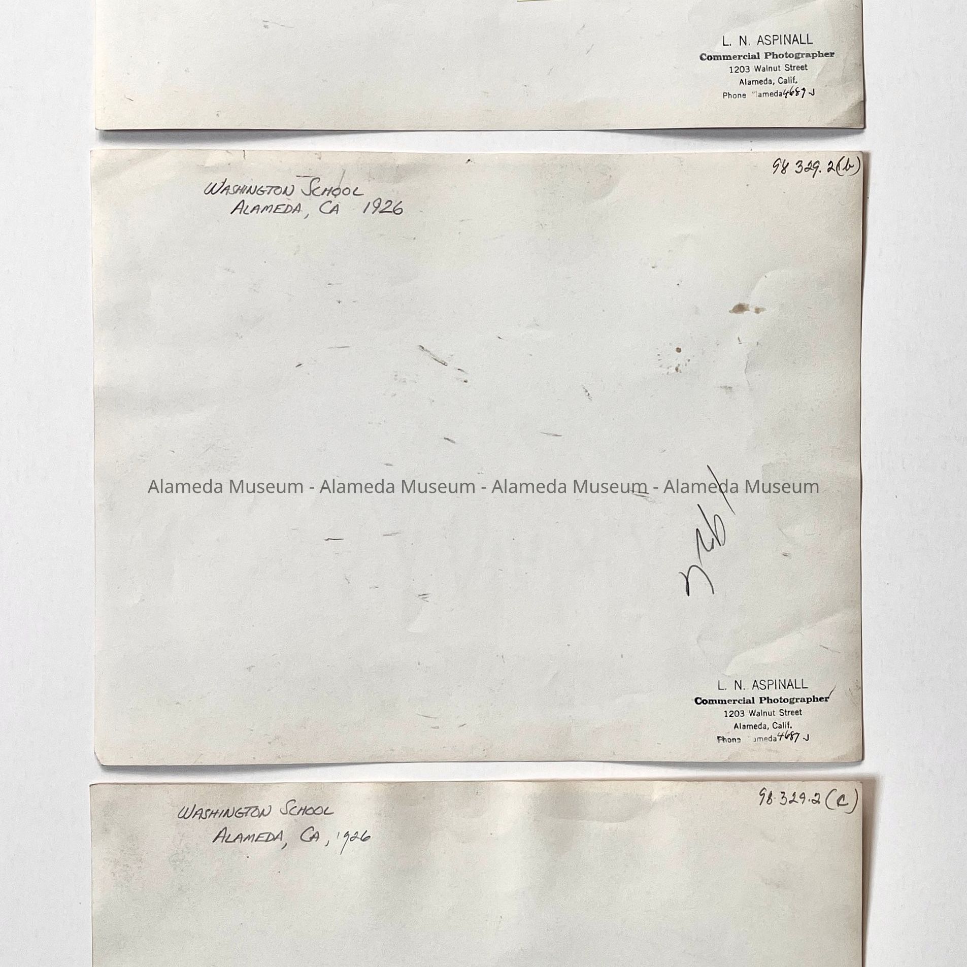 Description: Glossy black/white photos, unmounted. Photographer: L.N. Aspinall, 1203 Walnut St., Alameda (per black ink stamping on verso). Image #a has a vertical 1-in. tear at its lower left edge.
