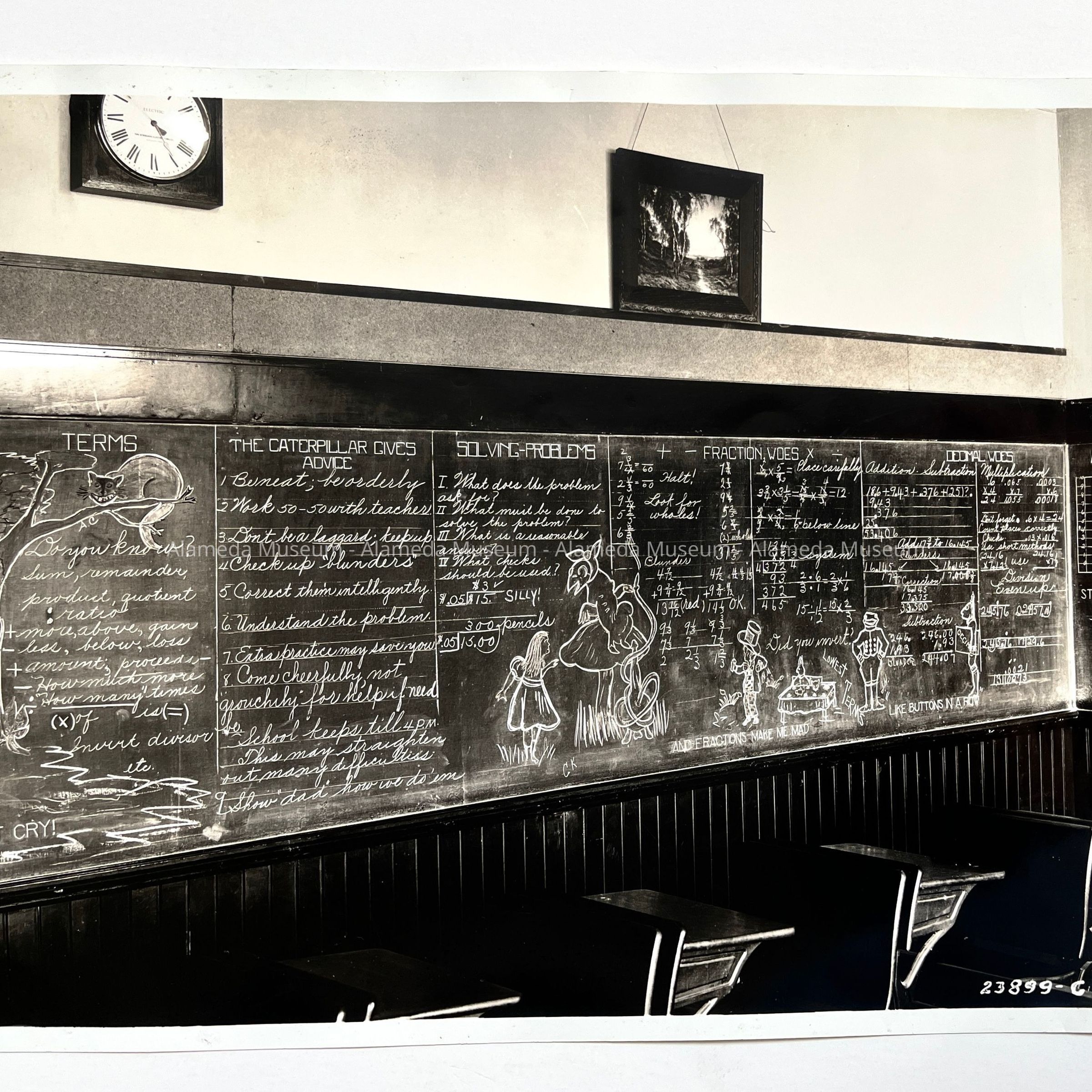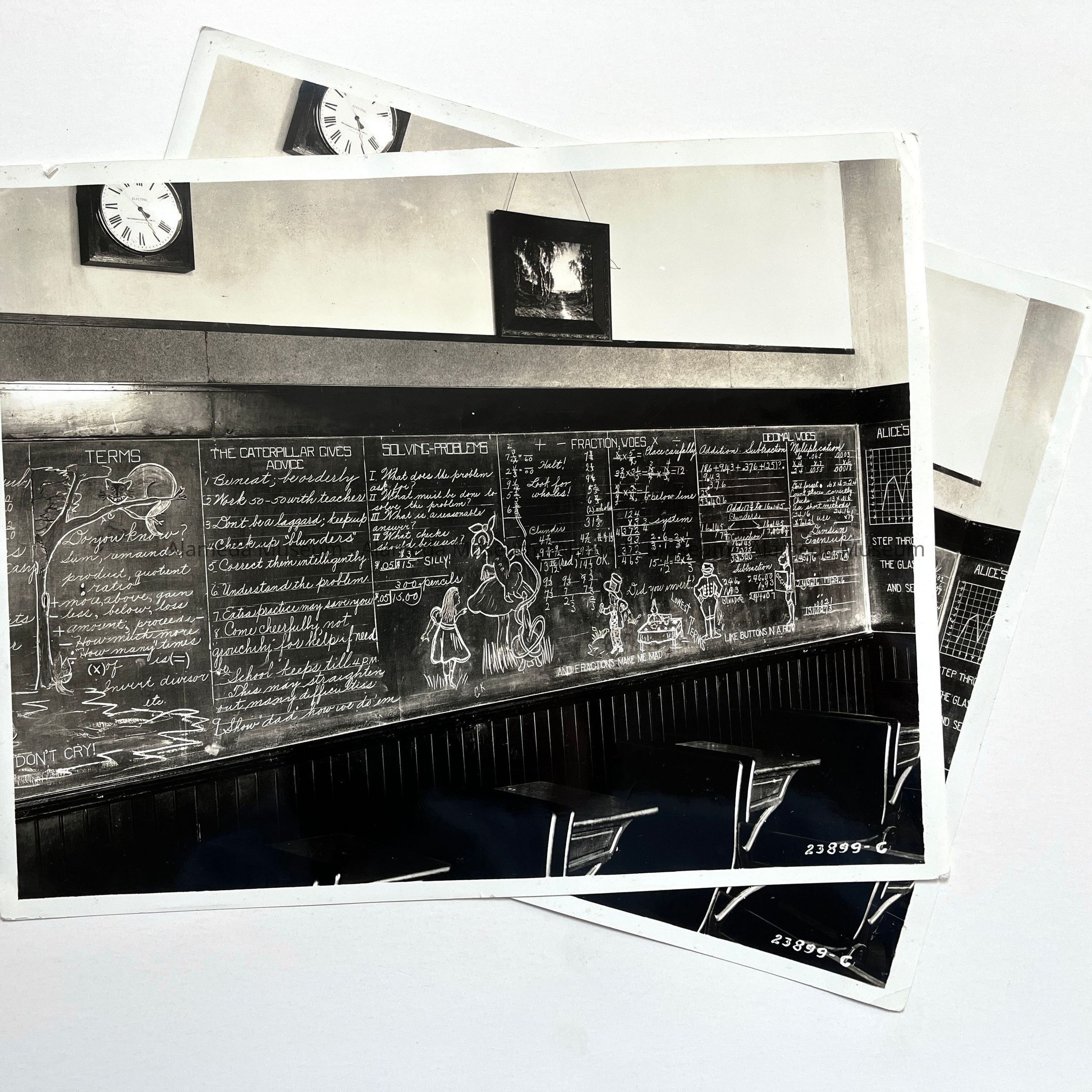 History of Object: Two identical views of a Washington School classroom interior showing extensive instructional material and illustrations upon the blackboards.