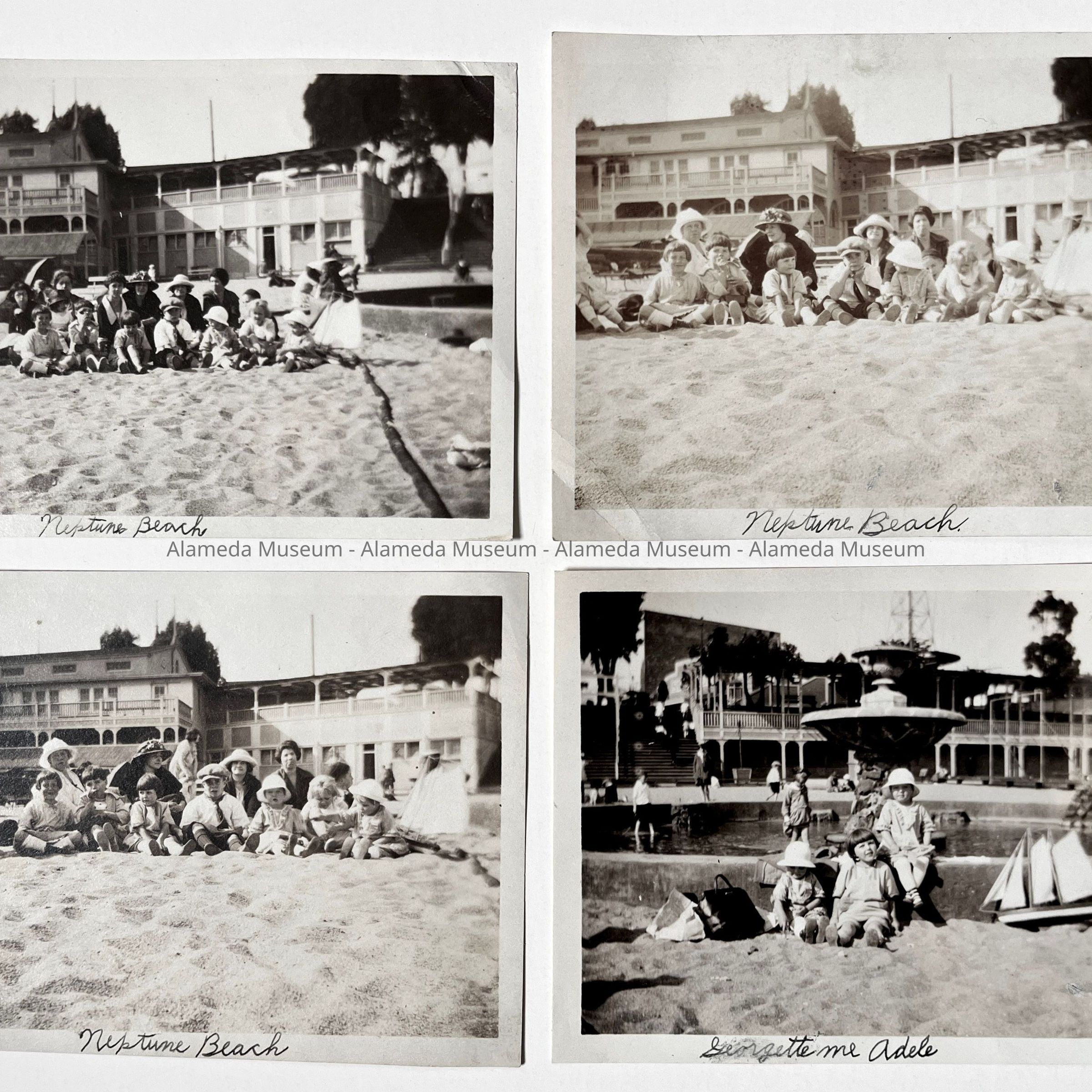 HISTORY OF OBJECTS: PHOTOGRAPHS OF AN UNIDENTIFIED WOMAN AND CHILDREN AT NEPTUNE BEACH, ALAMEDA. BUILDINGS AND FOUNTAIN CAN BE SEEN IN THE BACKGROUND.