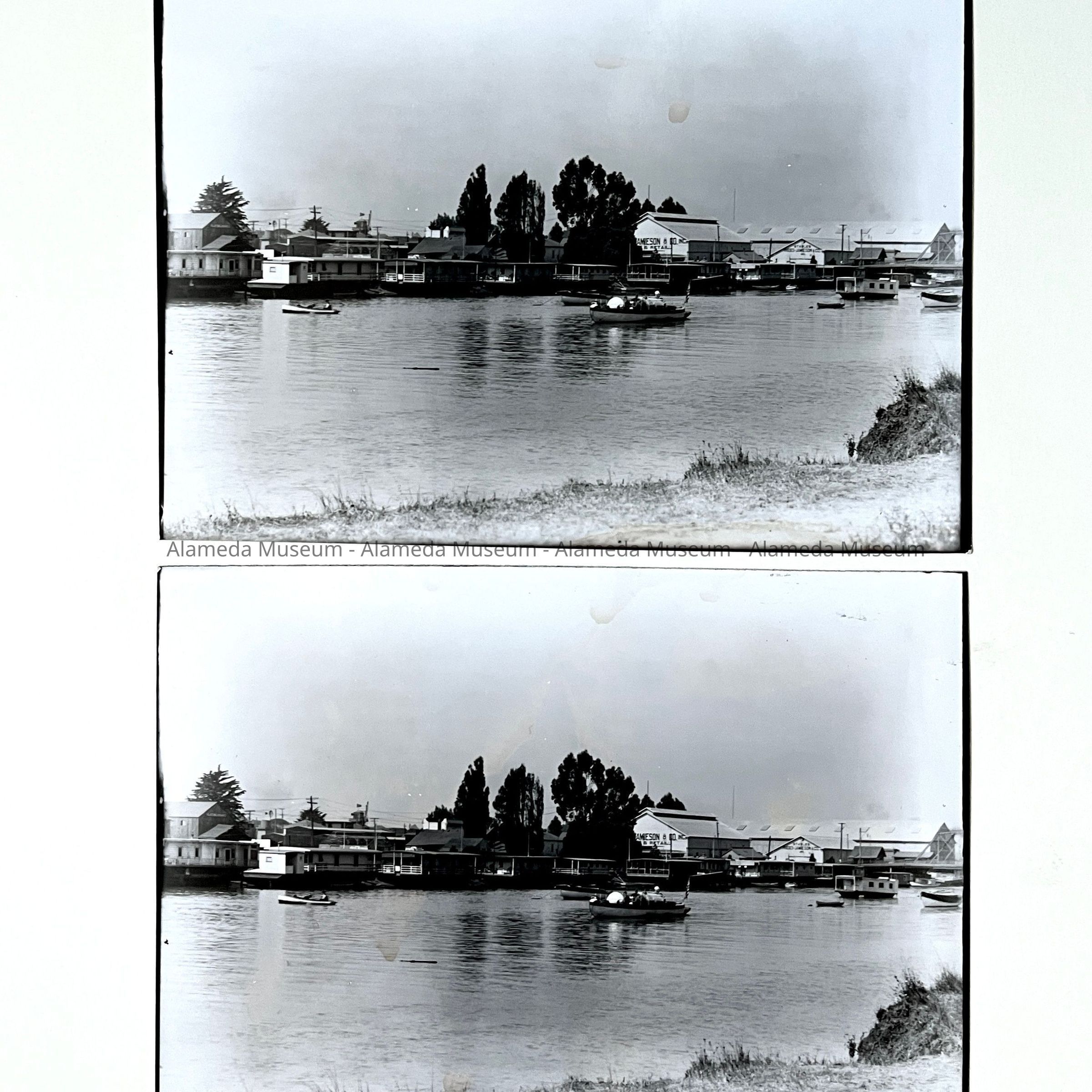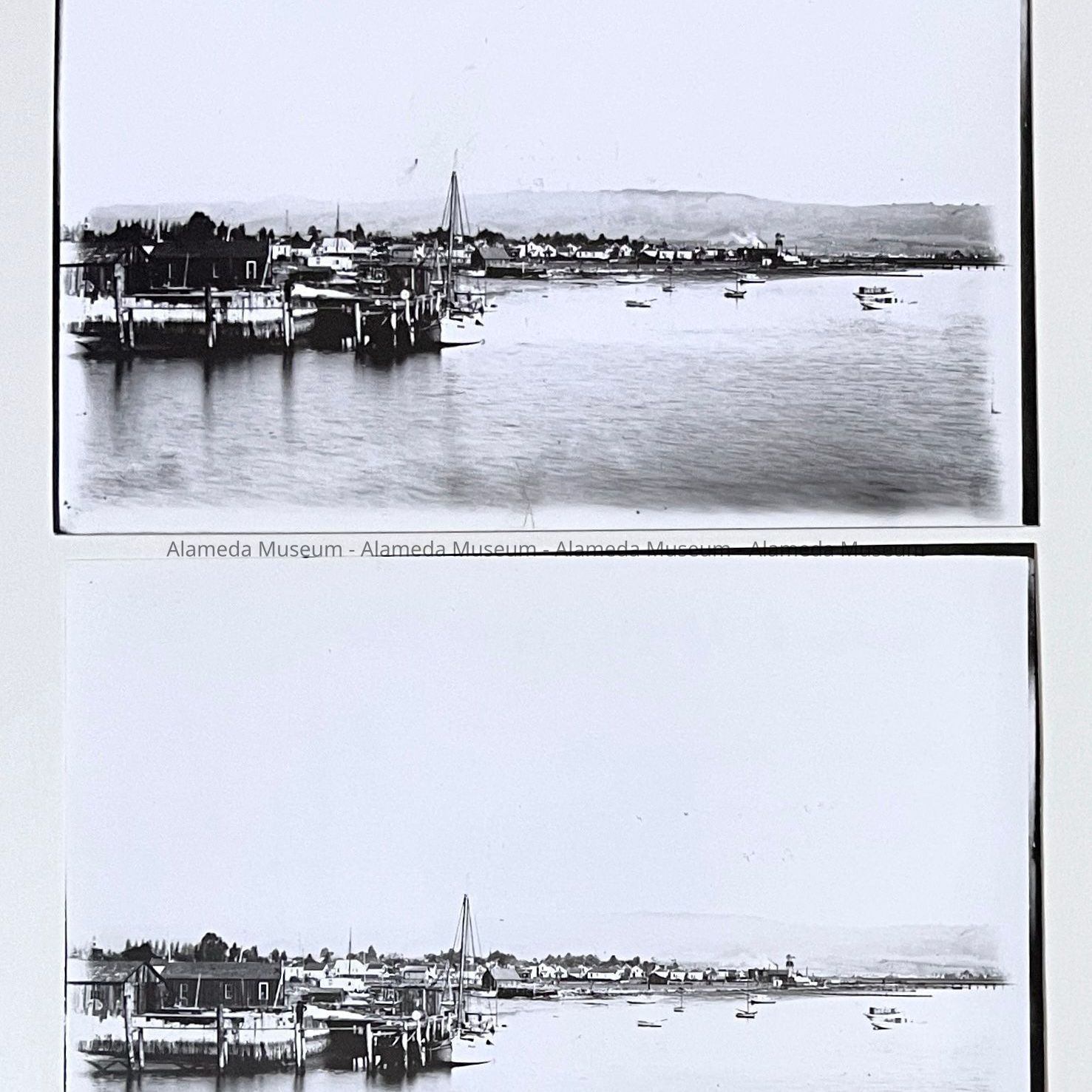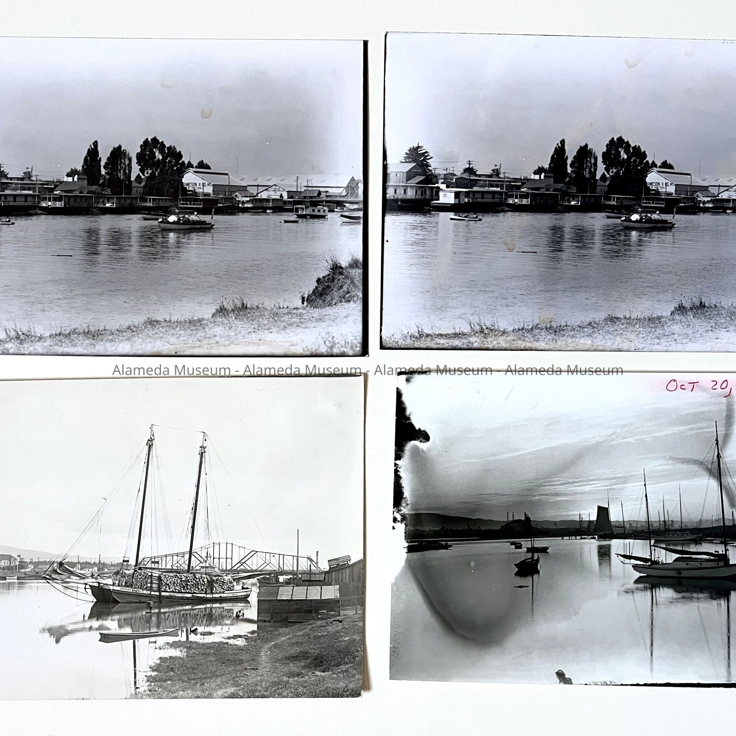 History of Object: Various views of Alameda: #a - Oakland-Alameda Estuary, many arks are docked along the bank; #b - identical to #a; #c - Shoreline, San leandro Bay looking North toward Oakland hills; #d - identical to #c; #e - Grand Avenue; #f - Santa Clara Ave. looking West, probably from City Hall tower; #g - Entrance to Cohen Estate, Fernside; #h - Oakland-Alameda Estuary showing lumber boat "Caroline Dixon" in foreground; #i - sailboats, Oakland-Alameda Estuary; #j - Sailboat on San Leandro Bay, near Bay Farm Island.