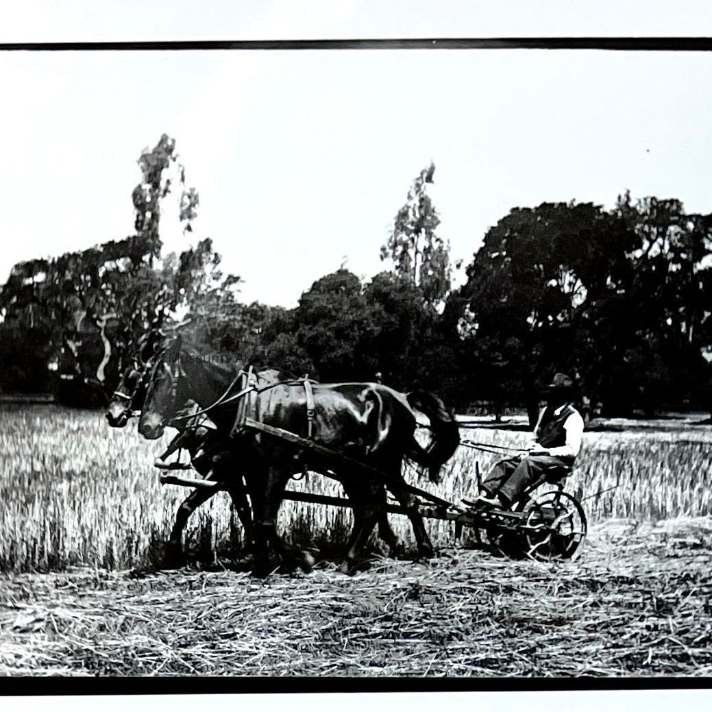 History of Object: Various Alameda scenes: #a - original house on Cohen Estate, Fruitvale; #b - the stable on the Cohen Estate; #c - summer house at Shell Rd., Fernside; #d - tree near Smith property, Fernside; #e - mowing grain, Cohen Estate, Fernside; #f - entrance to the Cohen Estate, Fernside; #g - East side of bowling alley and summer house on the Fernside estate of A.E. Cohen; #h - similar view, but with two small children present; #i - Alameda shore, at San Leandro Bay; #j - distant view of prior scene; #k- view of railroad crossing and Oakland in distance taken from a marshy location; #l - sailboats at dock in the Oakland-Alameda Estuary.