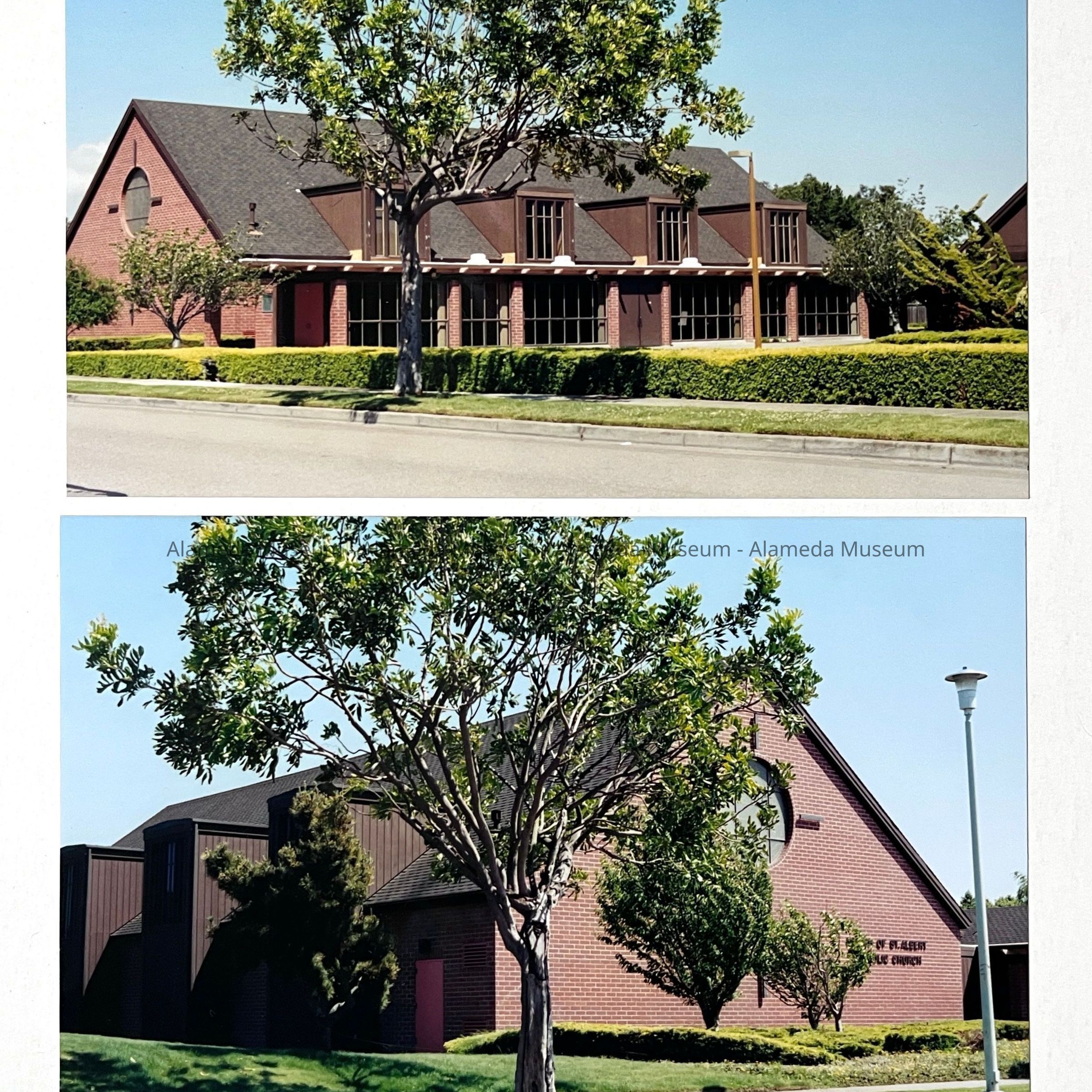 History of Object: Views of two Alameda church structures: (A-B) St. Albert the Great Catholic Church, Bay Farm Island; (C-D) Alameda Seventh Day Adventist Church, et. Verdi Street.