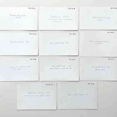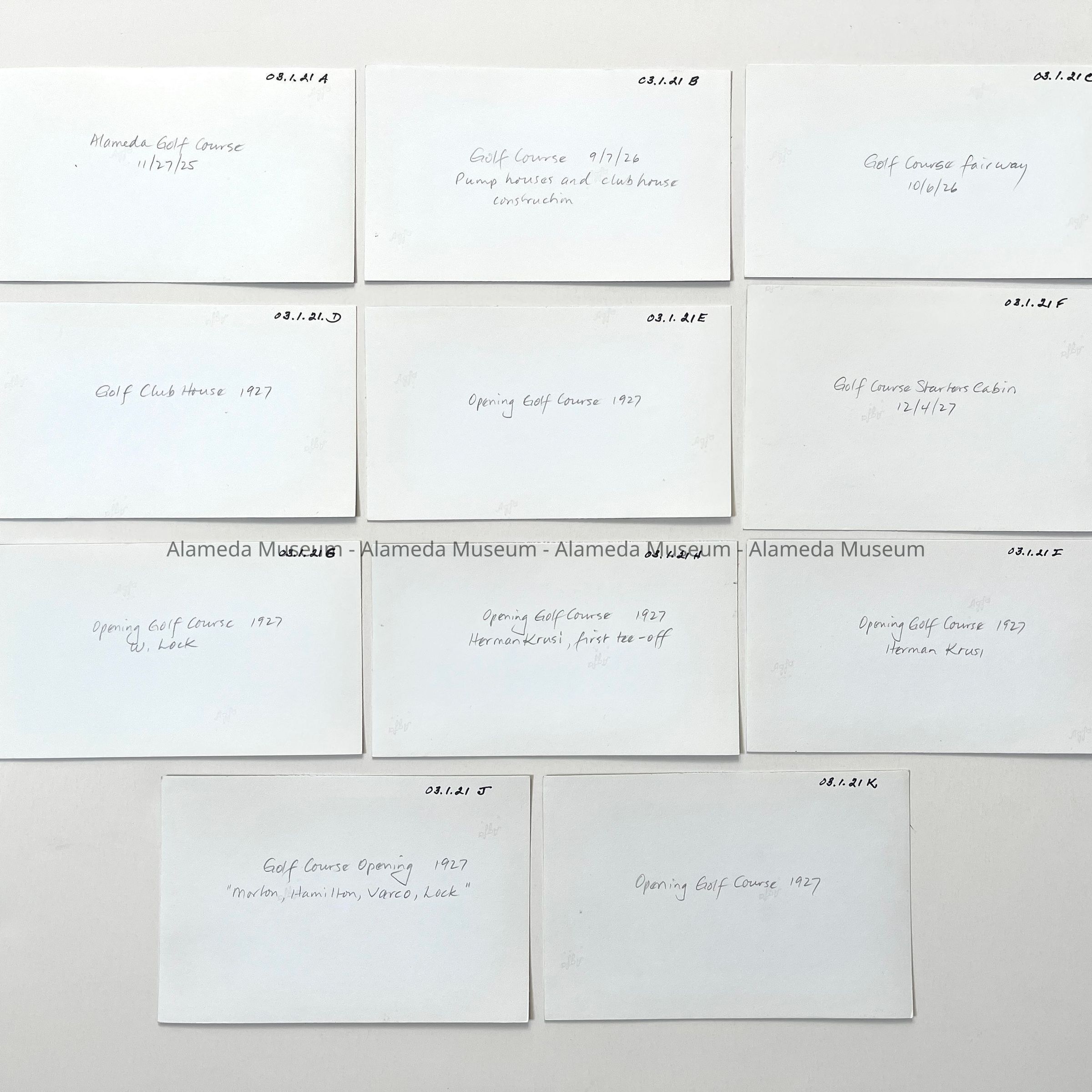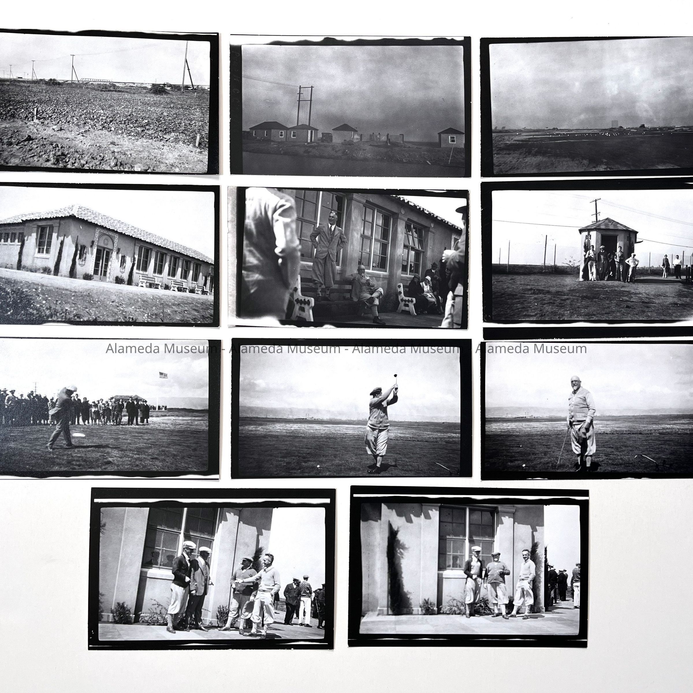 History of Object: Alameda Golf Course scenes: A-C) course construction views; D) completed Club House; E) opening day crowd, 1927; F) starters cabin; G) player (W. Lock) teeing off; H-I) Herman Krusi making the first tee-off, opening day; J-K) opening day golfers in front of the Club House.