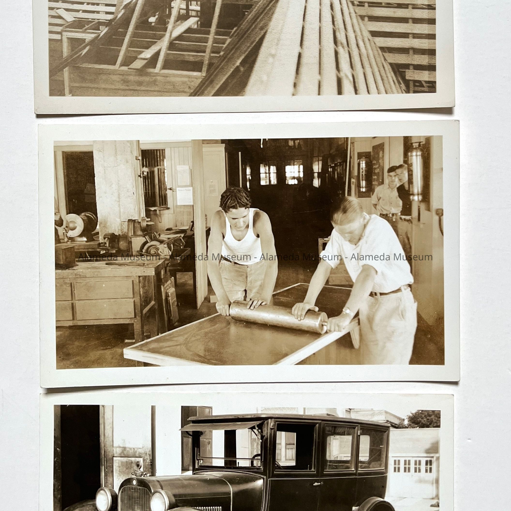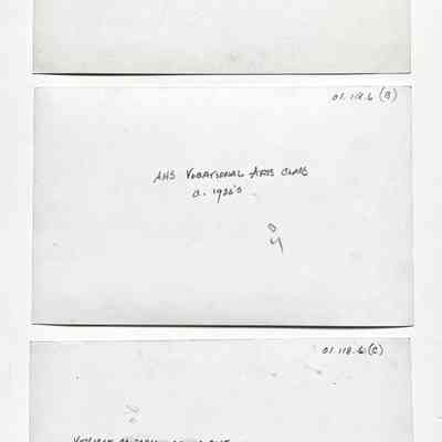History of Object: Three AHS vocational arts scenes: (A) carpentry students on top of the roof of a residence they are constructing; (B) machine shop students using a roller; (C) repaired vehicle completed by the automotive class.