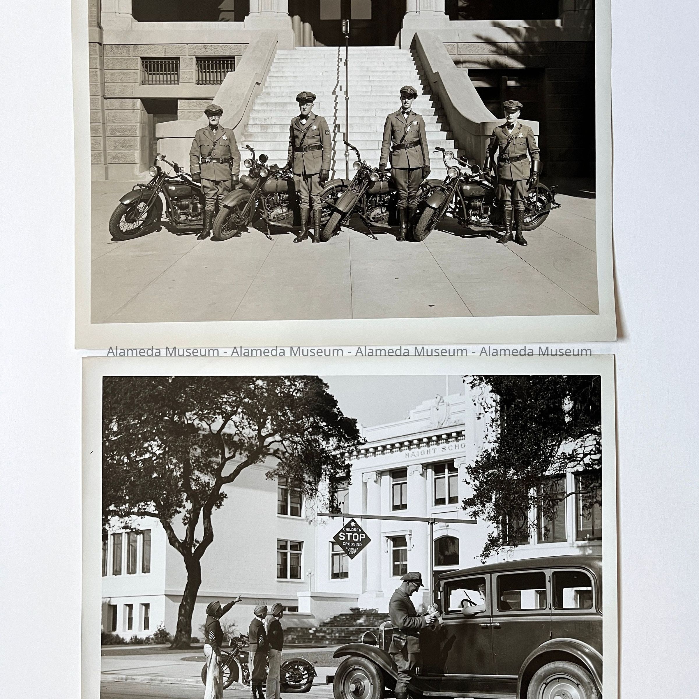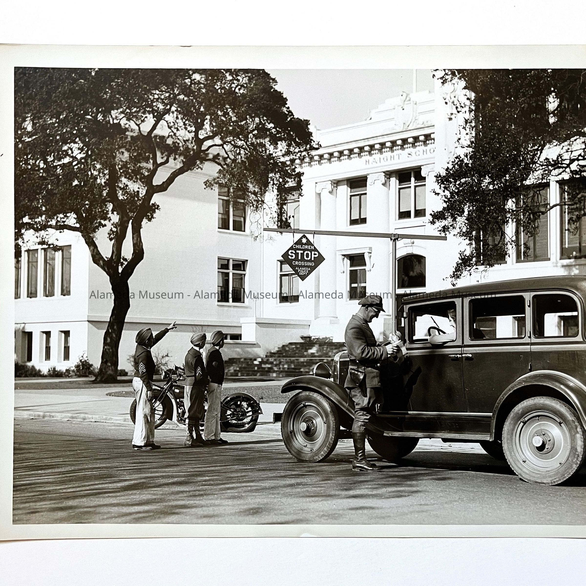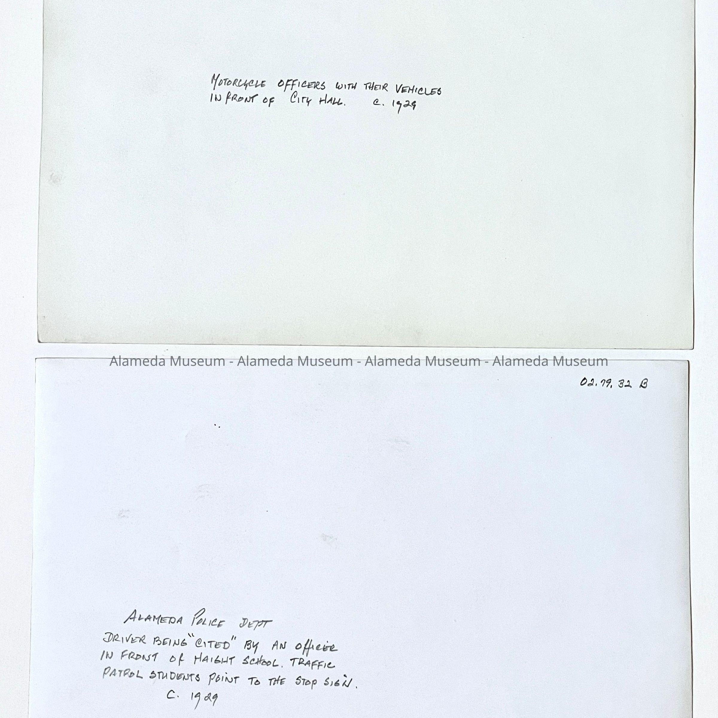 History of Object: Alameda Police Department scenes: A) motorcycle officers with their vehicles posed in front of City Hall; B) Haight School crosswalk showing a policeman "ticketing" a driver as traffic patrol students point to the "children crossing" stop sign.