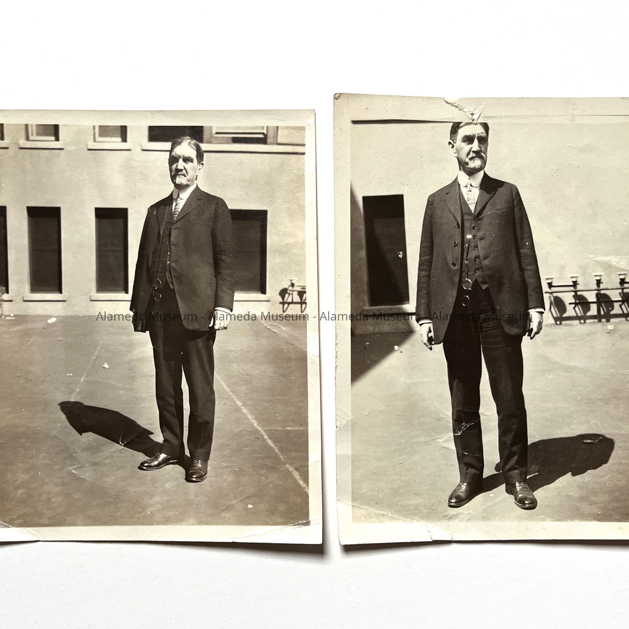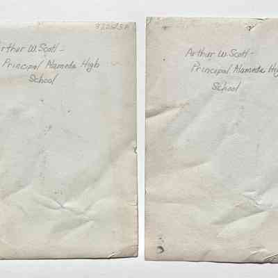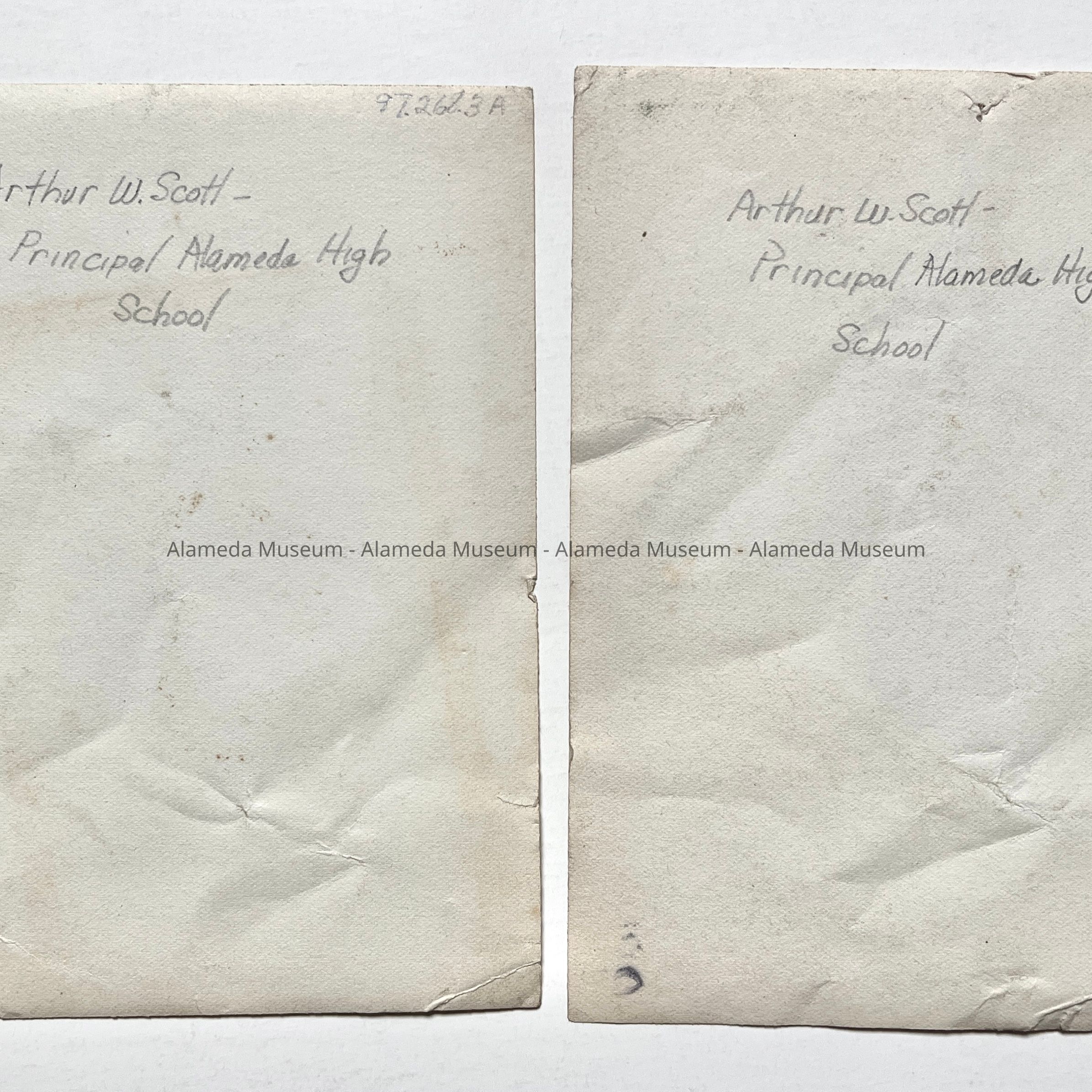 PHOTOGRAPHS OF ARTHUR W SCOTT, PRINCIPAL OF ALAMEDA HIGH SCHOOL. HE IS PICTURED STANDING IN THE YARD OF AN UNIDENTIFIED SCHOOL.